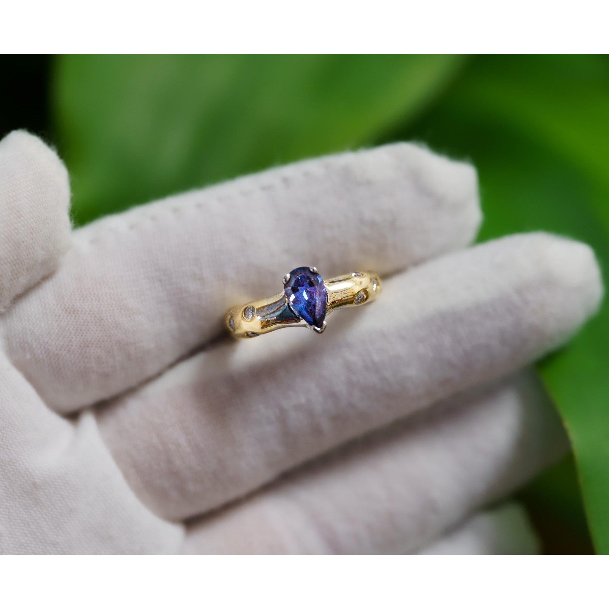 GIA certified 0.90 carat natural alexandrite ring with documented Brazilian origin and color change. 18K yellow gold statement ring set with a pear cut alexandrite and round cut diamond accents.