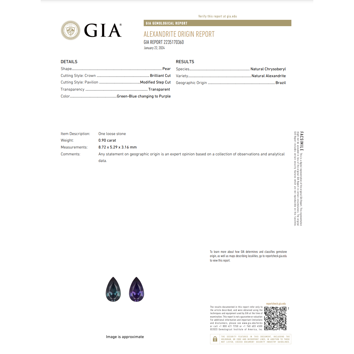 Accompanied by GIA report no. 5221986377 stating the alexandrite is natural chrysoberyl with Brazilian origin, color change from green blue to purple, transparent, pear brilliant cut, with origin updated.