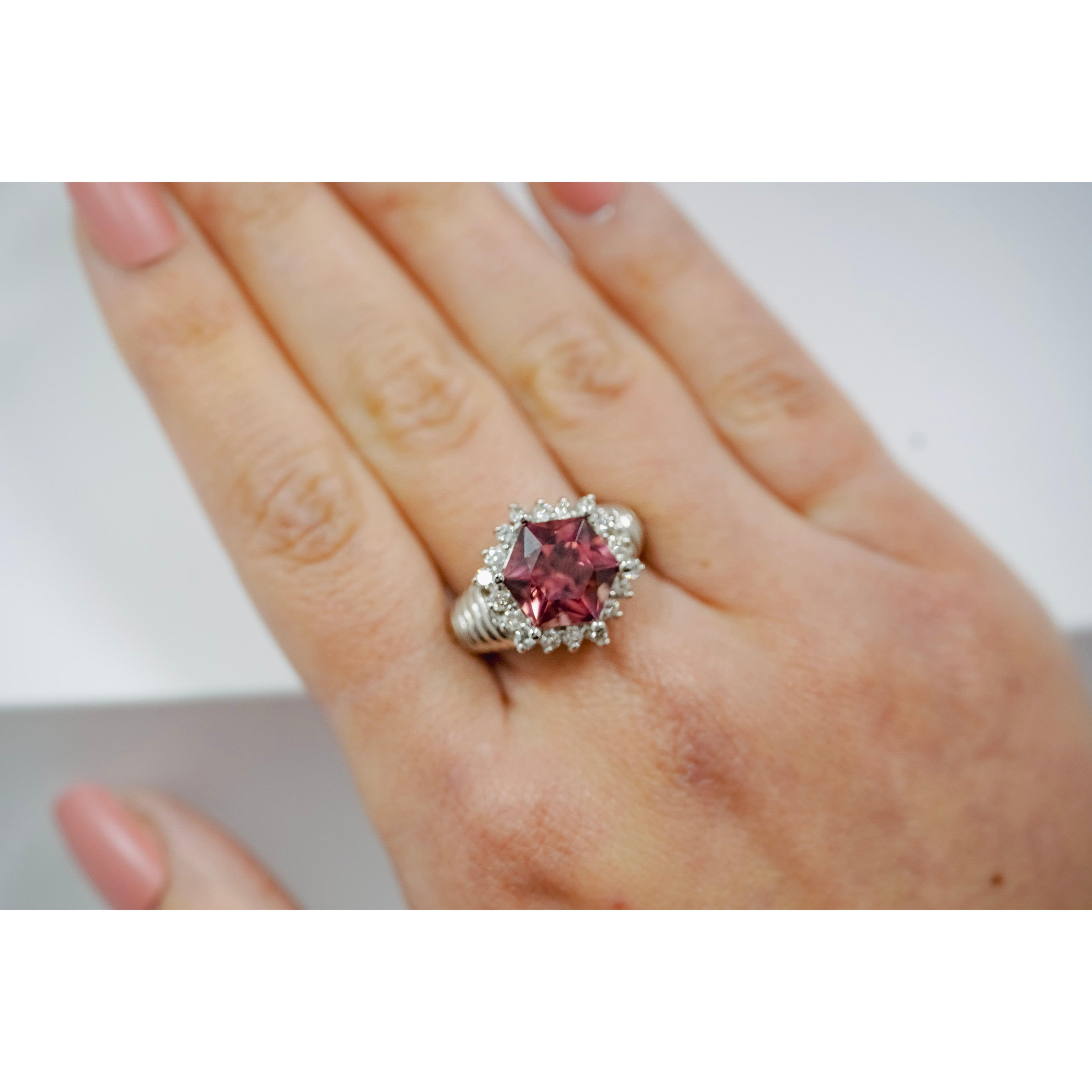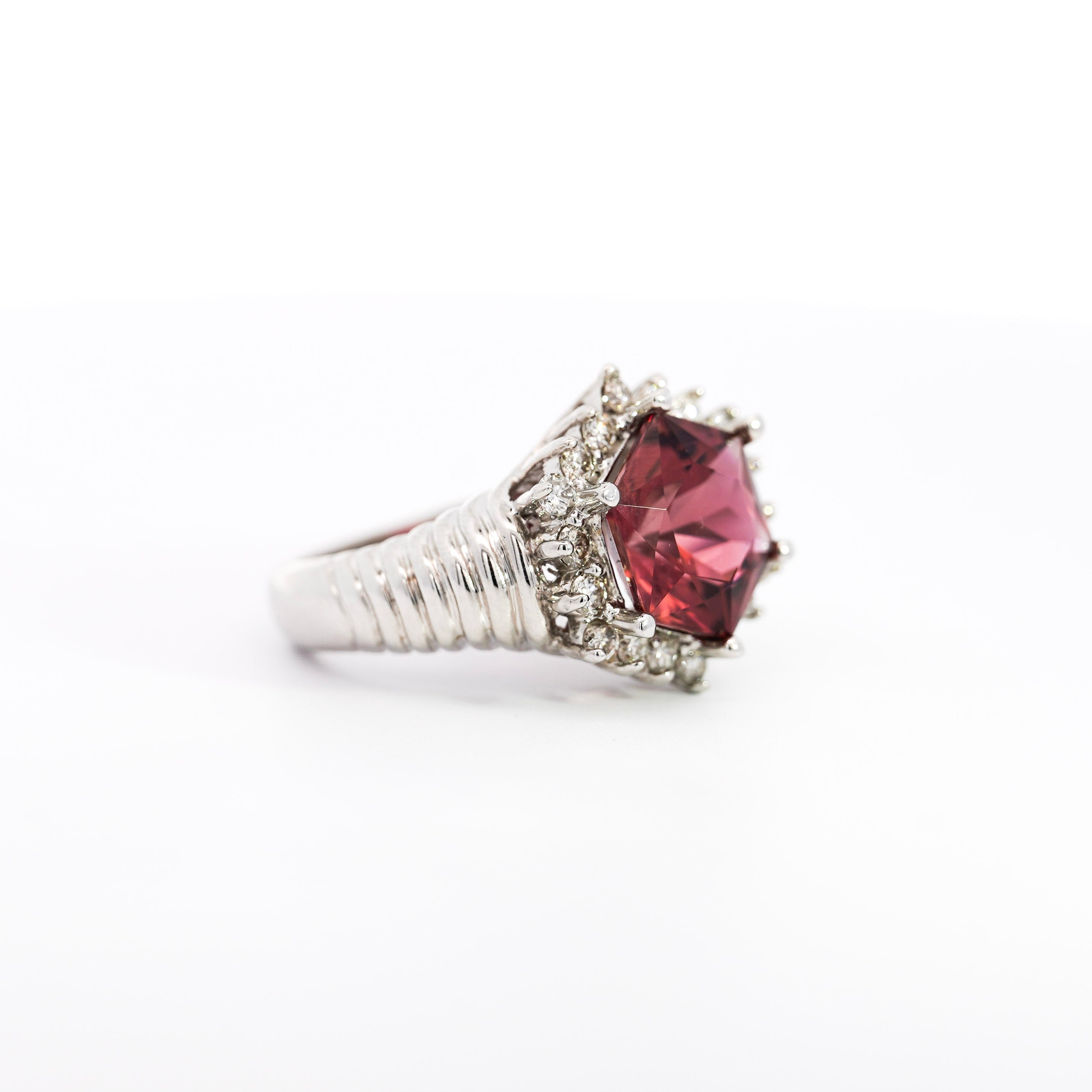 GIA certified natural pink tourmaline set in an 18K white gold diamond halo ring. This is a hexagonal cut pink tourmaline cocktail ring with round cut diamond accents and a ribbed shank design.