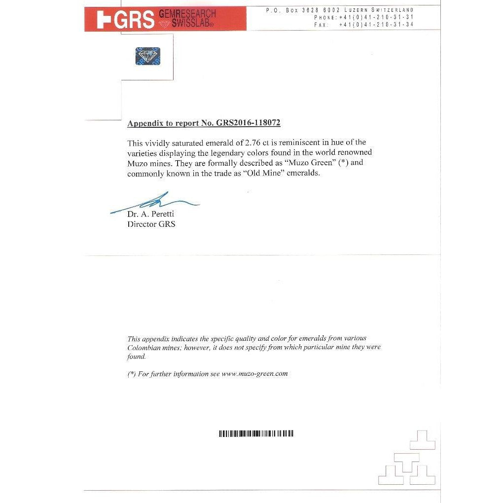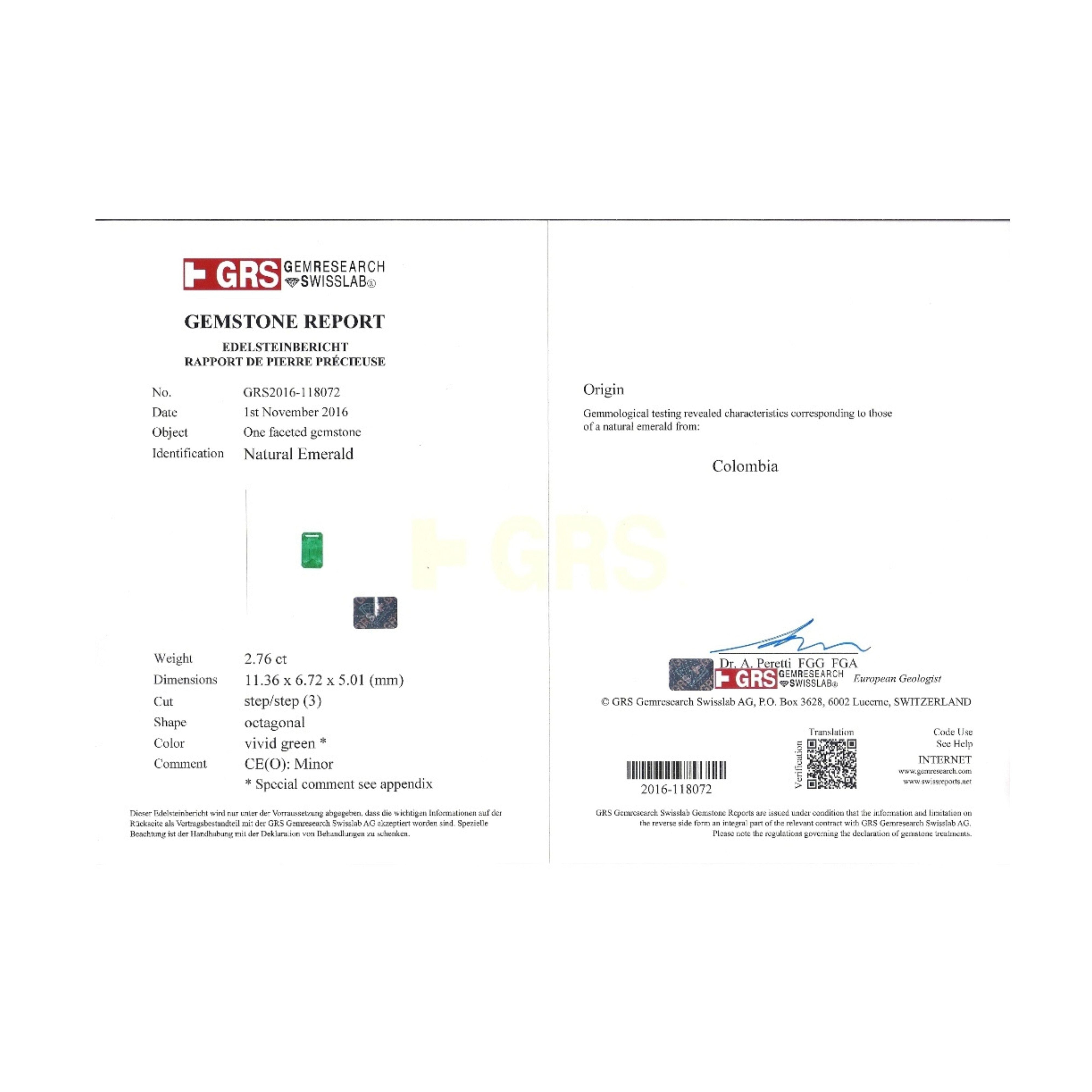 - Accompanied by GIA report no. 1268417679 and GRS report no. GRS2016-118072 stating the emerald is natural, Muzo Mine origin, vivid green color, octagonal cut, transparent, and with minor oil treatment