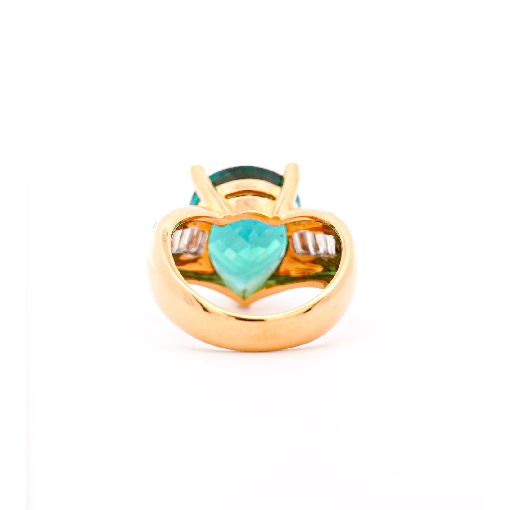 GIA Certified 11 carat bluish green tourmaline and white diamond ring in 18k yellow gold. Featuring a curved v-shaped ring... Read more