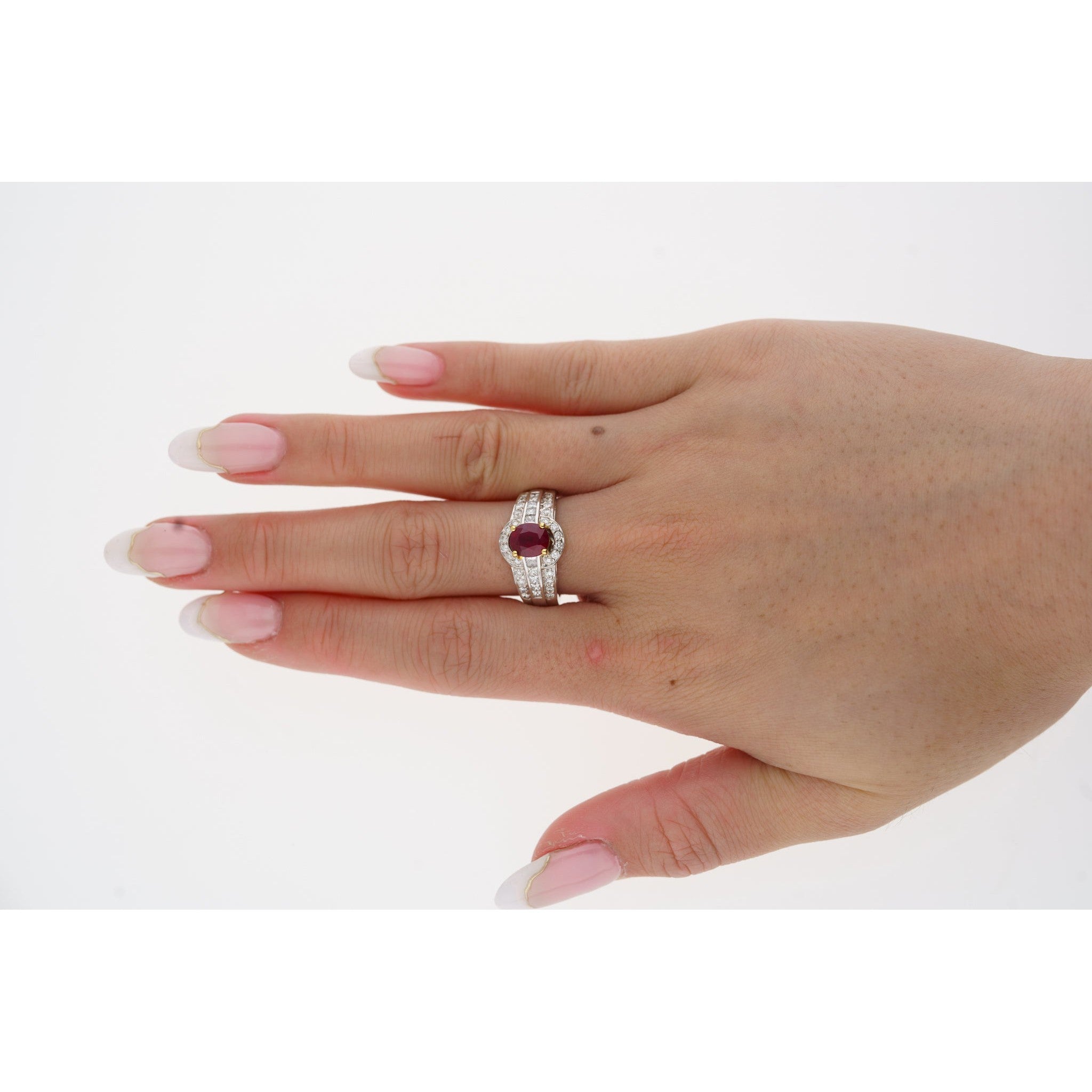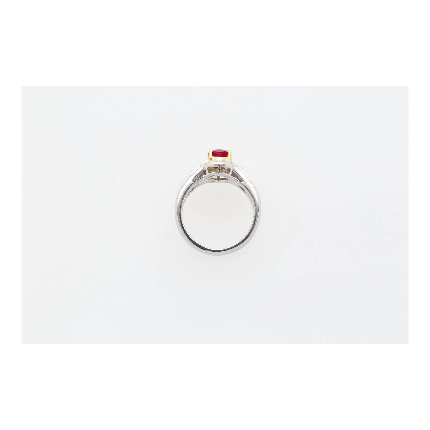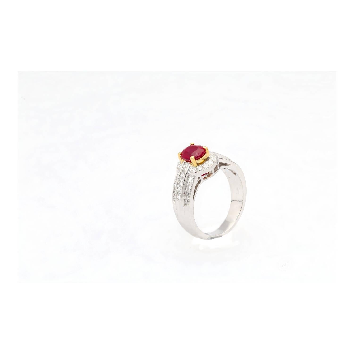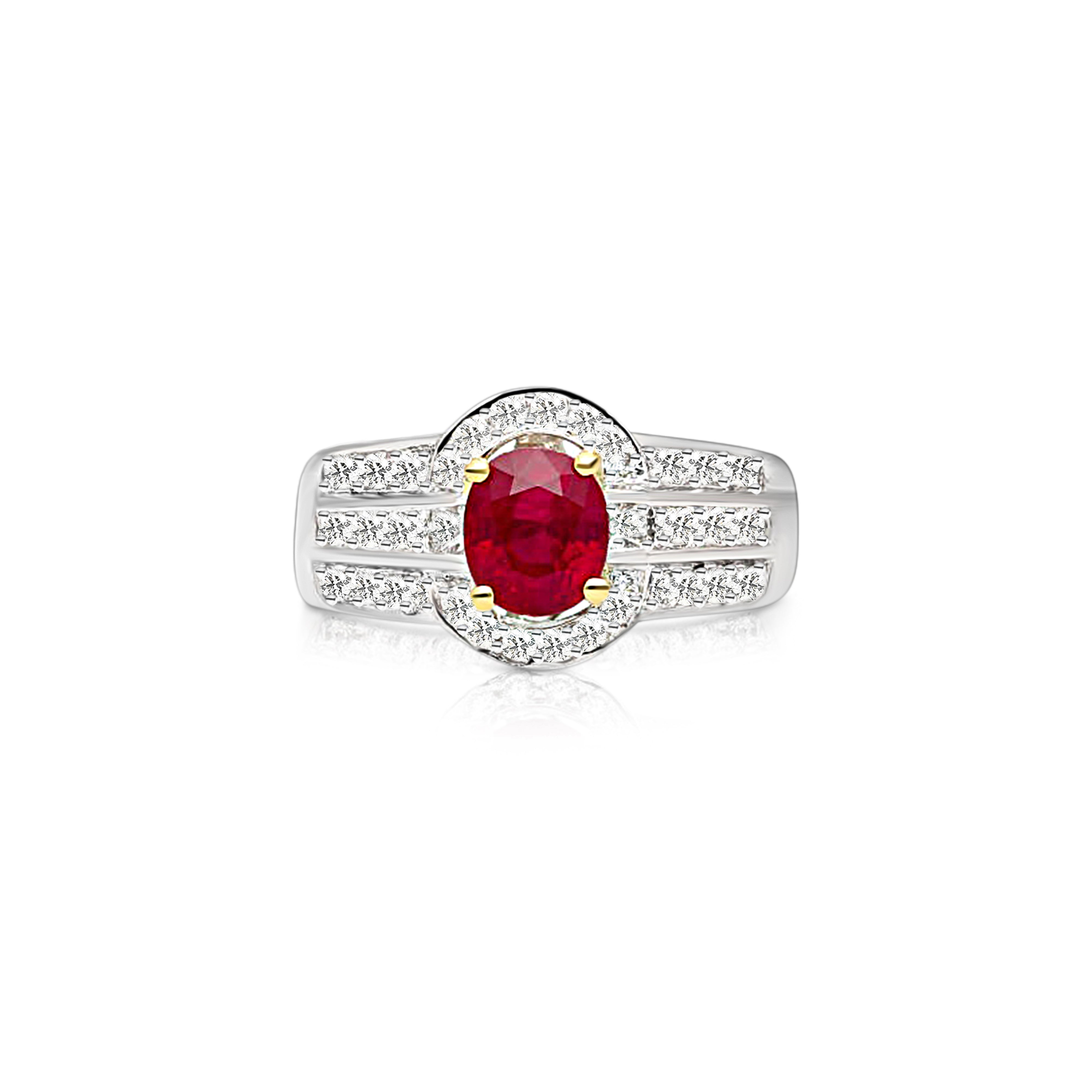 GRS certified 1.37 carat natural ruby ring with Burmese origin and pigeon blood red color. 18K gold ring with a prong set ruby and diamond cluster accents in a two tone white and yellow gold construction.