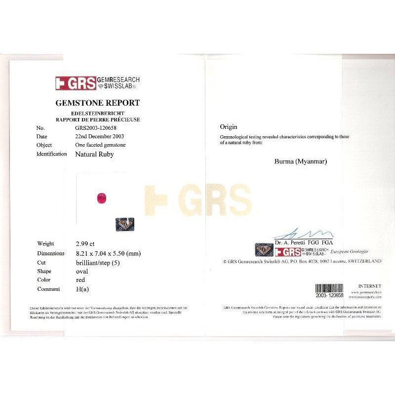 - Accompanied by GRS report no. 120658 stating the ruby is natural, oval cut, Burmese origin, red color, heated, weighing 2.99 carats
