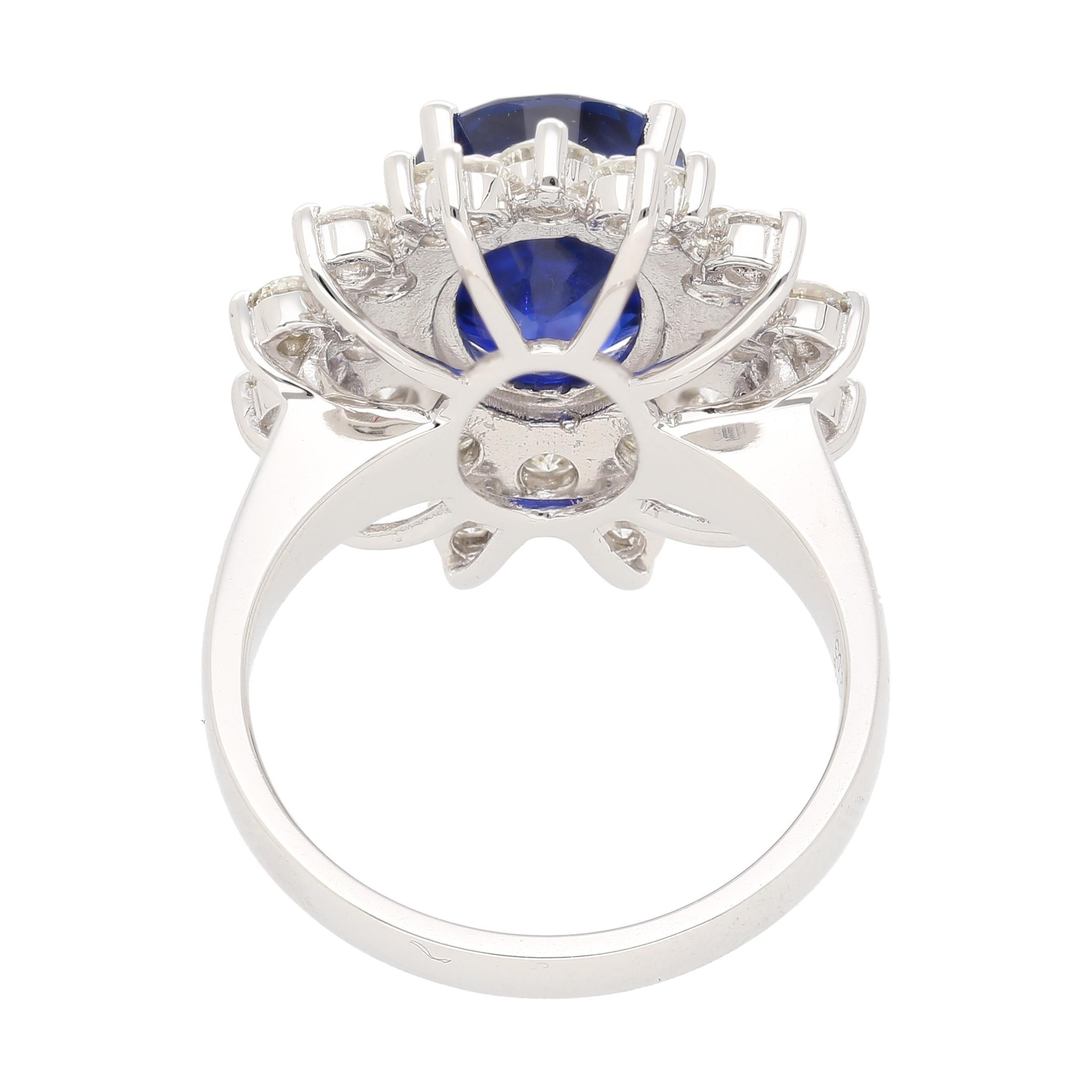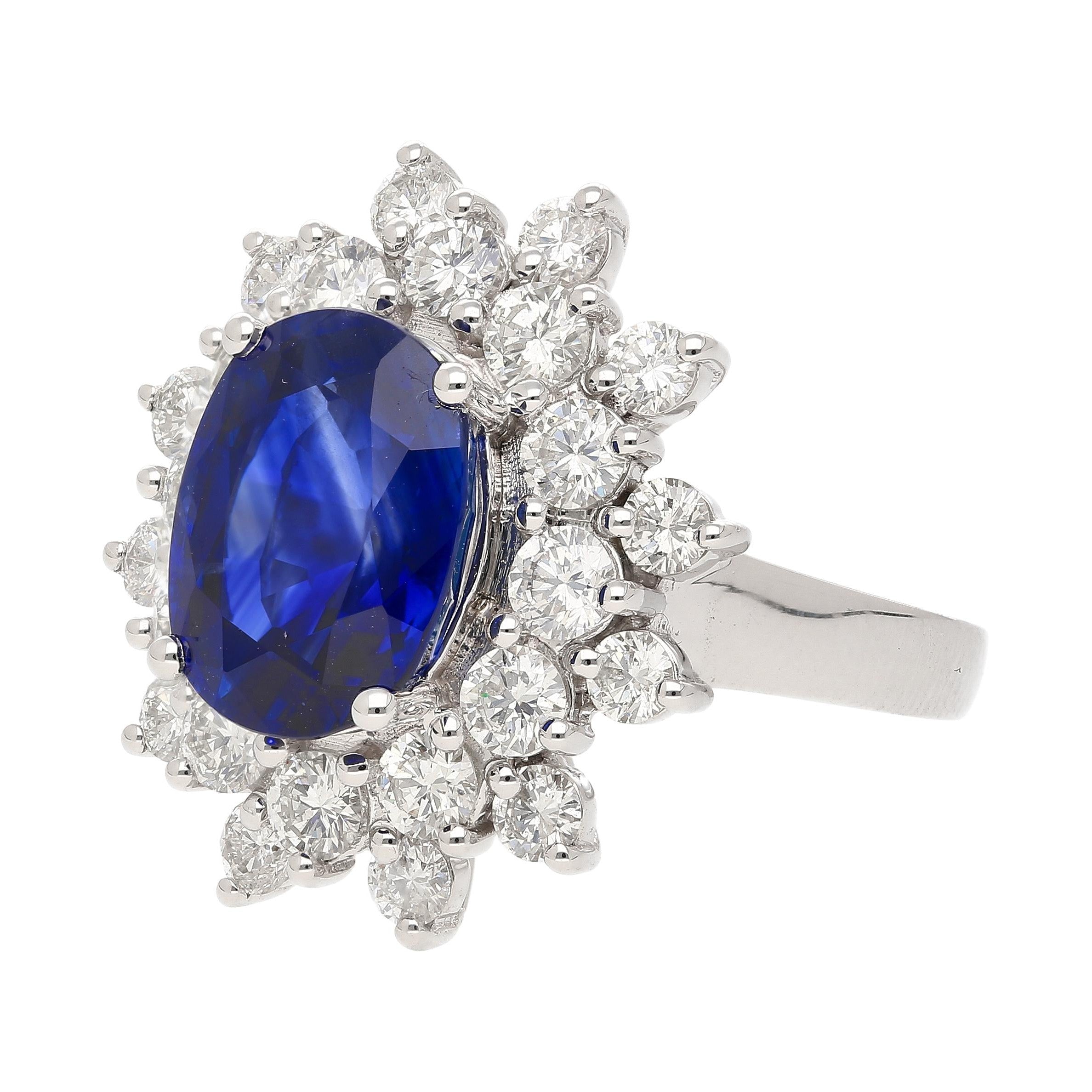 GRS certified 5.79 carat natural blue sapphire ring with Sri Lanka origin. 18K white gold ring set with an oval cut royal blue sapphire and round brilliant diamond halo in a star motif design.