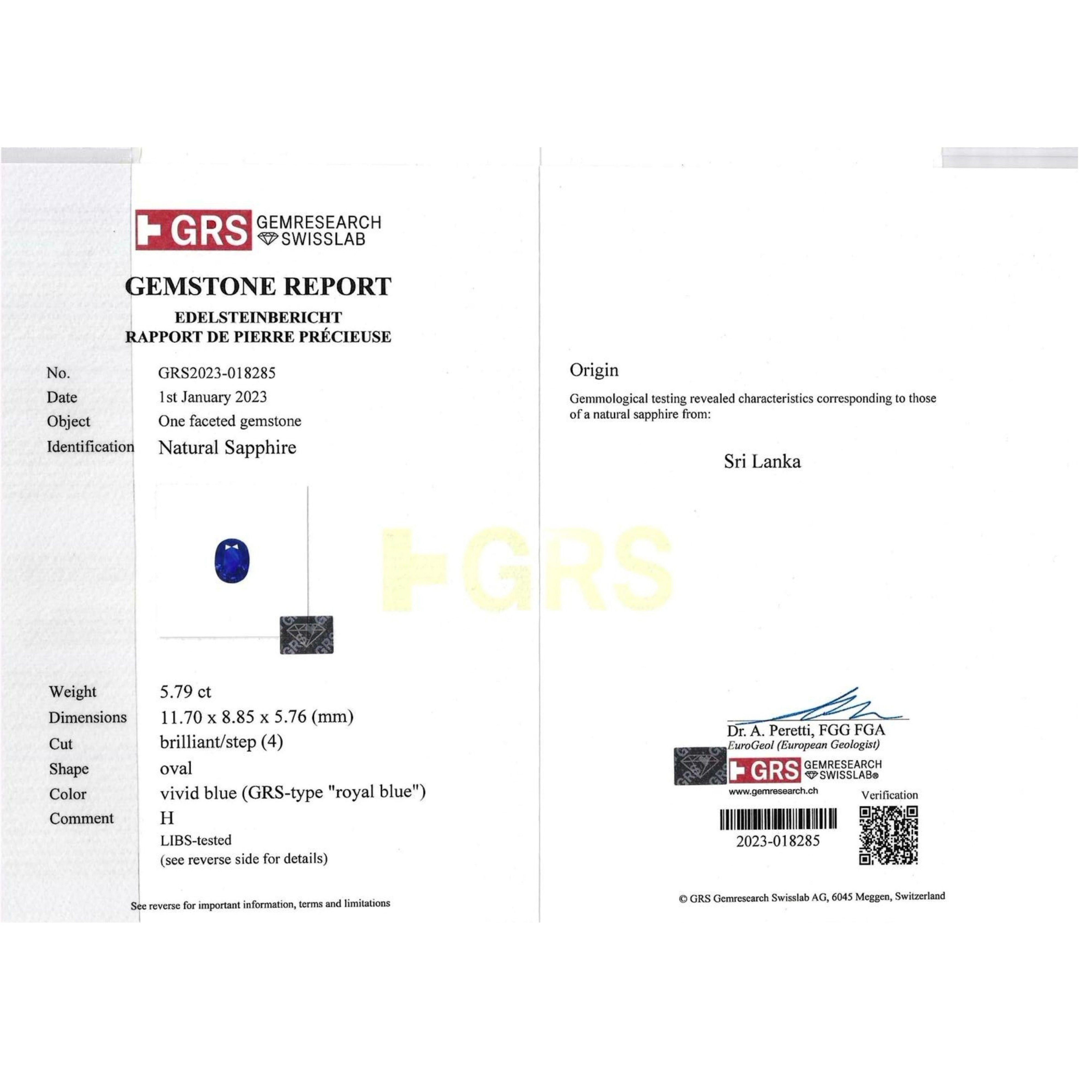 Accompanied by GRS report no. GRS2023-018285 stating the sapphire is natural, oval cut, Sri Lanka origin, vivid blue royal blue color grade, heated, with listed measurements and carat weight.