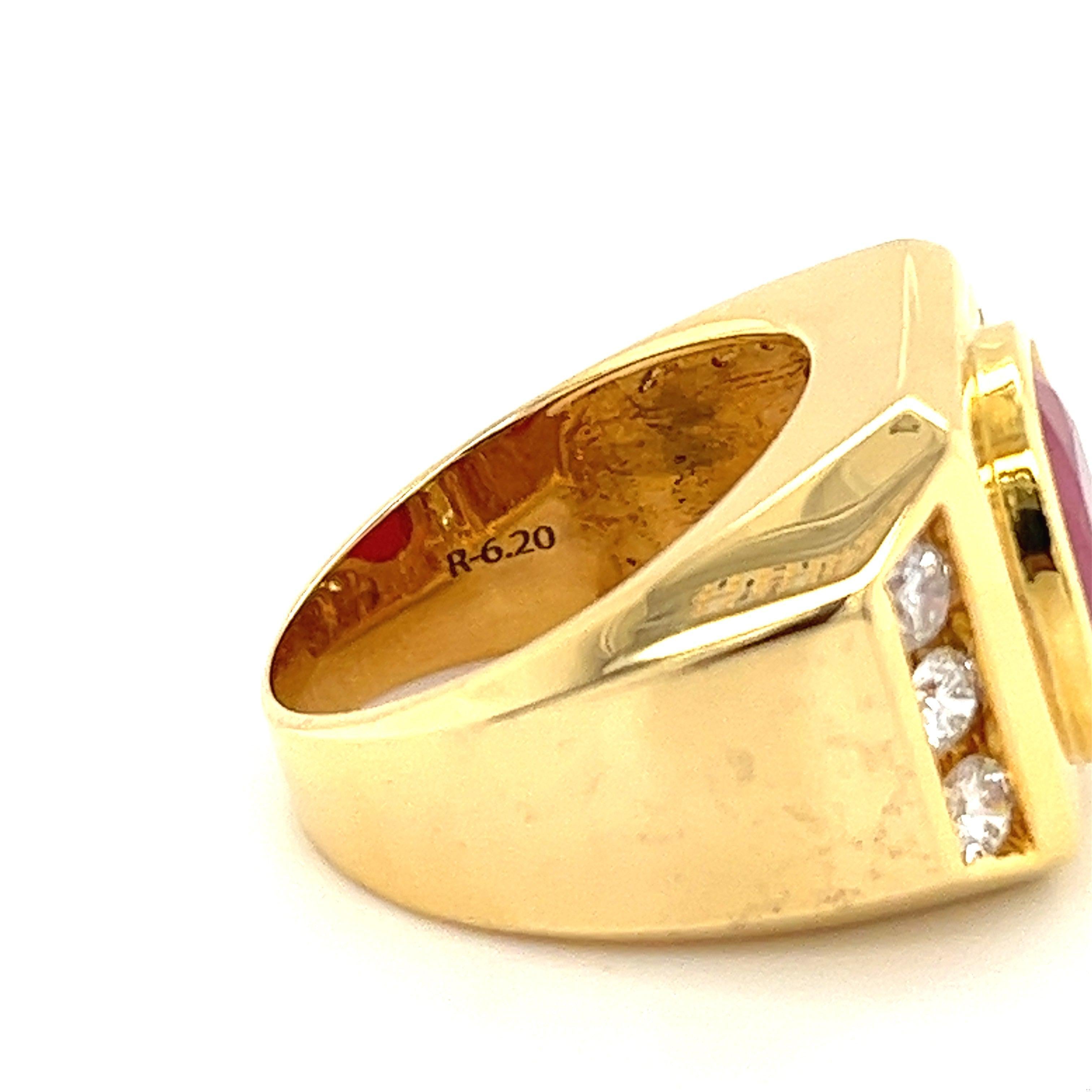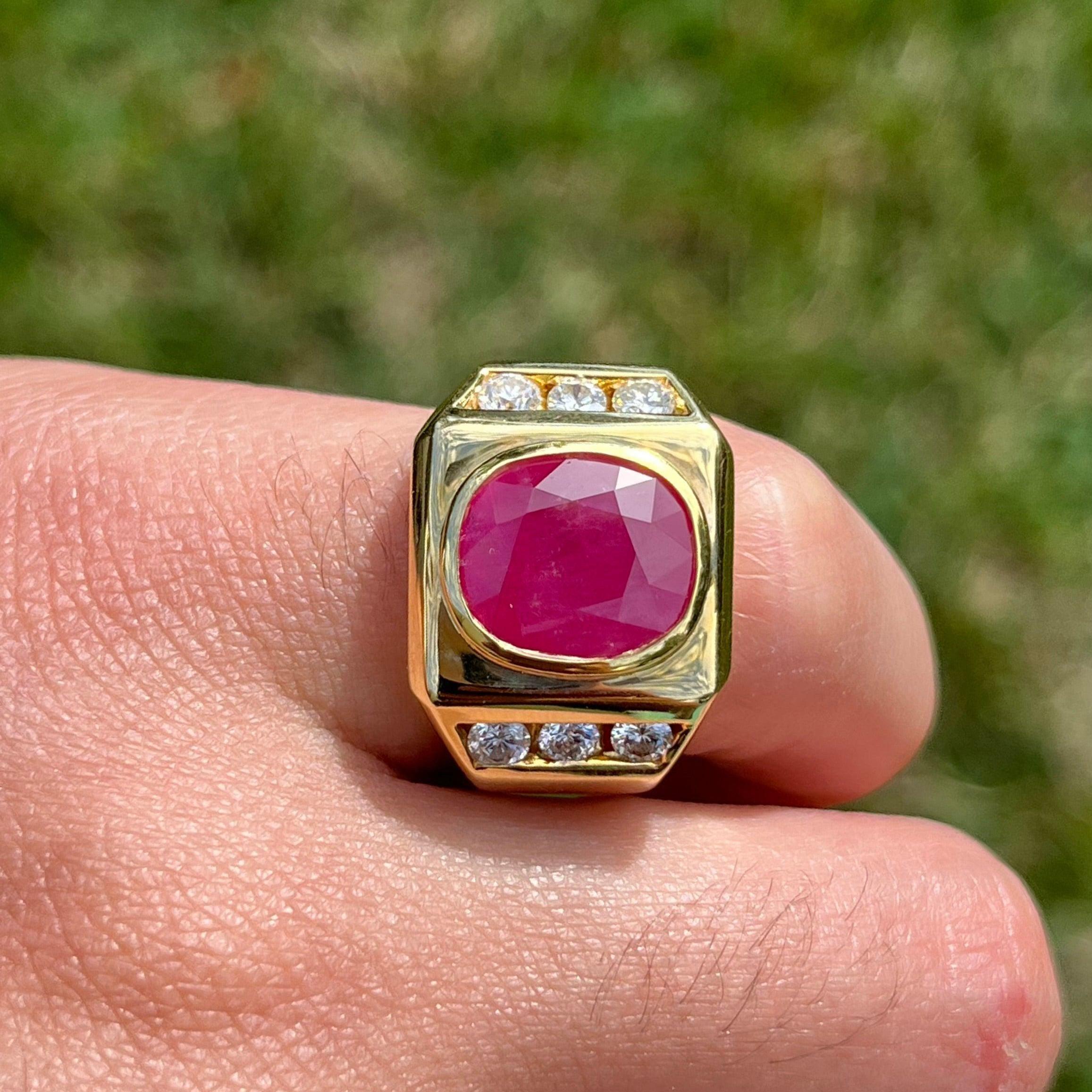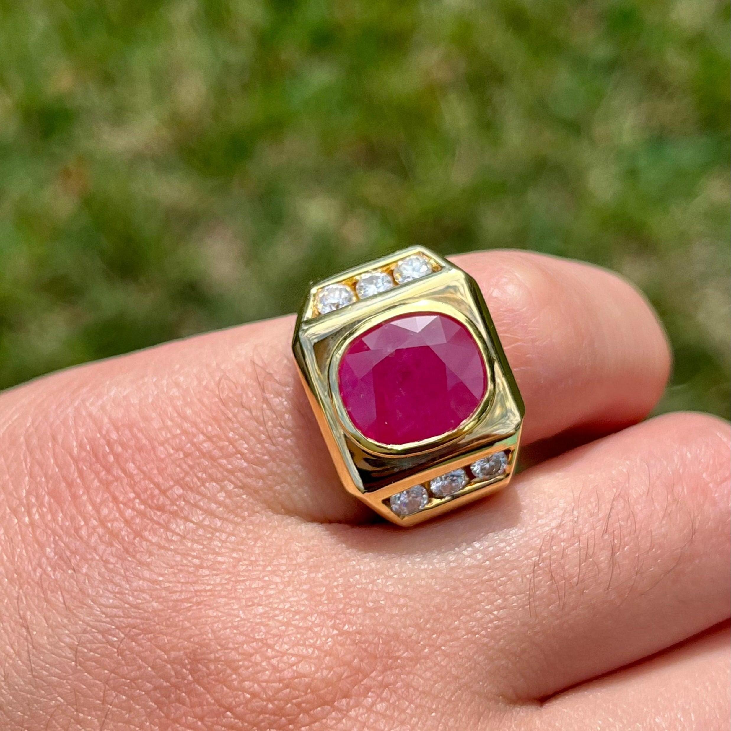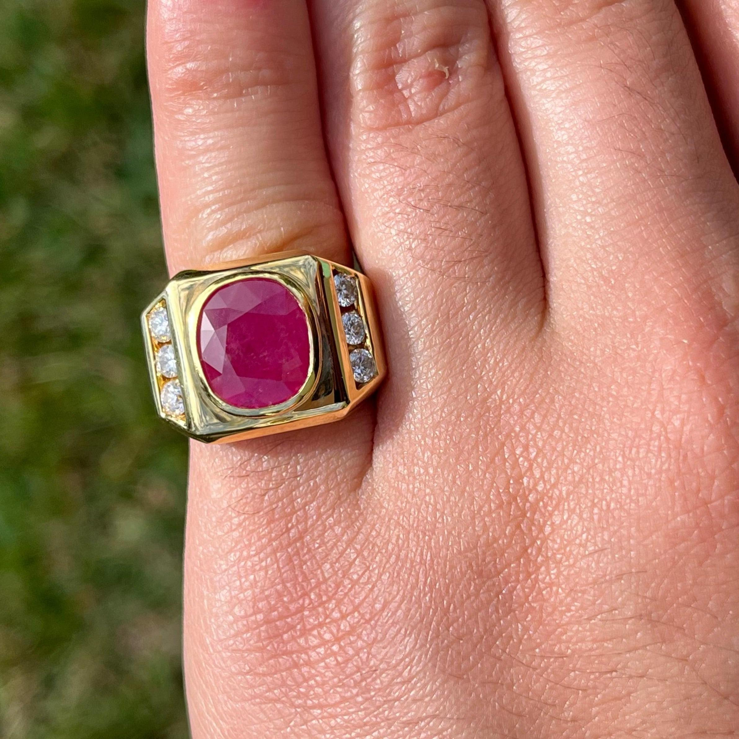 This vintage 14K solid gold Ruby gypsy style men's ring features a 6.20 Carat GRS Certified Oval Ruby with H(b) treatment. The bezel set ruby is surrounded by high-quality diamonds, totaling approximately 1.00 Carat. Set in a strong 14K gold band, this ring is not only a statement piece but also ideal for daily wear due to its durability. The GRS Certified Ruby from Sri Lanka, with a brilliant/step (4) cut, adds a refined yet bold element to this classic men's ring.