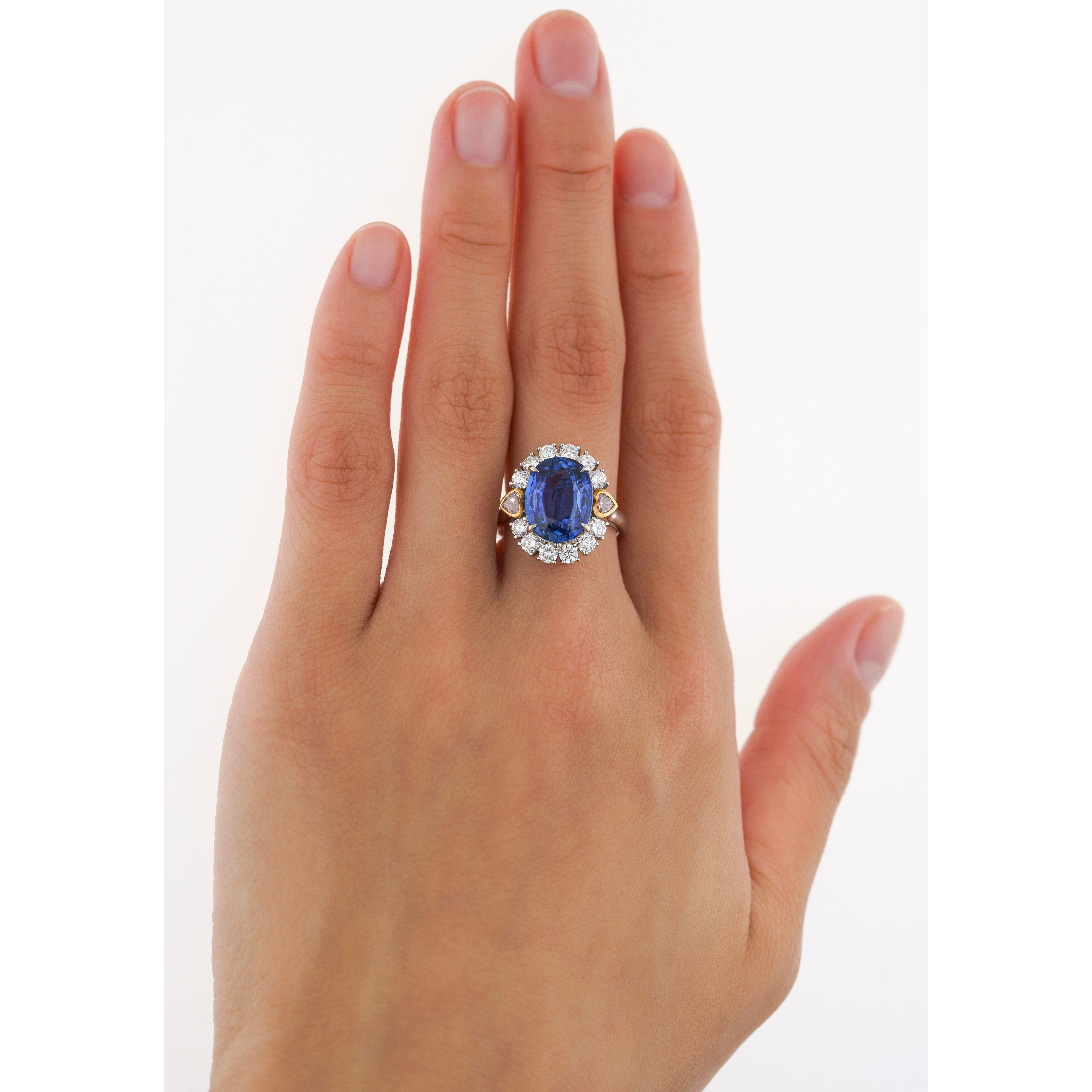 GRS certified 7.25 carat no-heat Sri Lanka blue sapphire set in 18K white gold ring. Oval brilliant cut blue sapphire with heart cut pink diamond and round white diamond accents in Art Deco design.