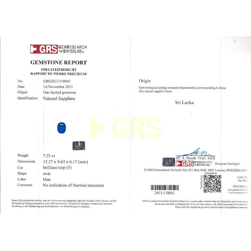 - Accompanied by GRS certificate no. GRS2013-118062 confirming natural sapphire, Sri Lanka origin, blue color, no heat treatment