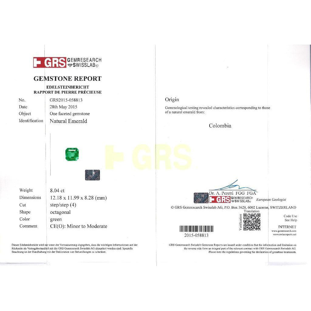 - Accompanied by GRS report no. 058813 stating the emerald is natural, Colombian origin, octagonal cut, green color, and treated with minor to moderate oil