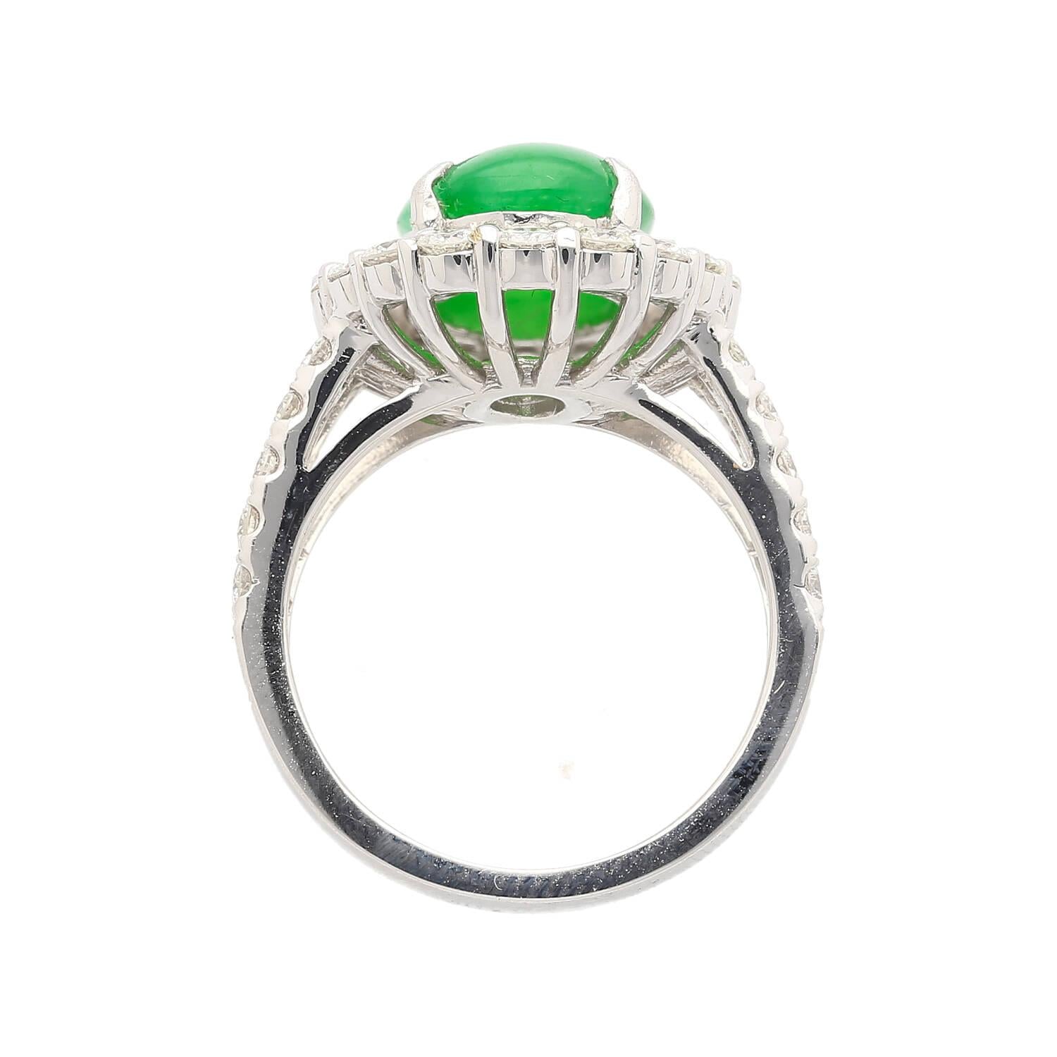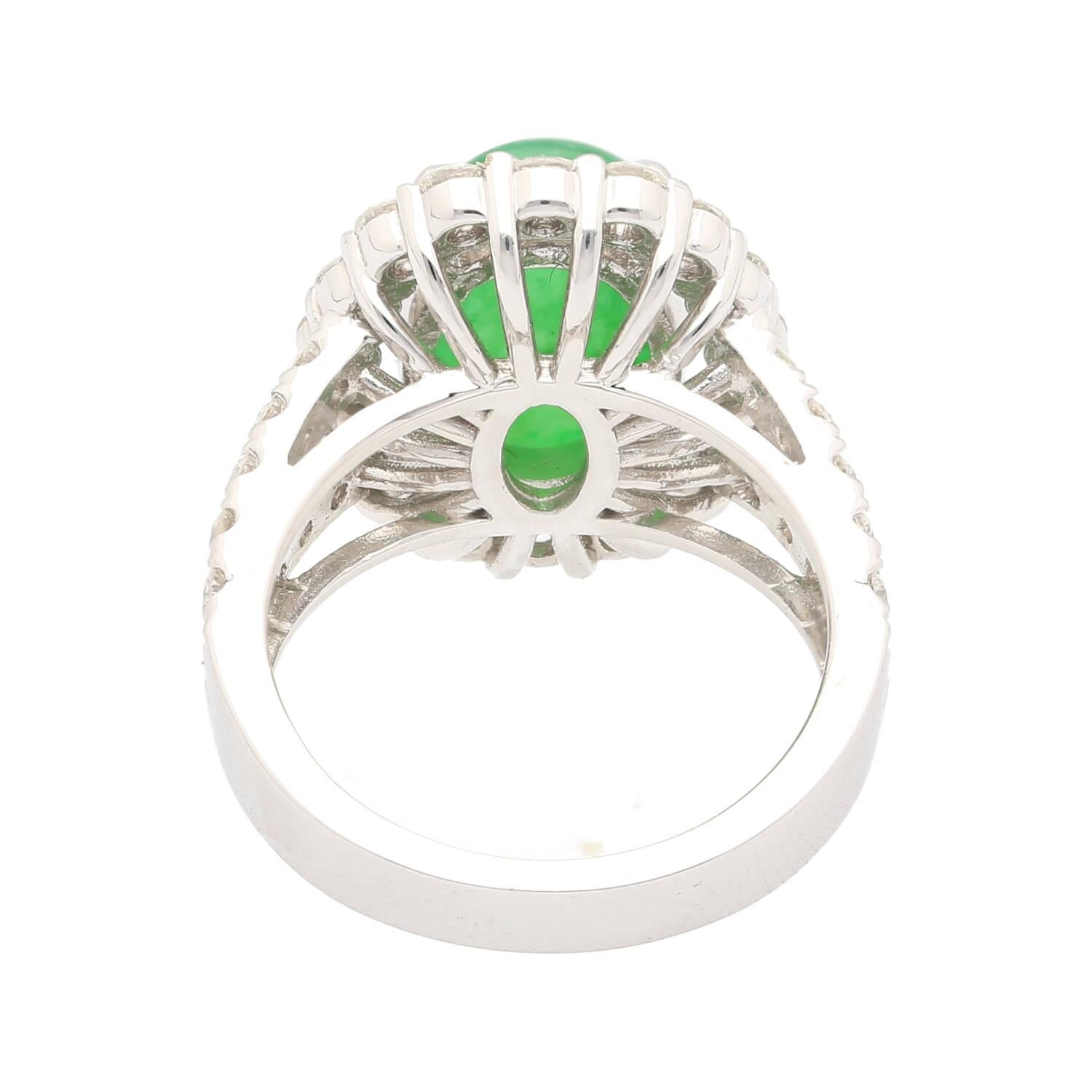 Hong Kong Jade and Stone Laboratory certified 5.329 carat natural jade set in an 18K white gold diamond halo ring. This is an oval cut green jade cocktail ring with round cut diamond halo and split shank accents.