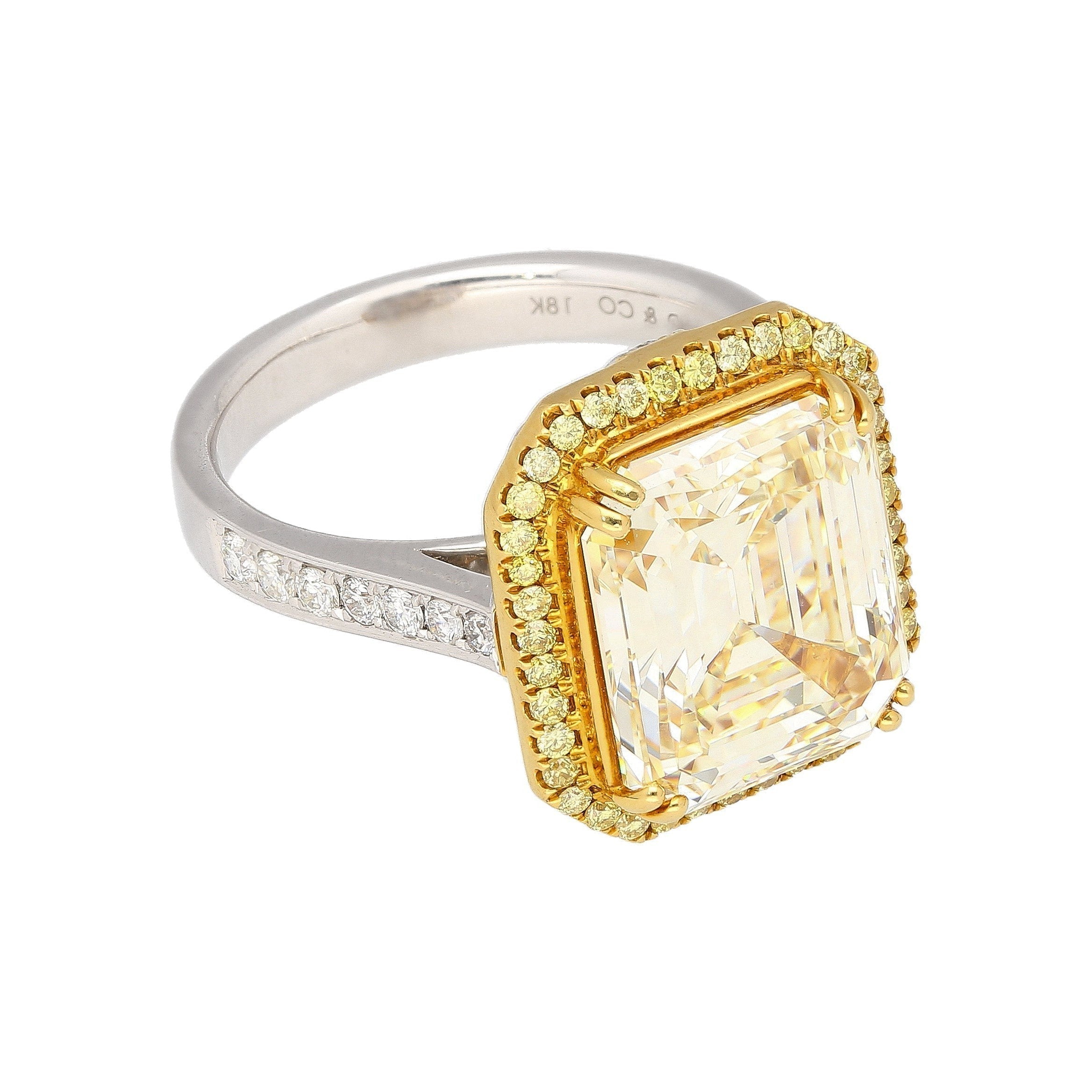 IGI certified 7.25 carat fancy light yellow diamond set in 18K white and yellow gold ring. Emerald cut fancy light... Read more