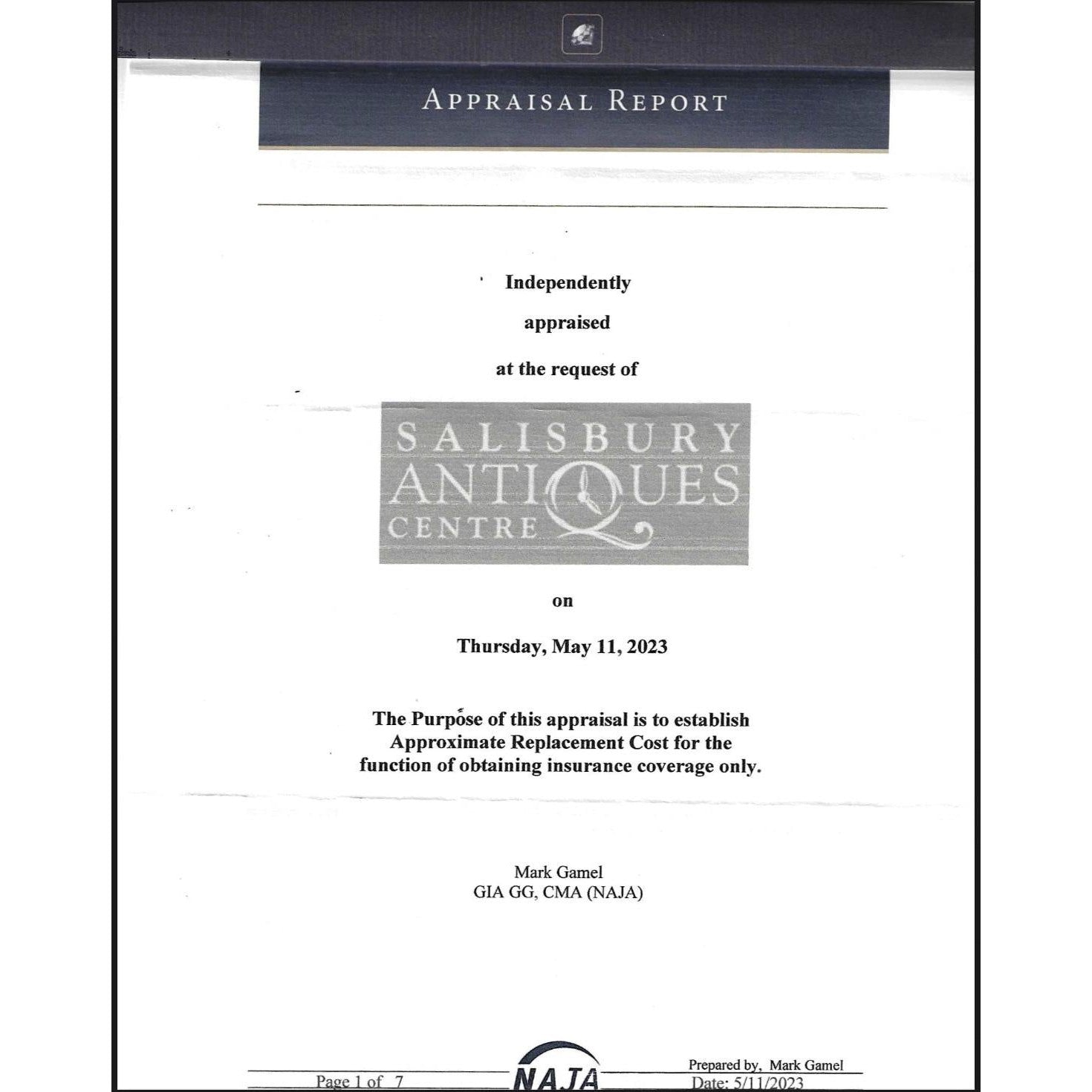 Accompanied by certification and appraisal from Salisbury Antiques Center stating the diamond is natural, round brilliant cut, H color, SI1 clarity, with listed measurements and carat weight.