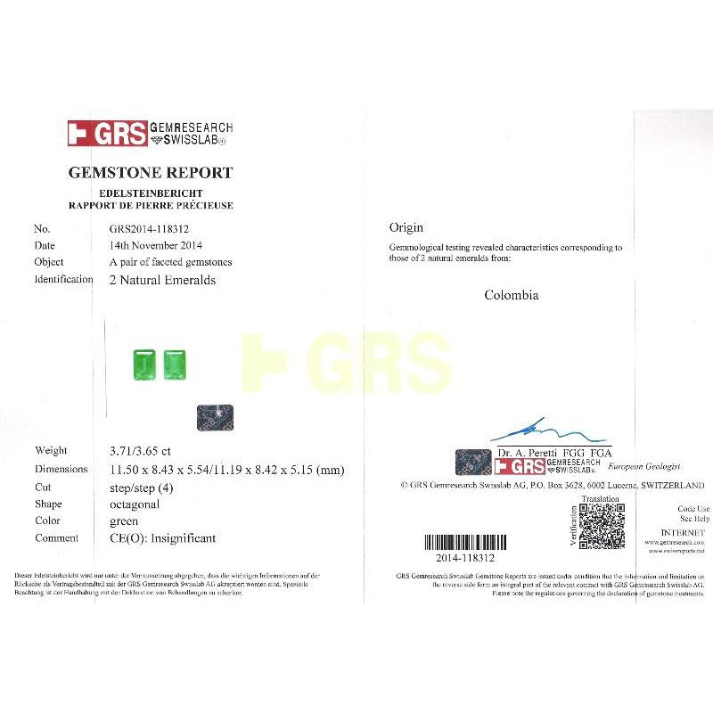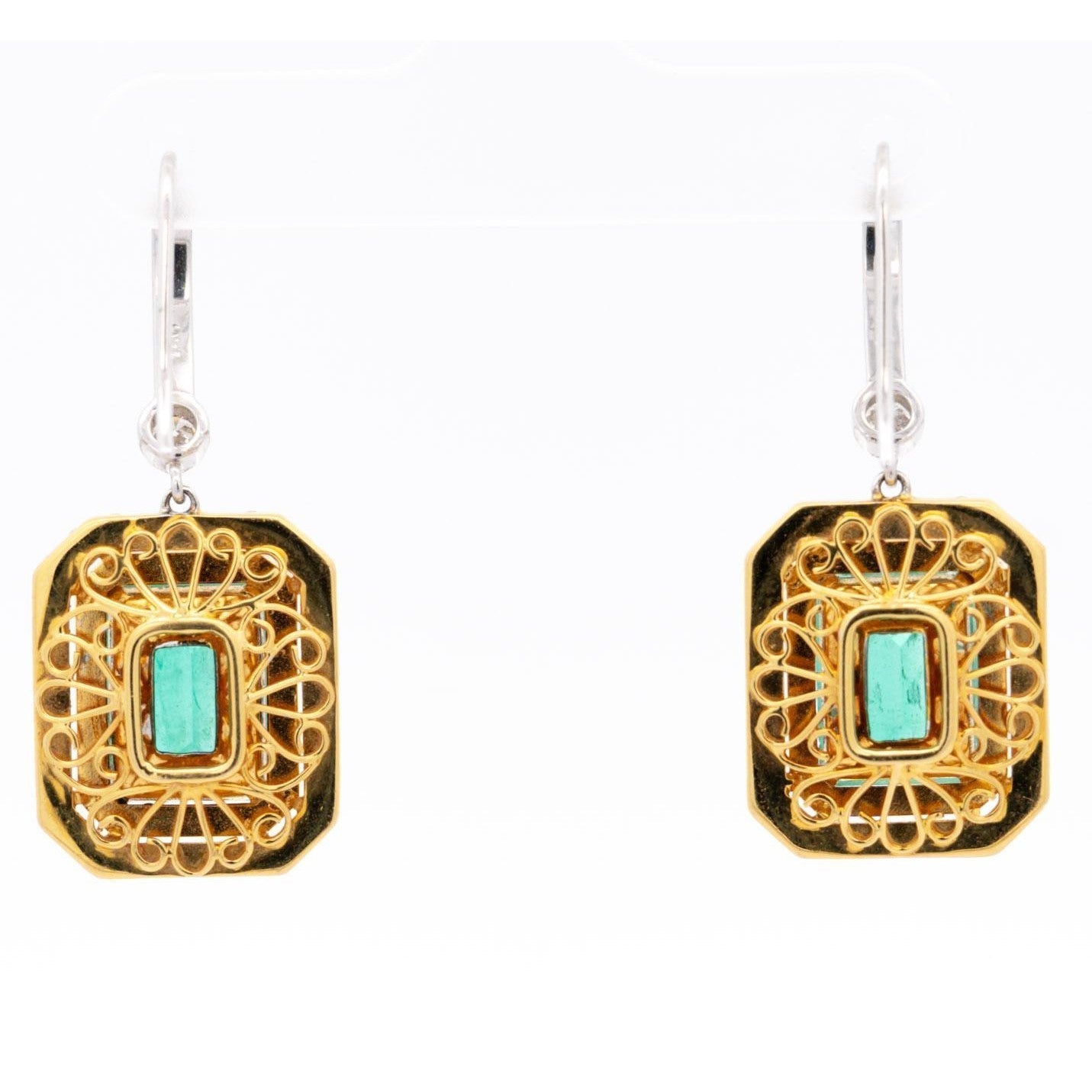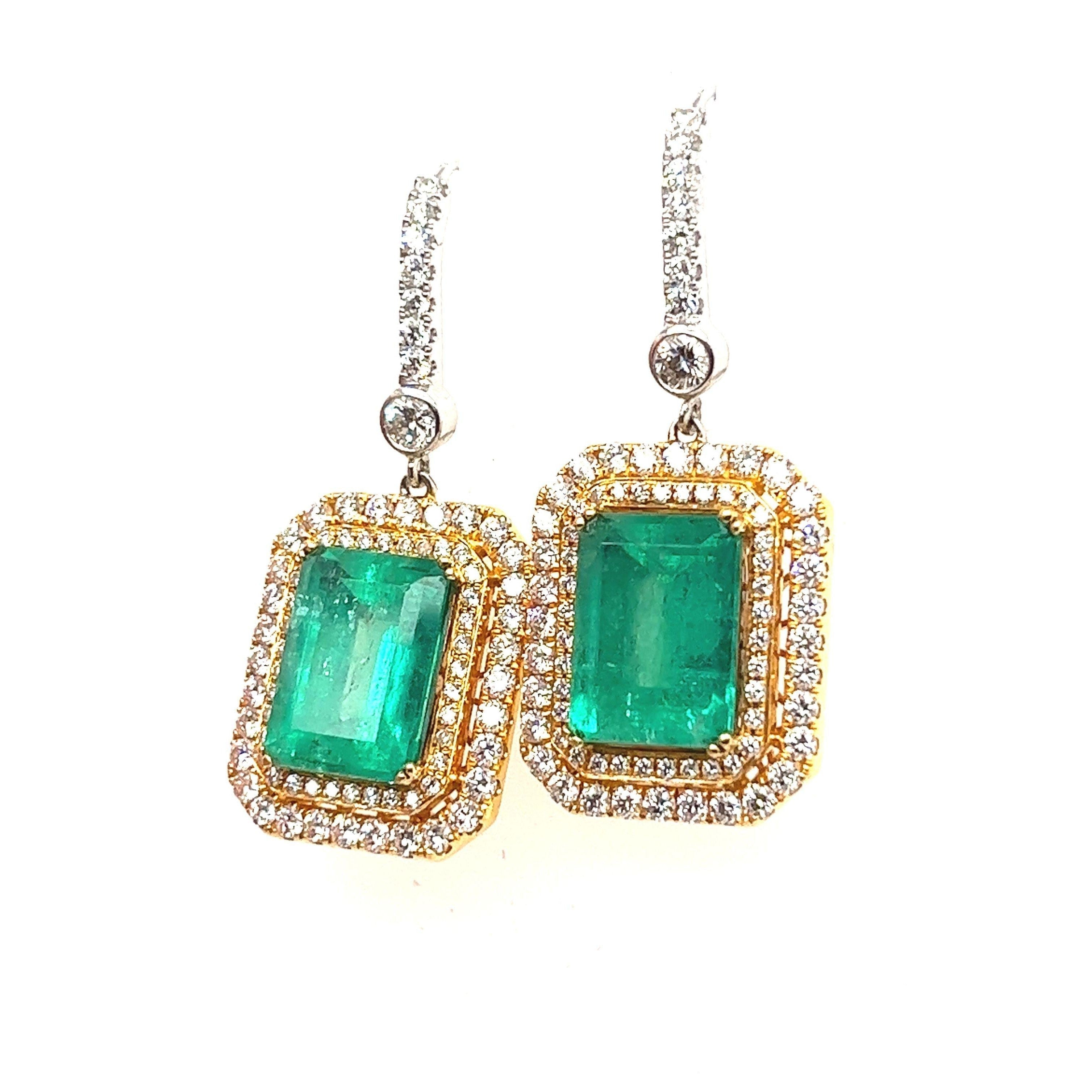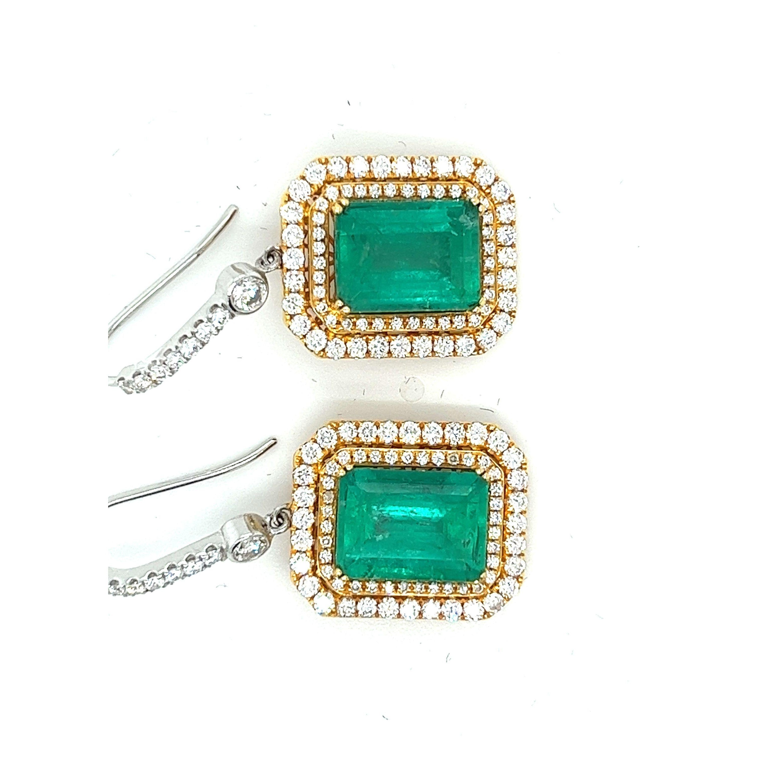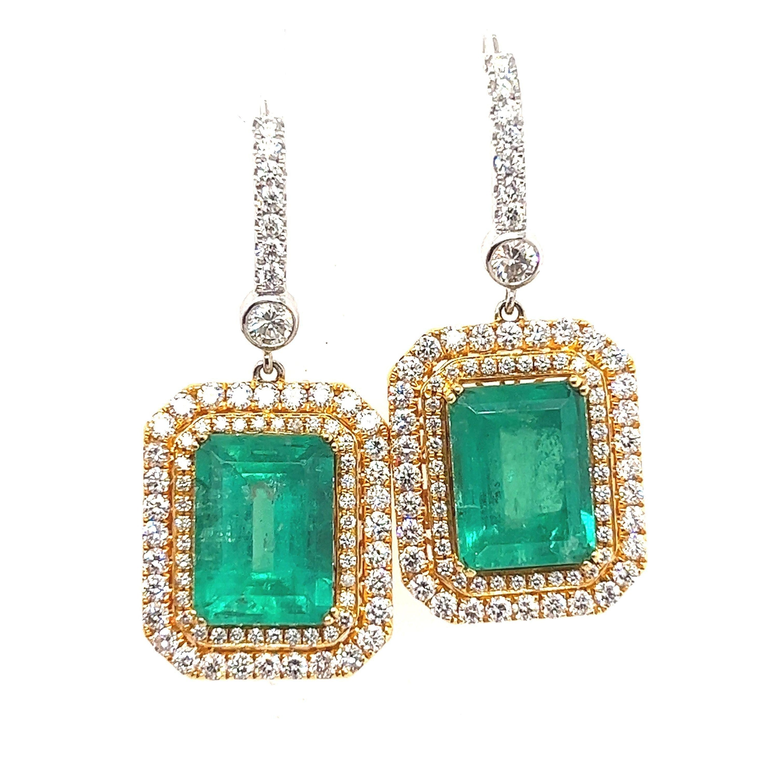 7.36 Carat Colombian Emerald Octagonal Cut Diamond Double Halo Dangle Earrings