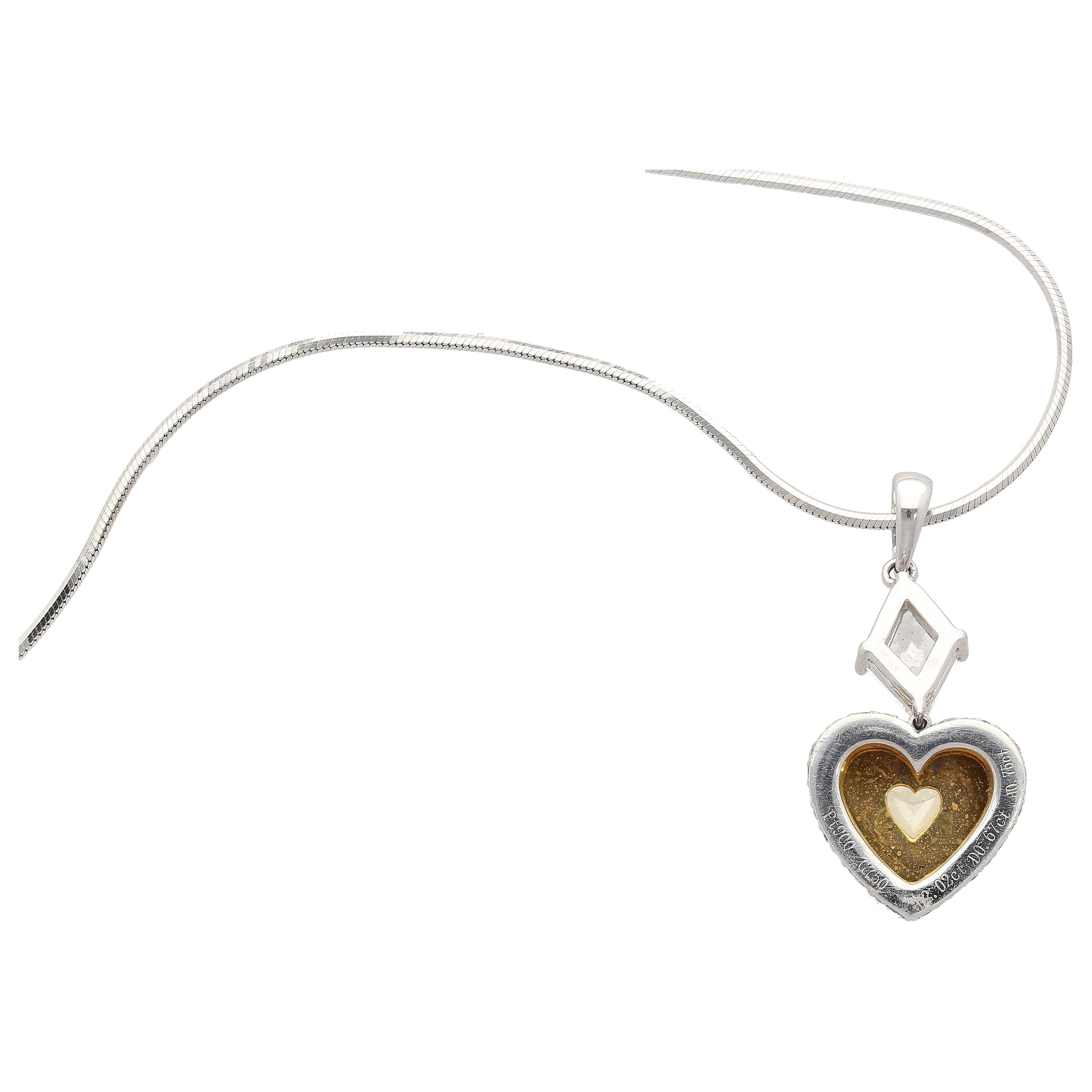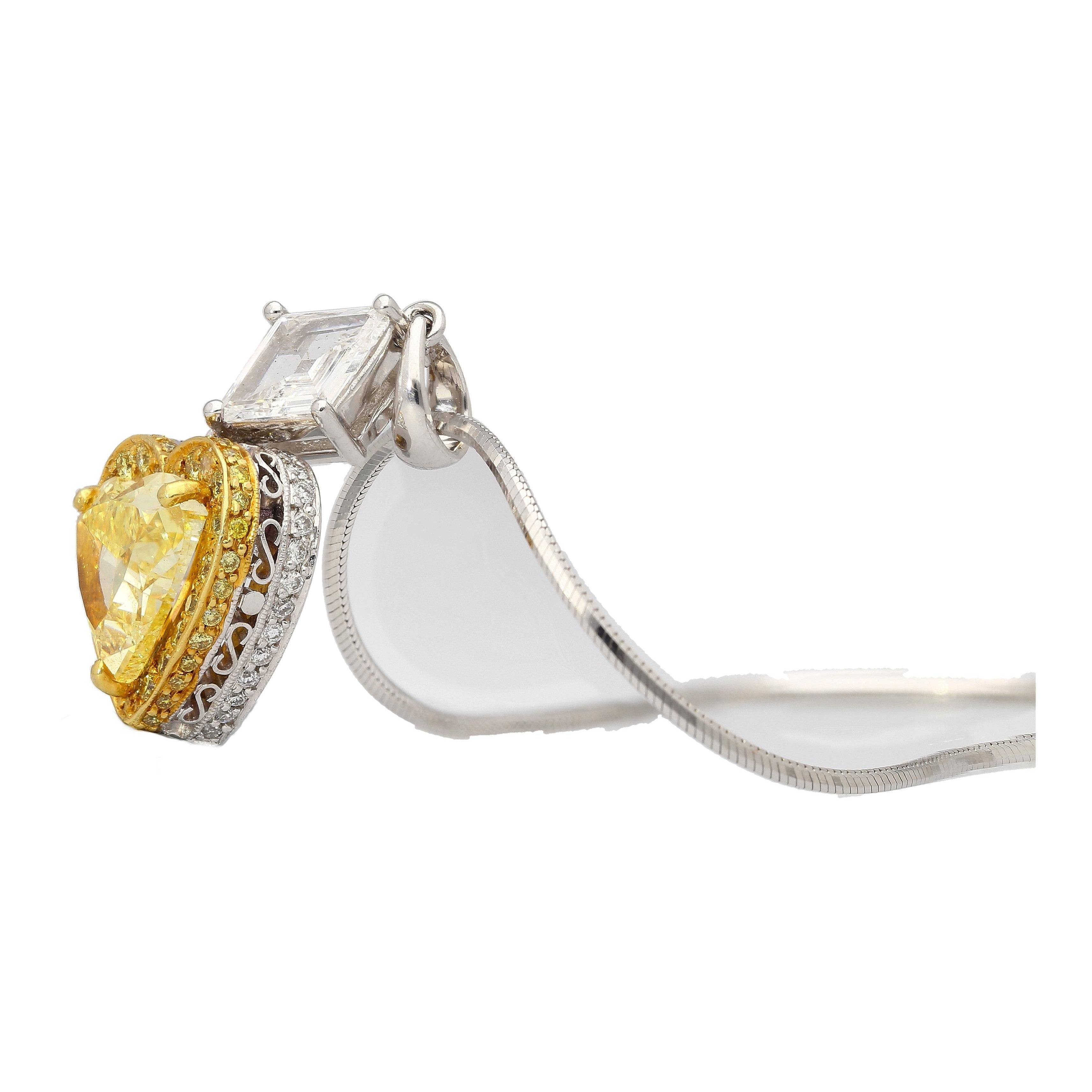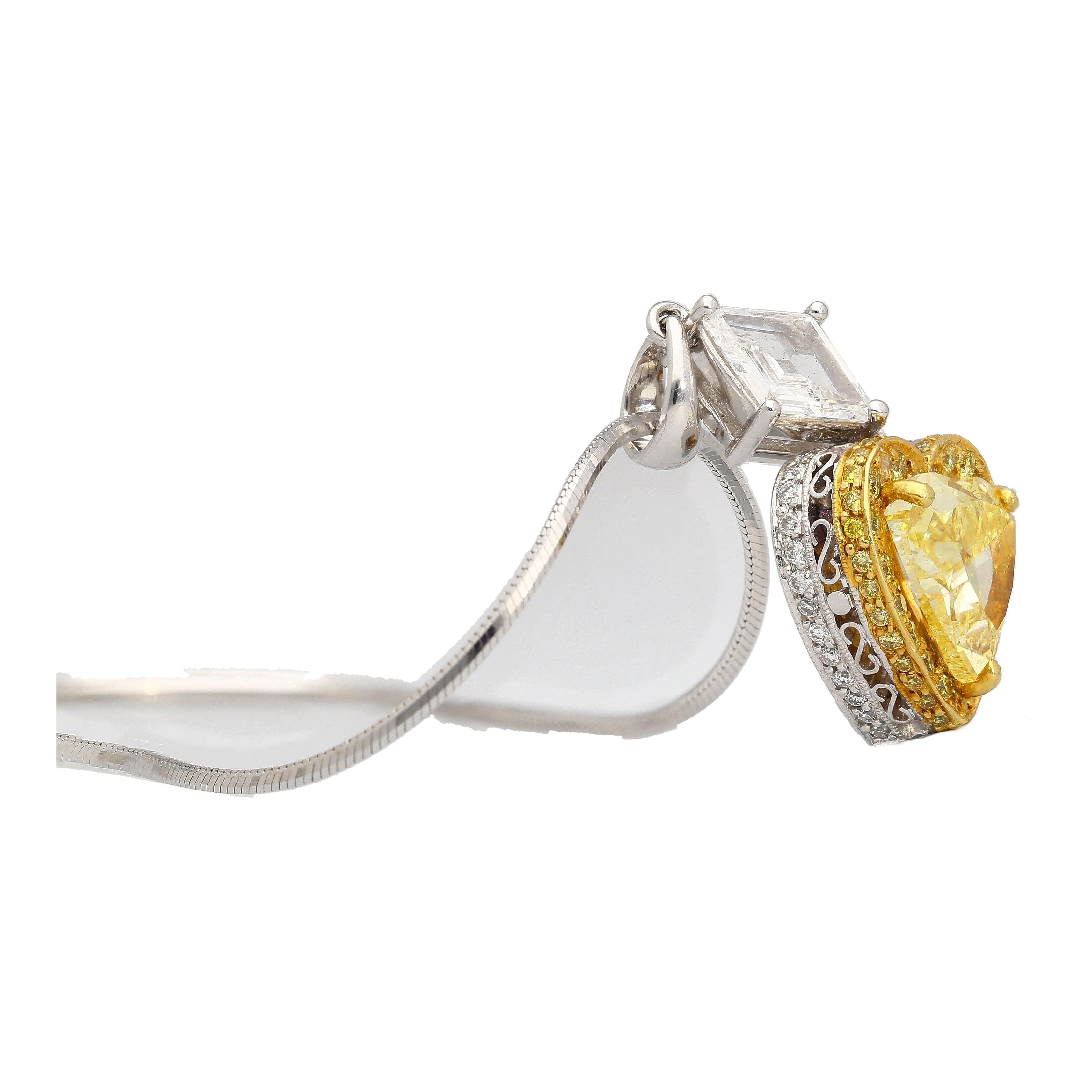 This pendant necklace features a natural fancy yellow 2.02 carat heart-shaped diamond center stone, secured in a prong setting. The heart-shaped yellow diamond is GIA-certified. This yellow diamond center is paired with an additional 50 yellow round-cut diamonds totaling 0.75 carats and 50 round-cut white diamonds. The pendant also features a lozenge-cut white diamond at the top of the pendant, weighing 0.75 carats. Set in platinum.