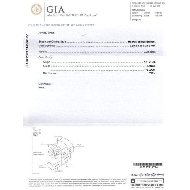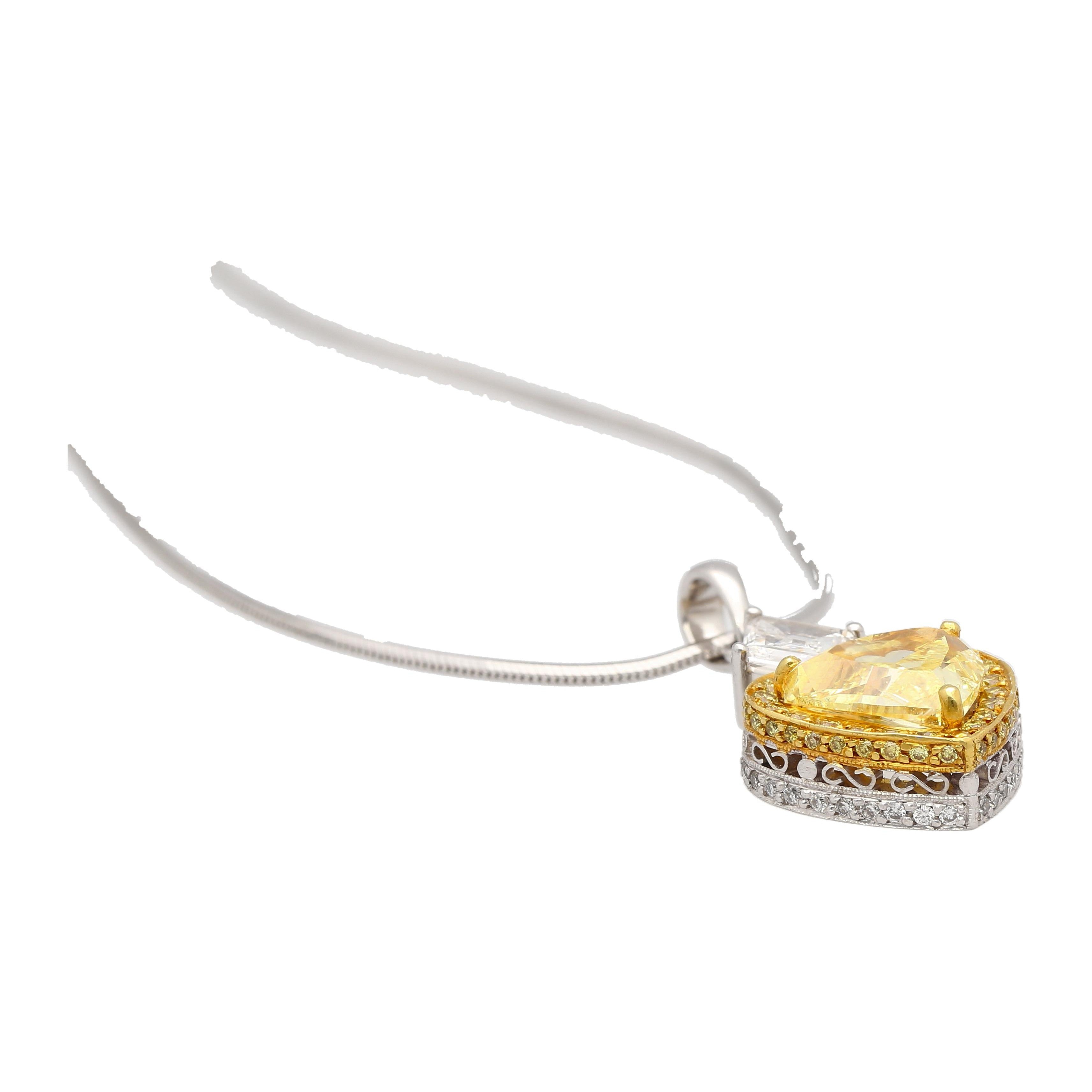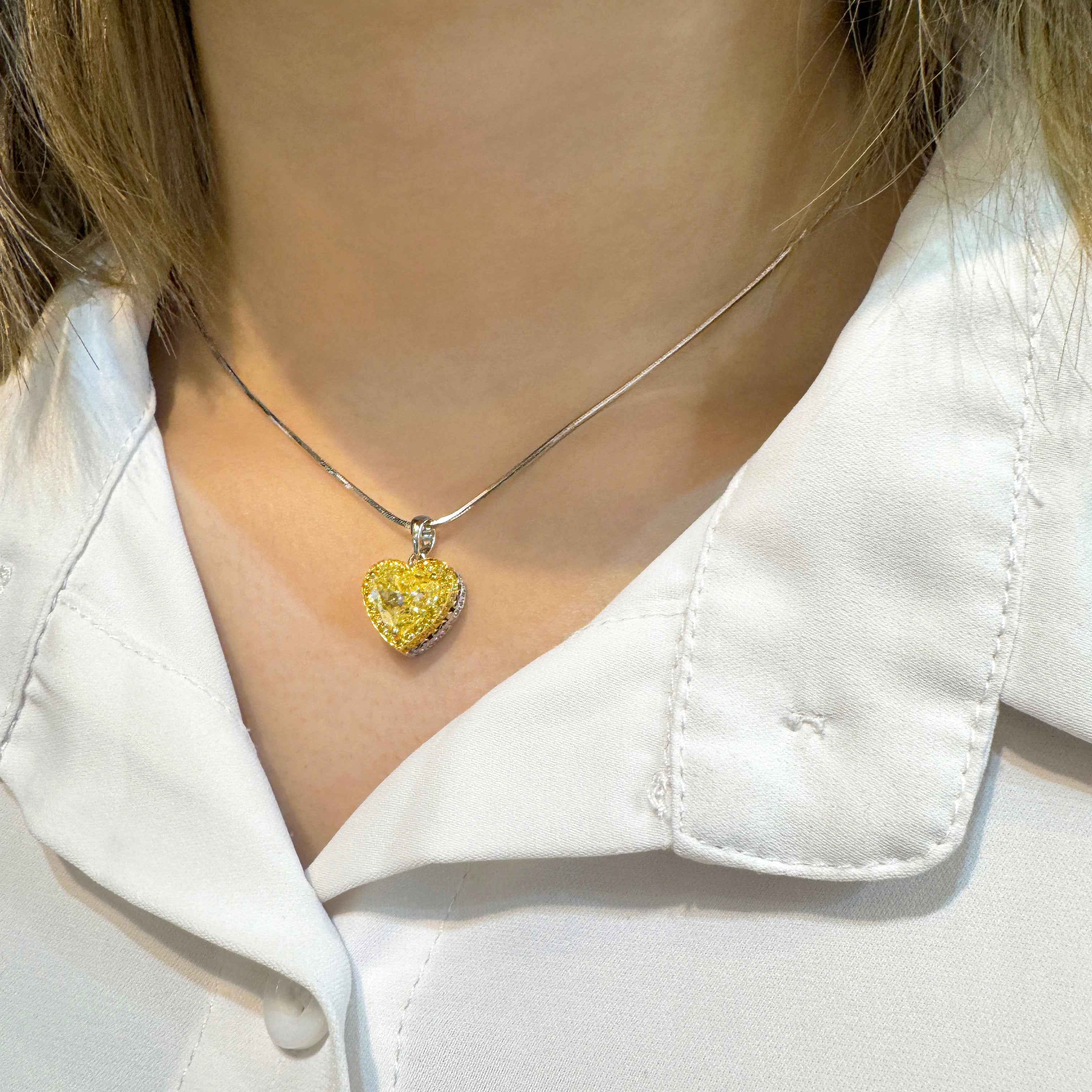 This pendant necklace features a natural fancy yellow 2.02 carat heart-shaped diamond center stone, secured in a prong setting. The heart-shaped yellow diamond is GIA-certified. This yellow diamond center is paired with an additional 50 yellow round-cut diamonds totaling 0.75 carats and 50 round-cut white diamonds. The pendant also features a lozenge-cut white diamond at the top of the pendant, weighing 0.75 carats. Set in platinum.