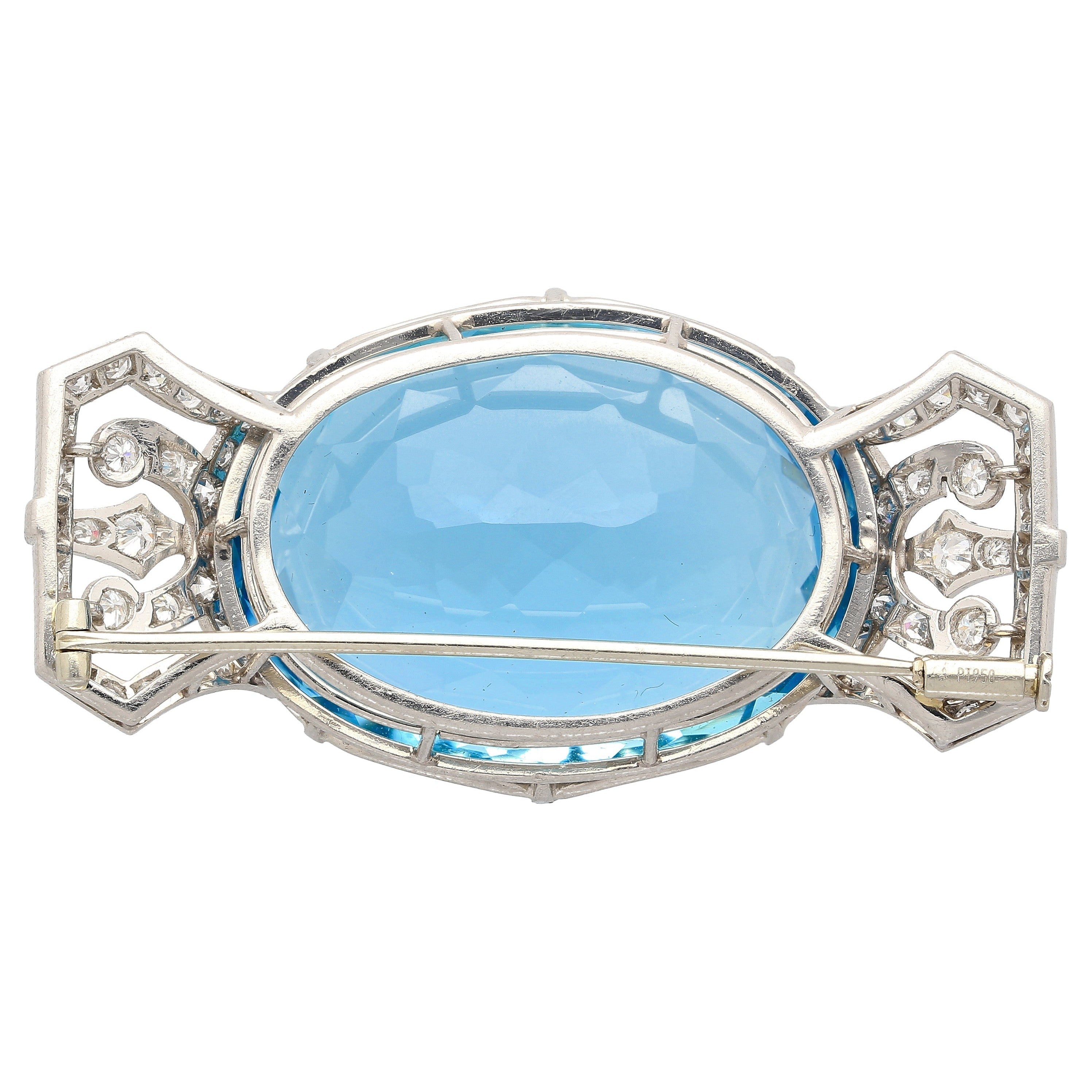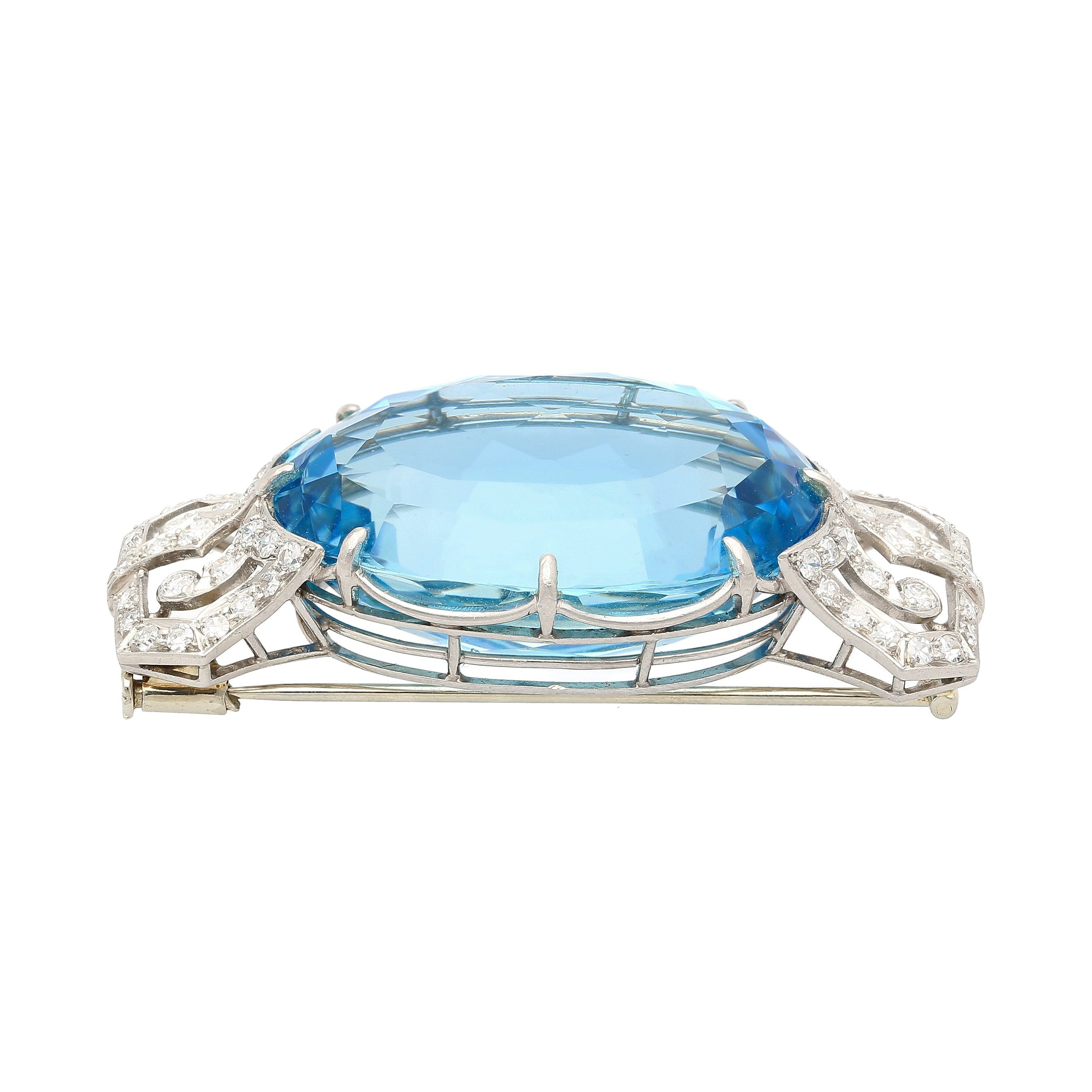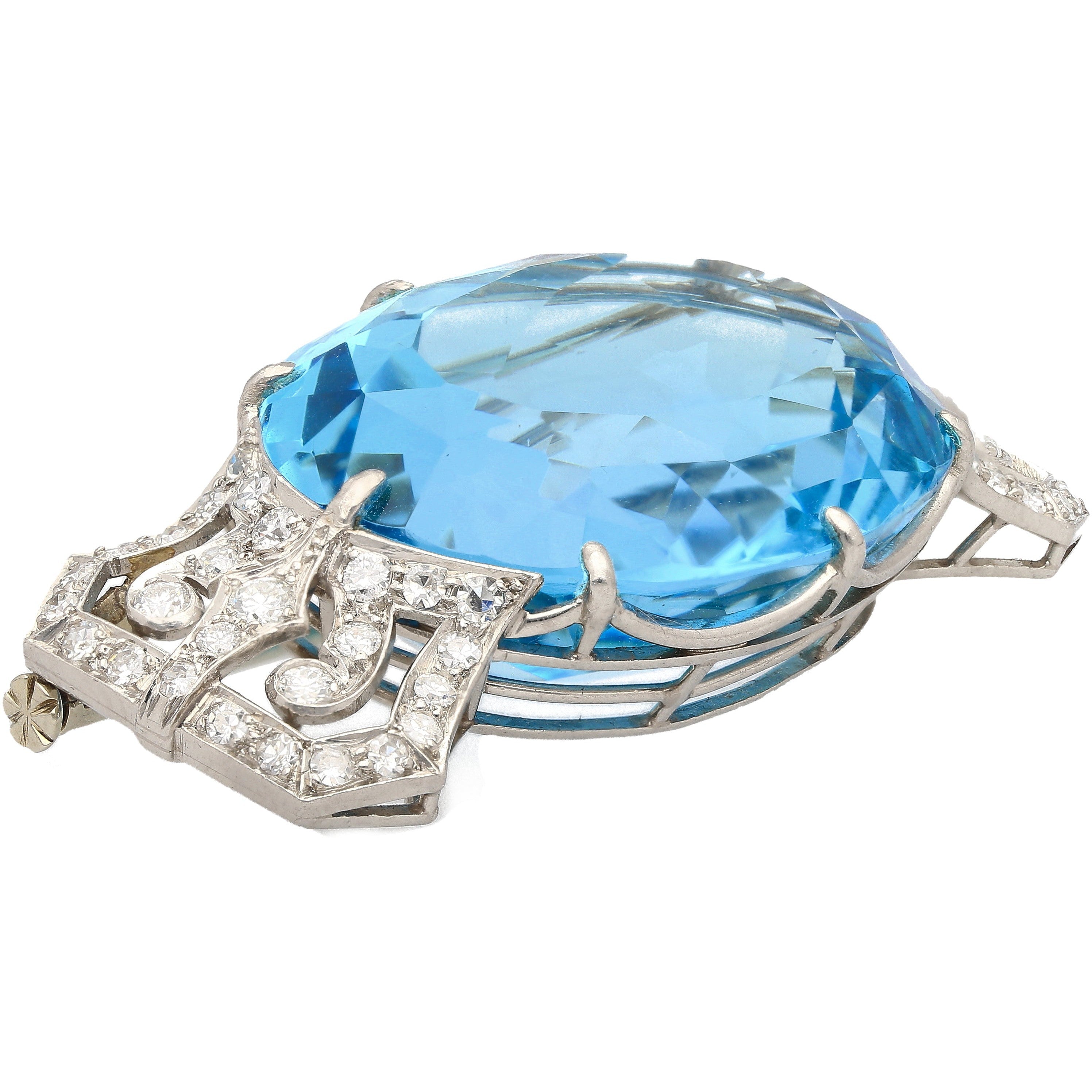62.15 Carat Oval Cut Aquamarine Round Diamond Vintage Platinum Pendant