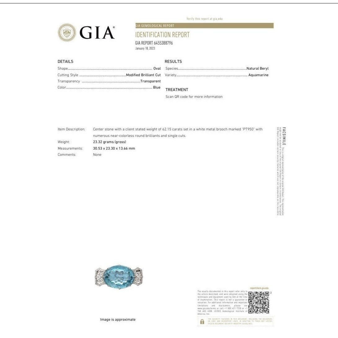 GIA certified 62.15 carat natural aquamarine set in a platinum 950 pendant. This is a vintage aquamarine and diamond pendant... Read more