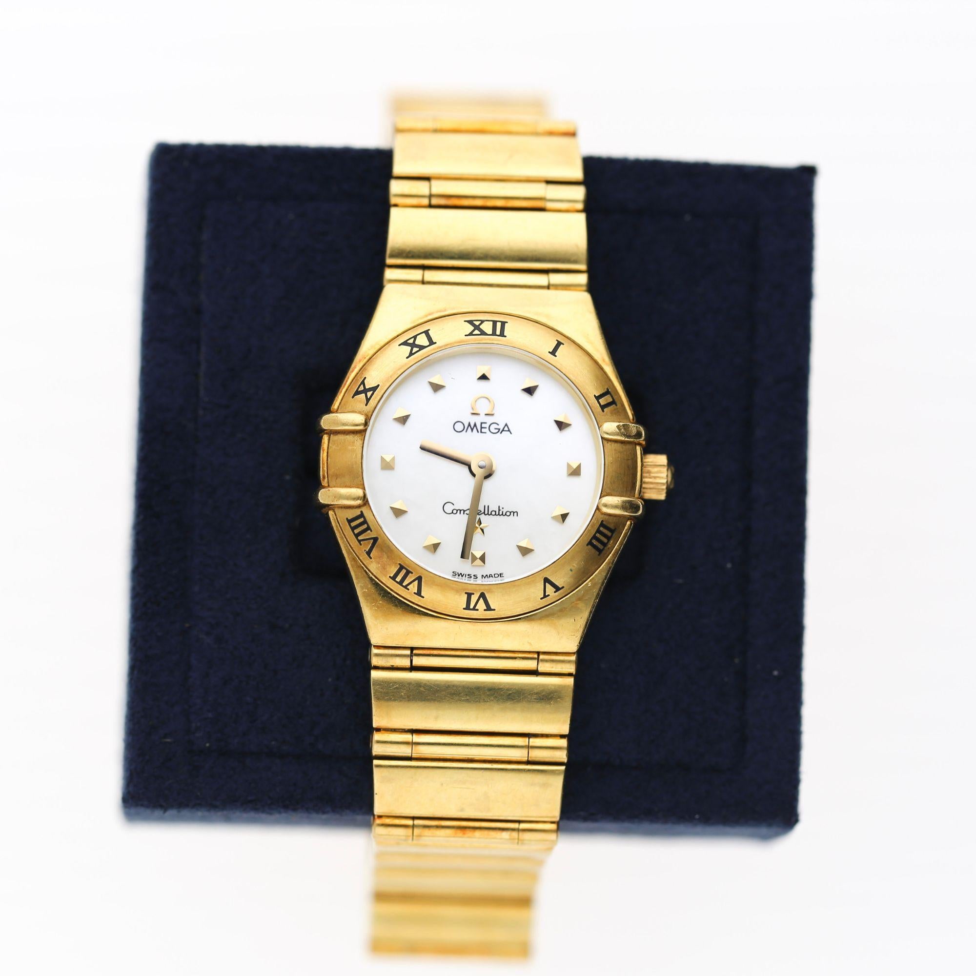 Omega Constellation "My Choice" ladies quartz watch in 18K yellow gold, reference 1161.71.00, Calibre 1456, circa 2000. White mother of pearl dial with raised gold arrowhead indices, engraved Roman numeral bezel, and integrated polished flat-link yellow gold bracelet with deployant clasp.