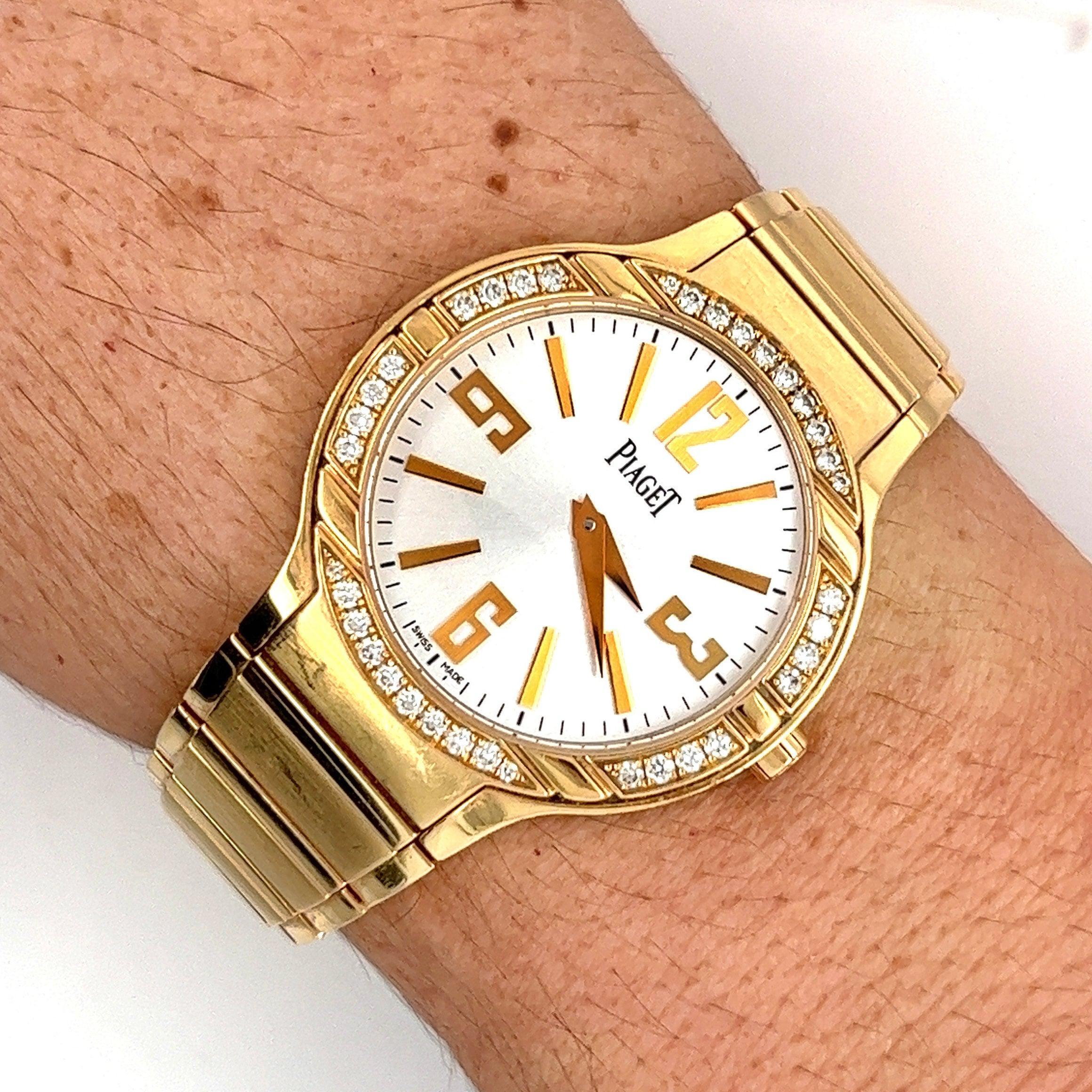 18k yellow gold 32mm case with an 18kt solid gold bracelet. Fixed bezel set with 36 round cut diamonds. Silver dial with gold-tone hands and index and Arabic numeral hour markers. Arabic numerals mark the quarter-hour positions. minute markers around the outer bezel. Water resistant at 30 meters / 100 feet.