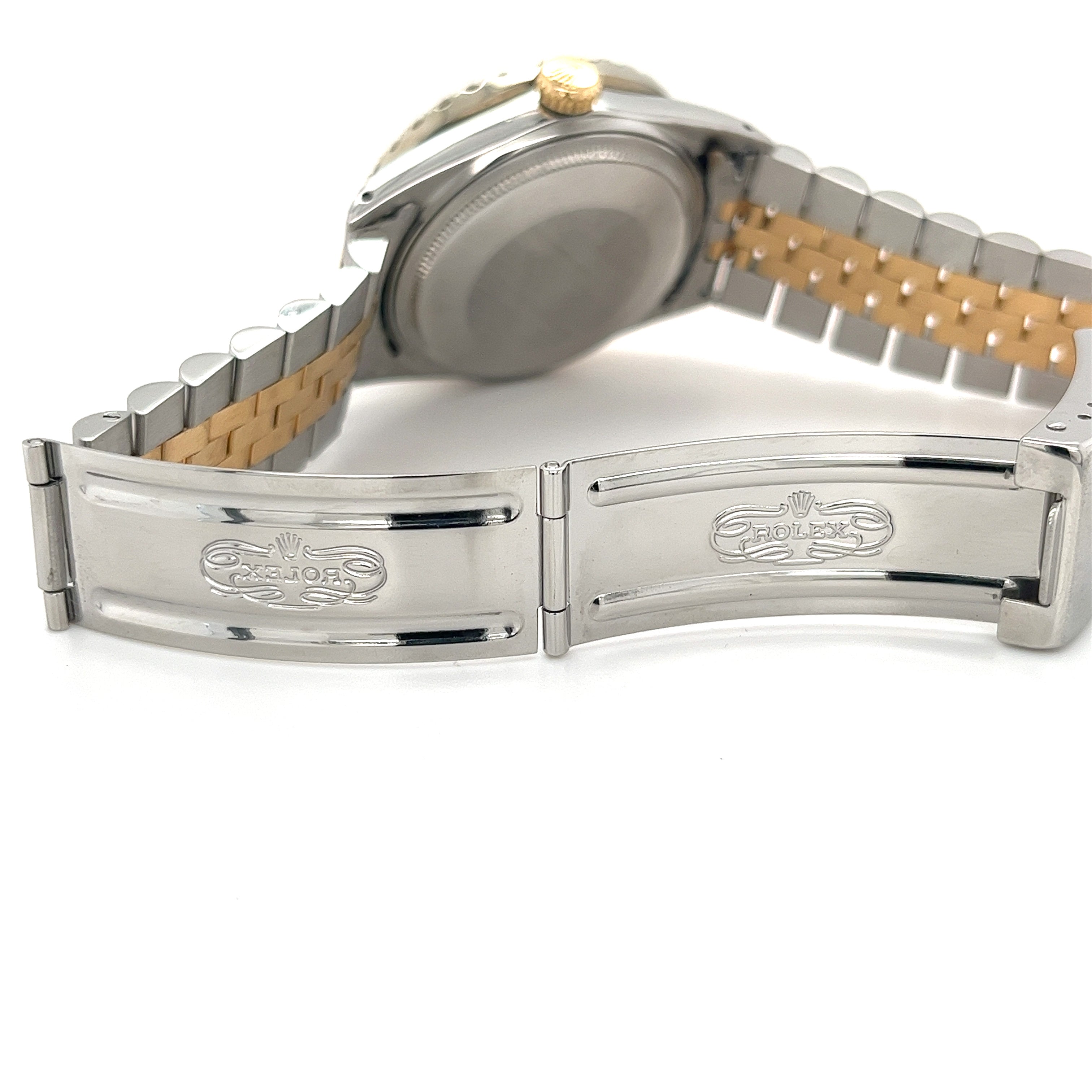 Rolex Datejust 16013 set with over 3 carats in natural round cut diamonds. Diamonds are set all around the bezel and on the Roman Numeral hour markers. Complemented with a two-tone jubilee strap and adjustable deployment clasp.