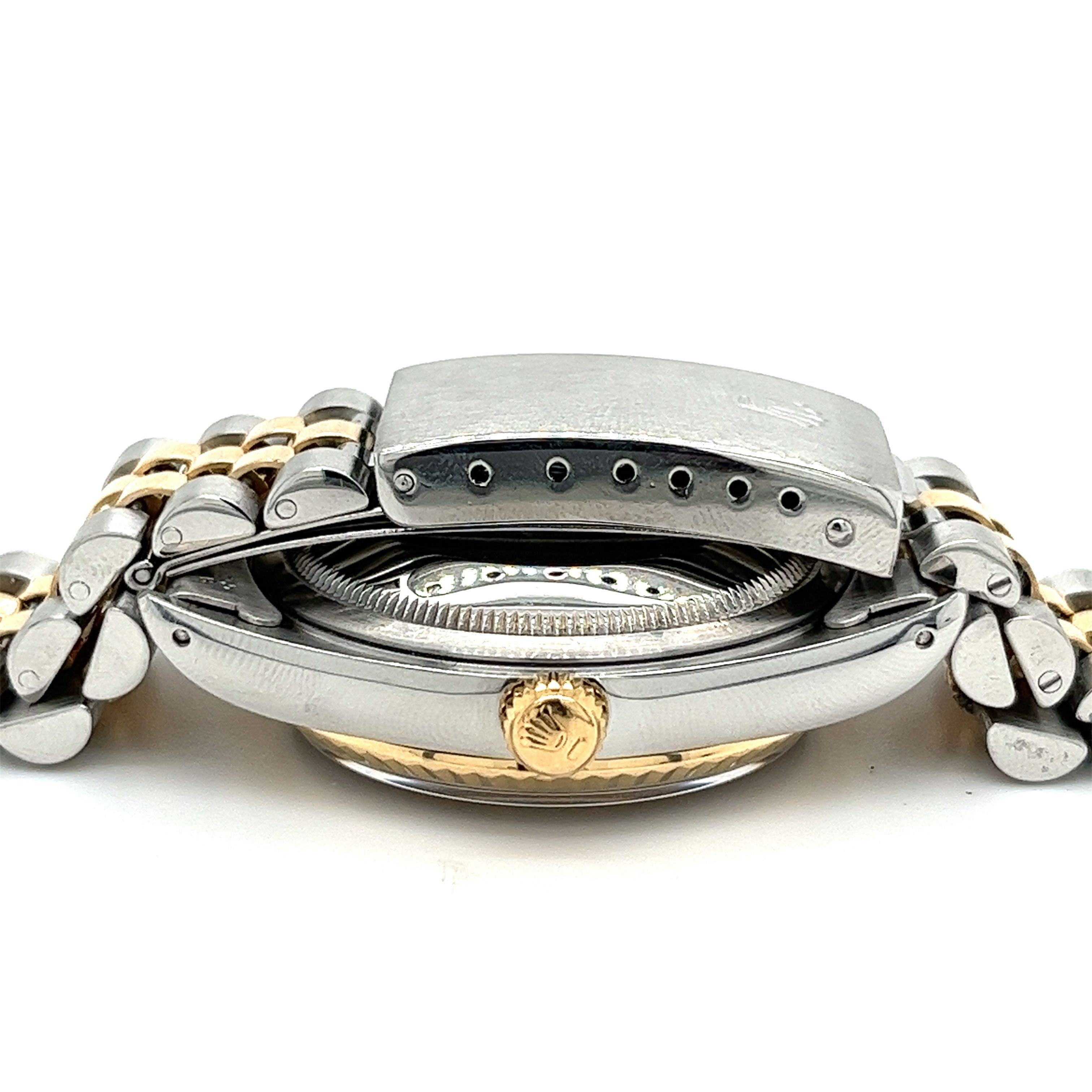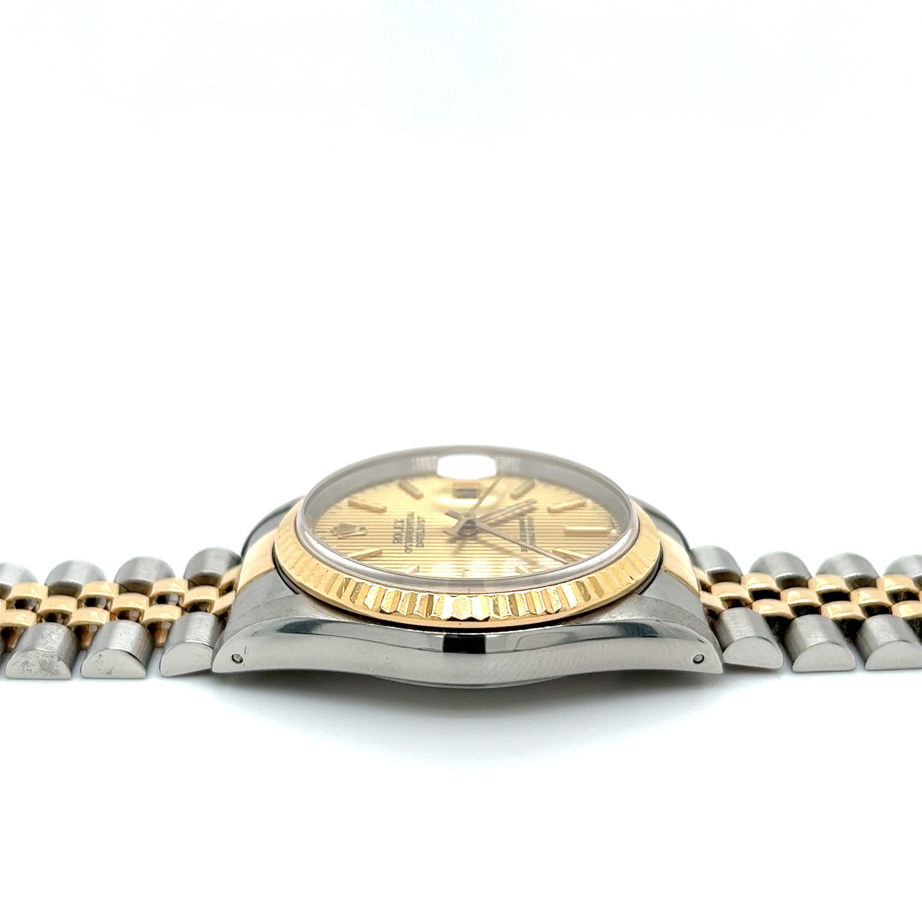 Vintage Rolex unisex Datejust 36mm case with a fluted 18k gold bezel and fluted champagne gold dial. Date bubble at 3 position with stick hour markers. Jubilee bracelet in two tone 18k gold and stainless steel. Automatic movement with screw-down crown and case back. All original Rolex parts and perfect moving condition. Complete with original Rolex box and literature.