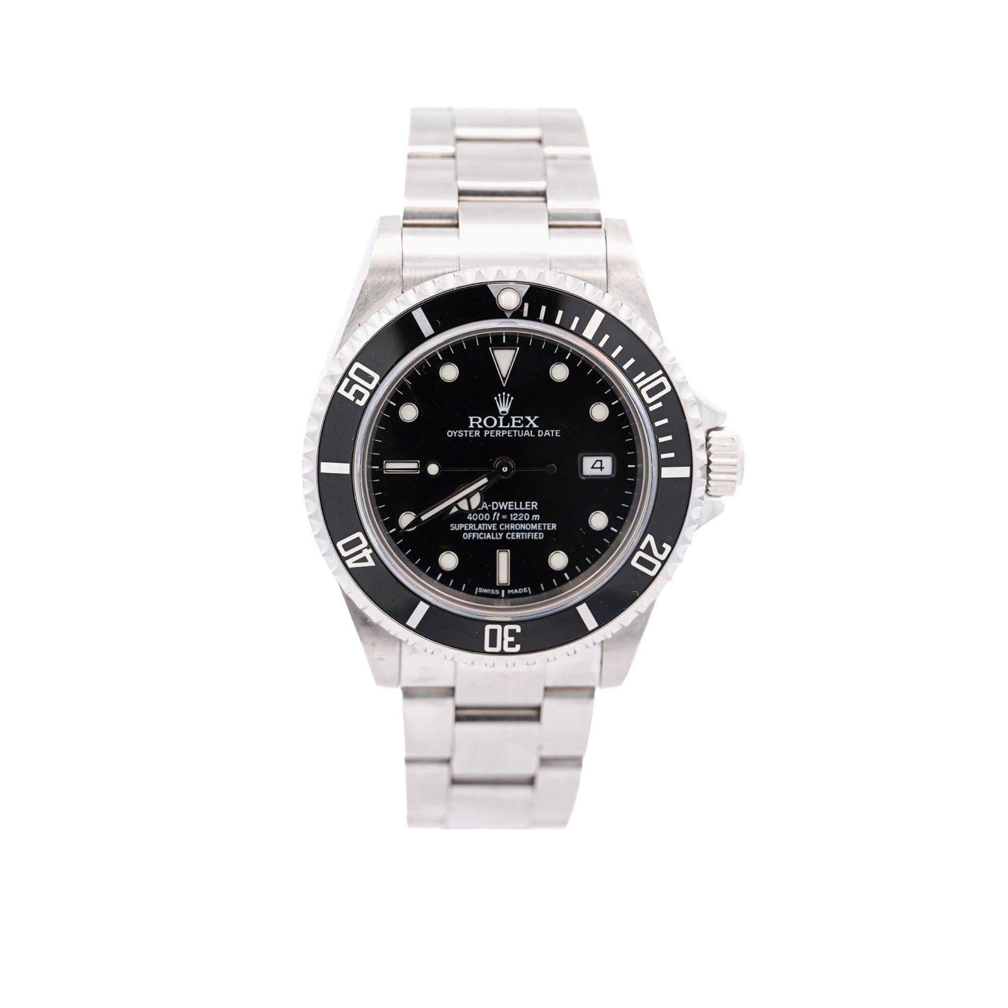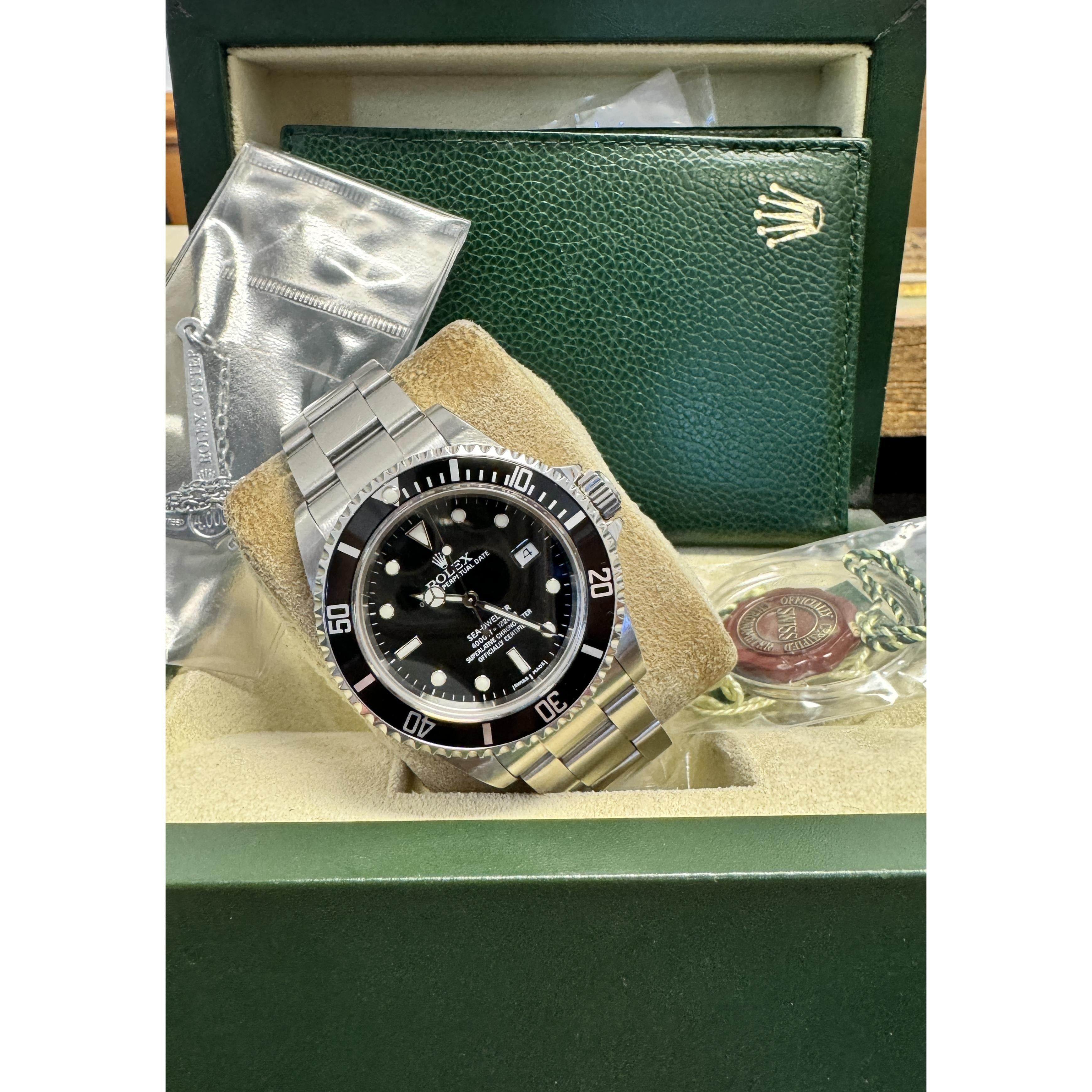 The robust Rolex Sea-Dweller 16600, featuring a 40mm stainless steel case built for 4,000 feet of deep-sea diving, complete with its original box, card, and full set of accessories.
