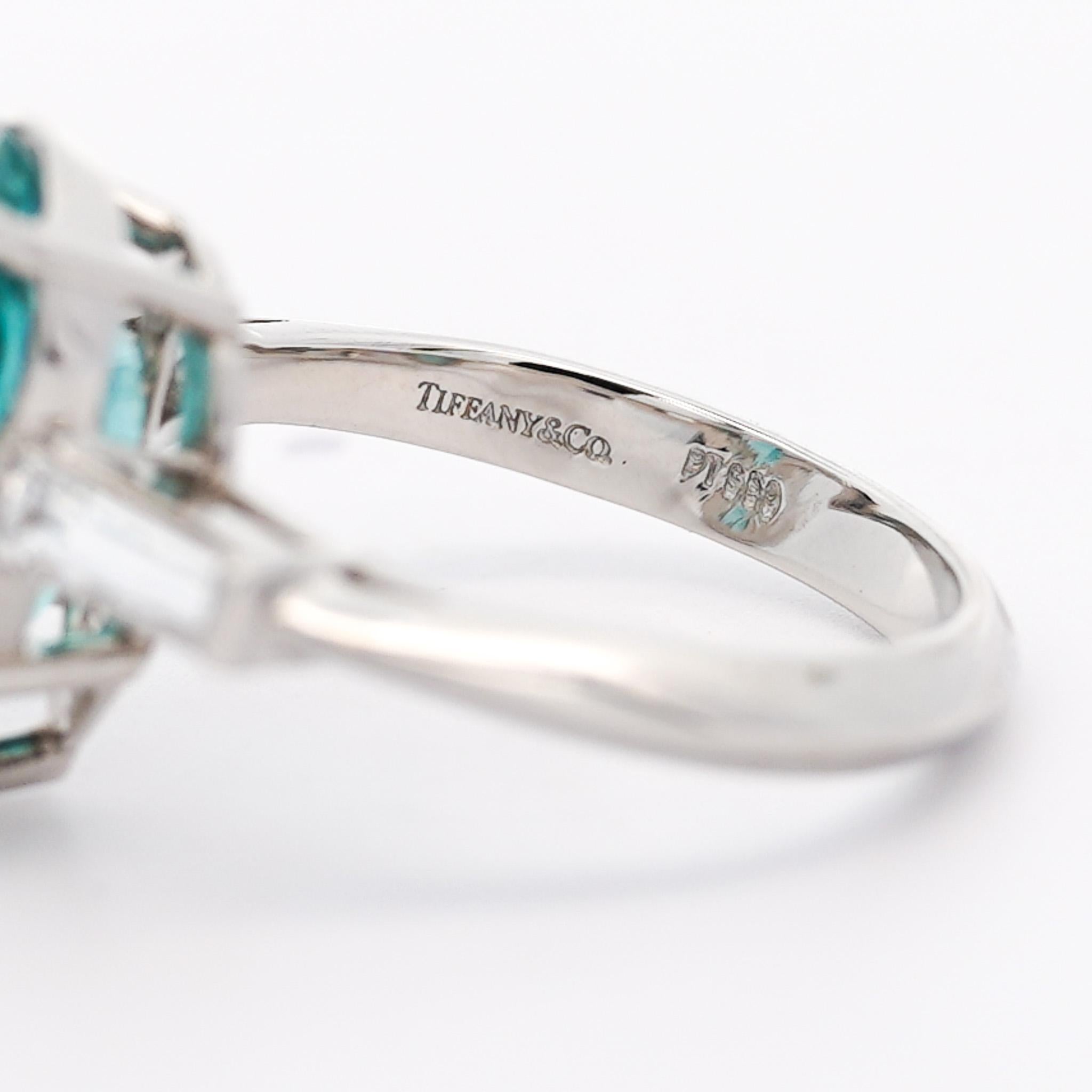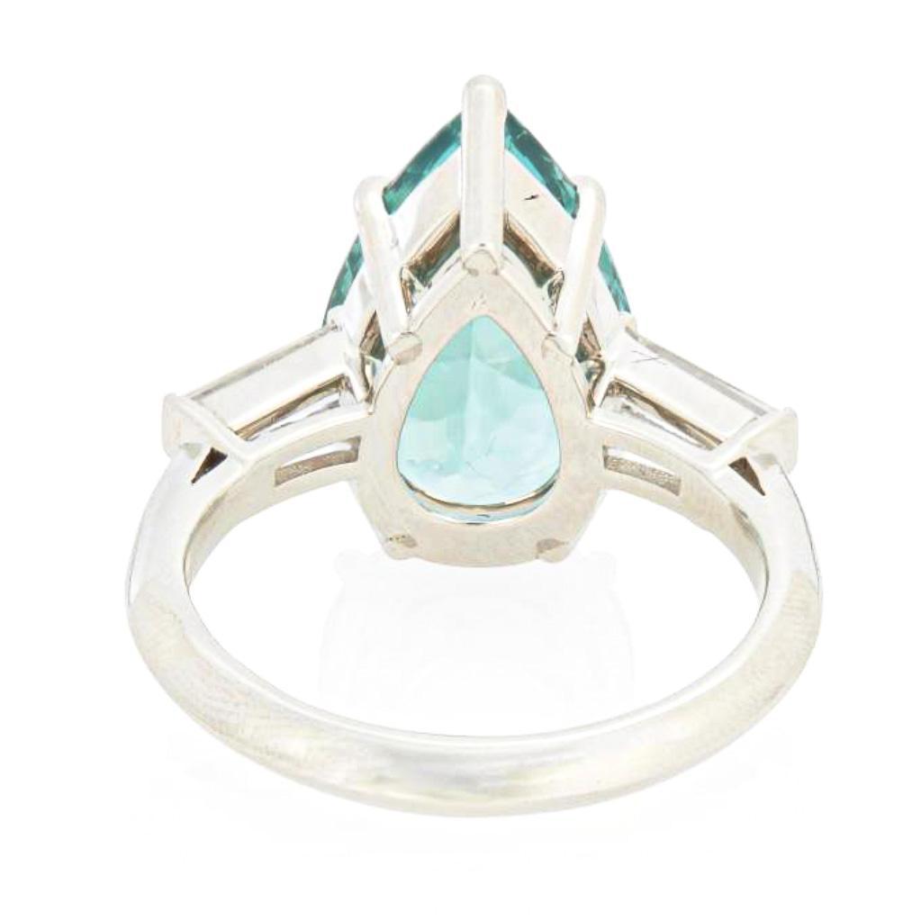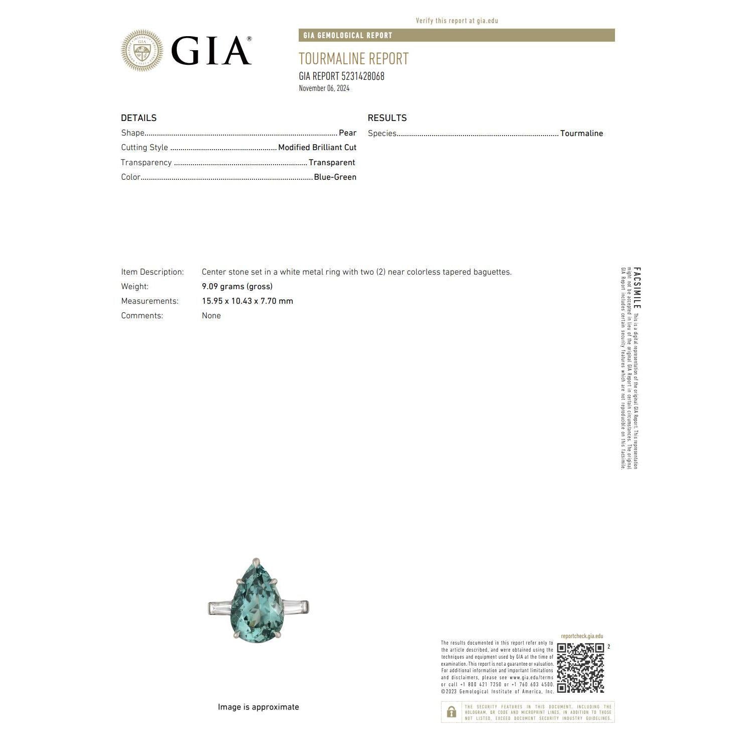 Vintage Tiffany & Co. Signed 6.5 Carat Pear Cut Green-Blue Tourmaline and Baguette Cut Diamond Three Stone Platinum Engagement Ring. Ring size 7.5, GIA certified. Complete with the original Tiffany & Co. box.