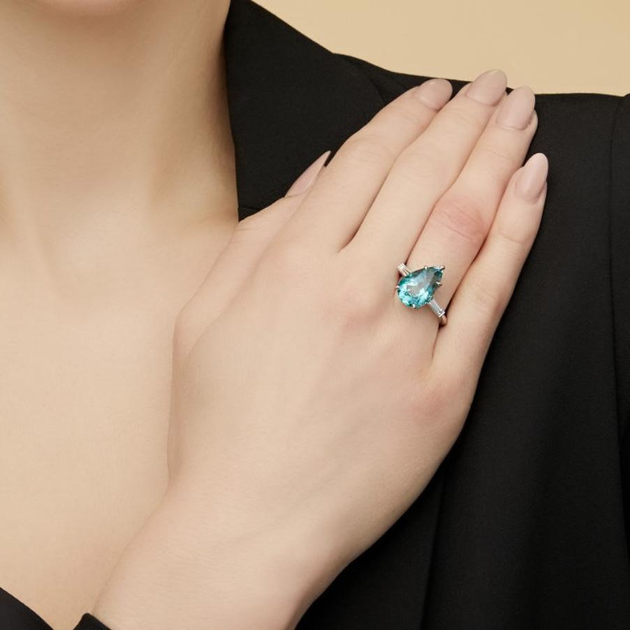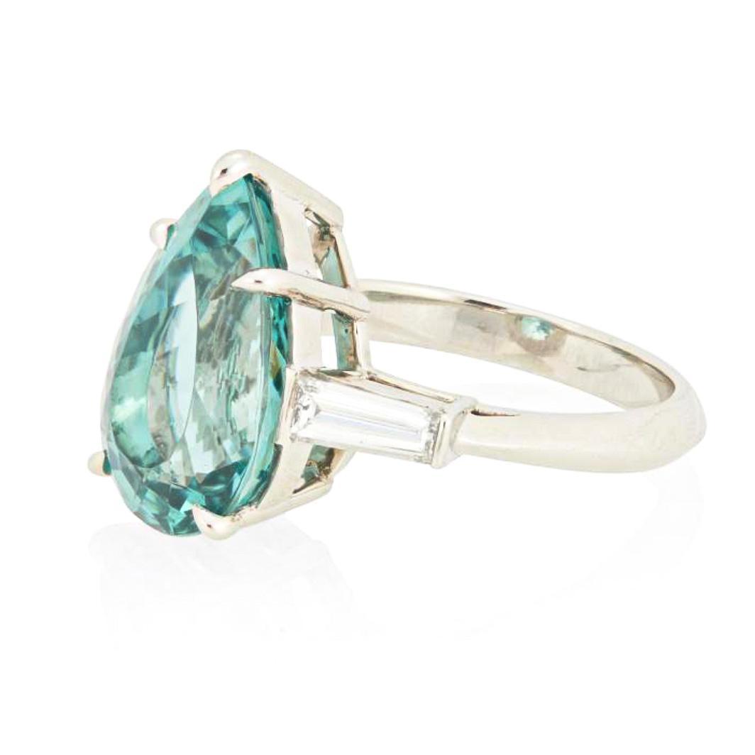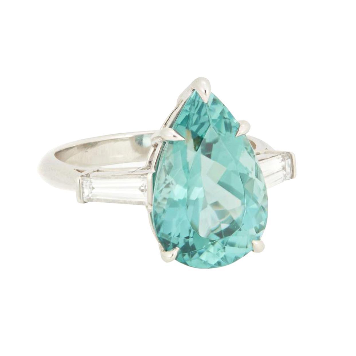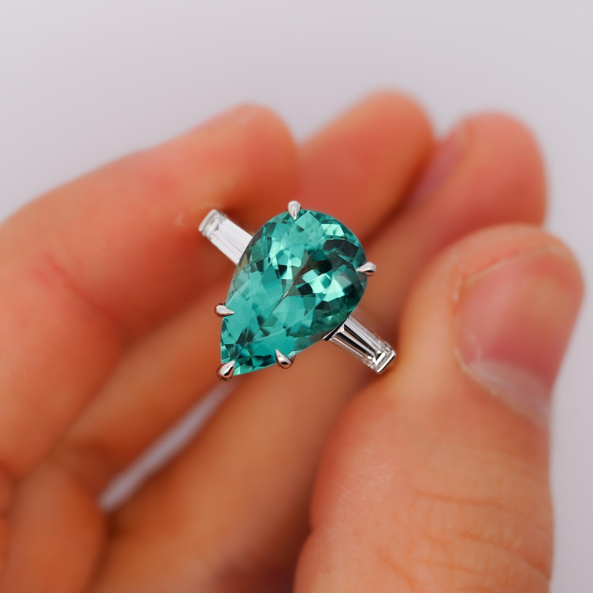 An extraordinary Platinum 950 set Blue-Green pear cut tourmaline ring, featuring an impressive 6.5-carat pear-cut tourmaline, flanked by 2 sparkling diamond baguettes. The breathtaking greenish-blue tourmaline offers a captivating play of colors, excellent transparency, and perfect symmetrical cutting. Securely boxed in a Tiffany & Co. velvet presentation case, it’s ready to dazzle for any special occasion.
