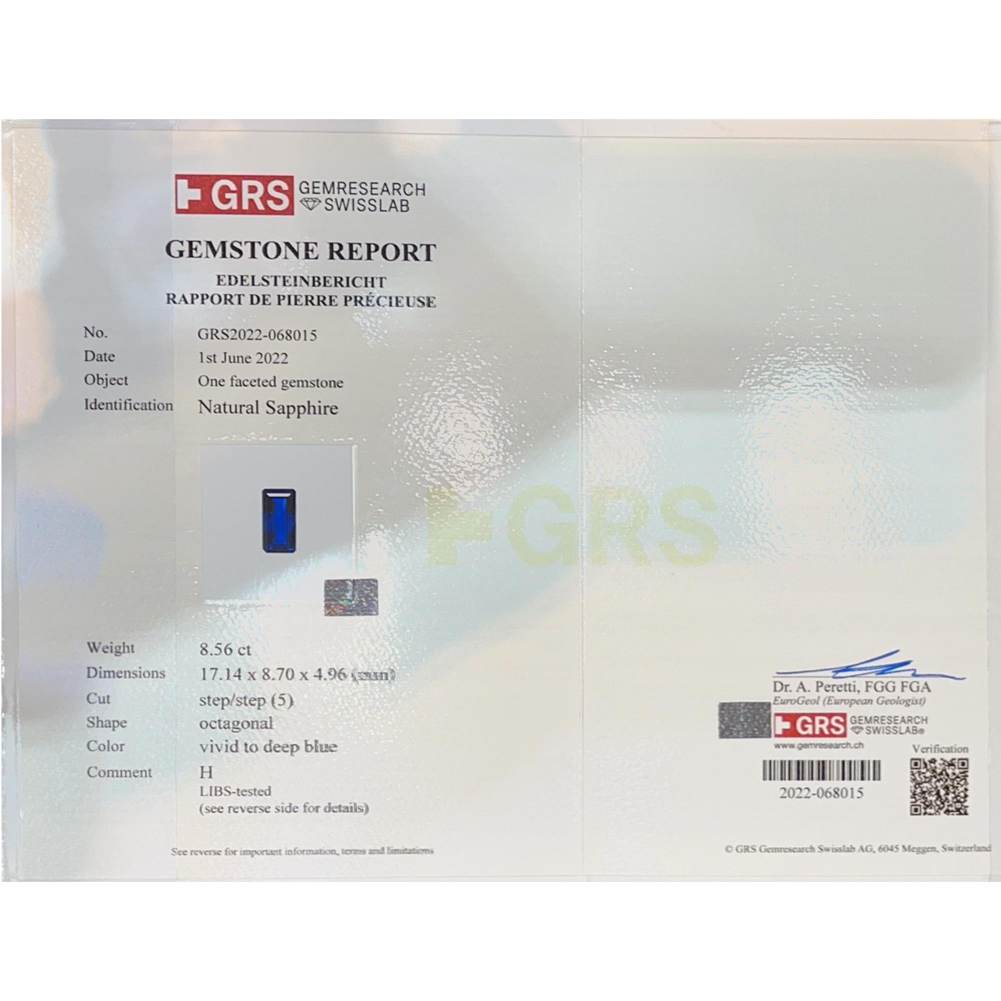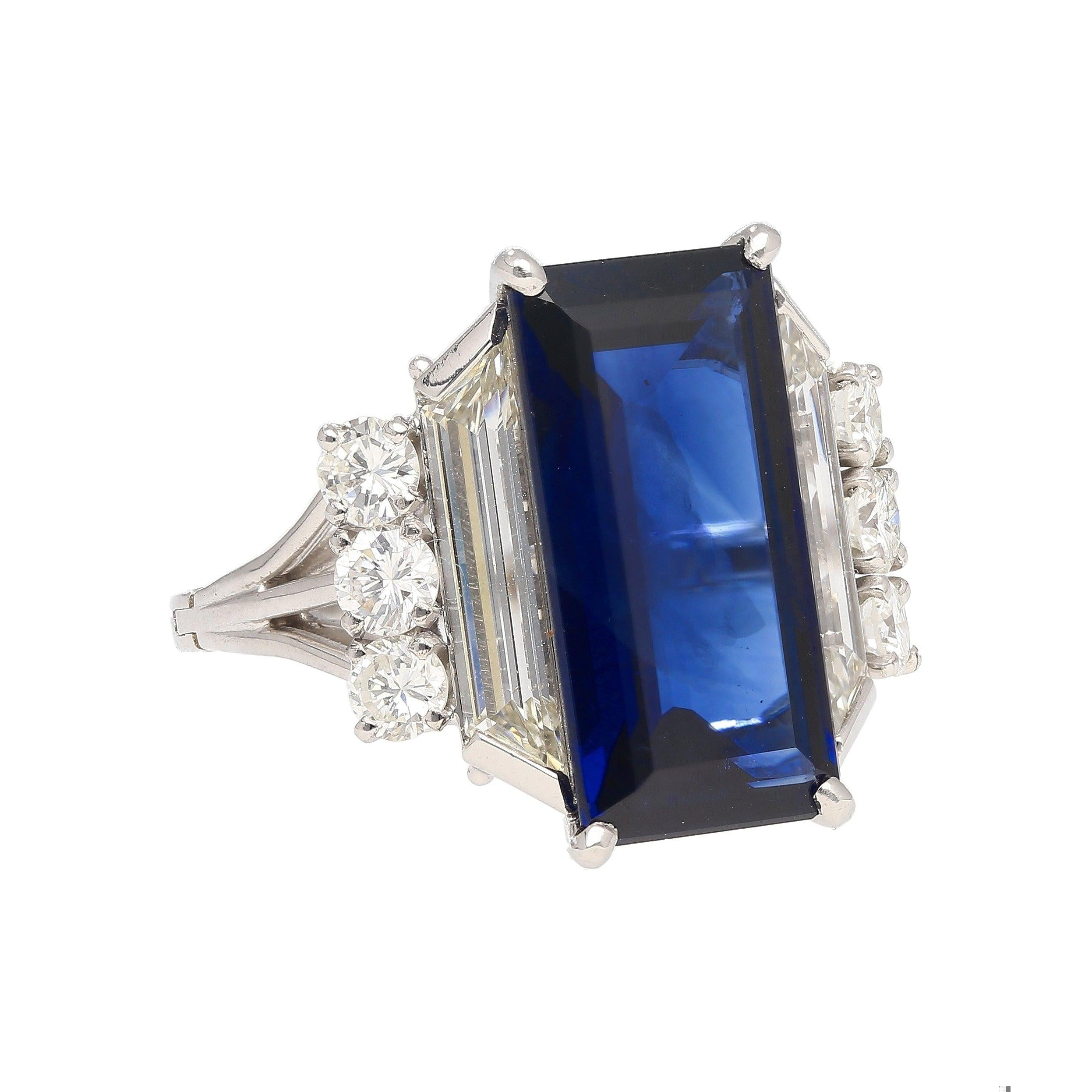8.56 Carat Emerald Cut Blue Sapphire Trapezoid Diamond Art Deco Ring