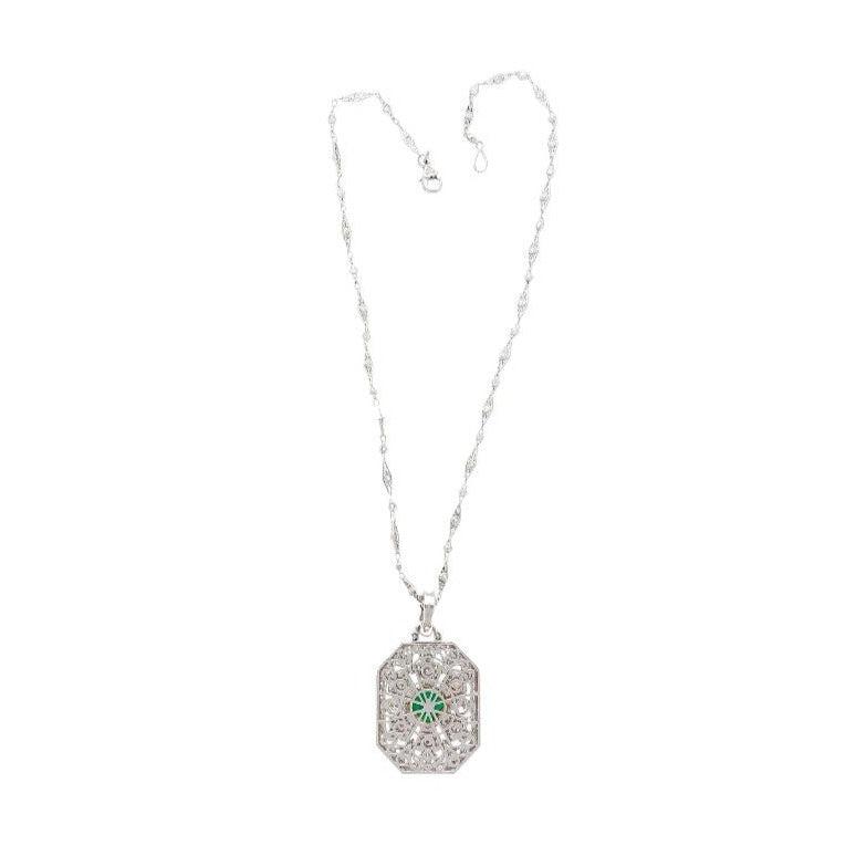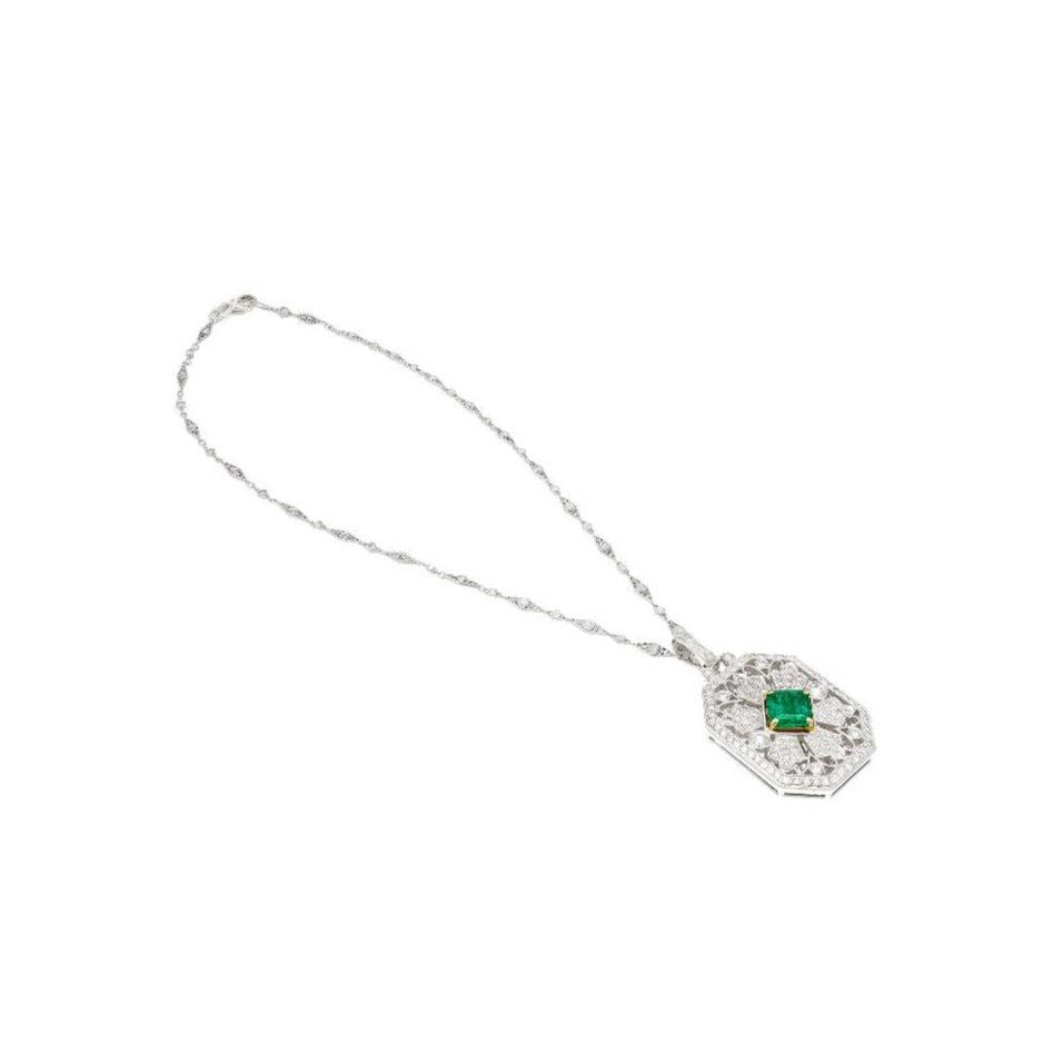 3.16 Carat Emerald Cut Vivid Green Emerald Round Diamond Pendant Necklace Platinum Art Deco Minor Oil