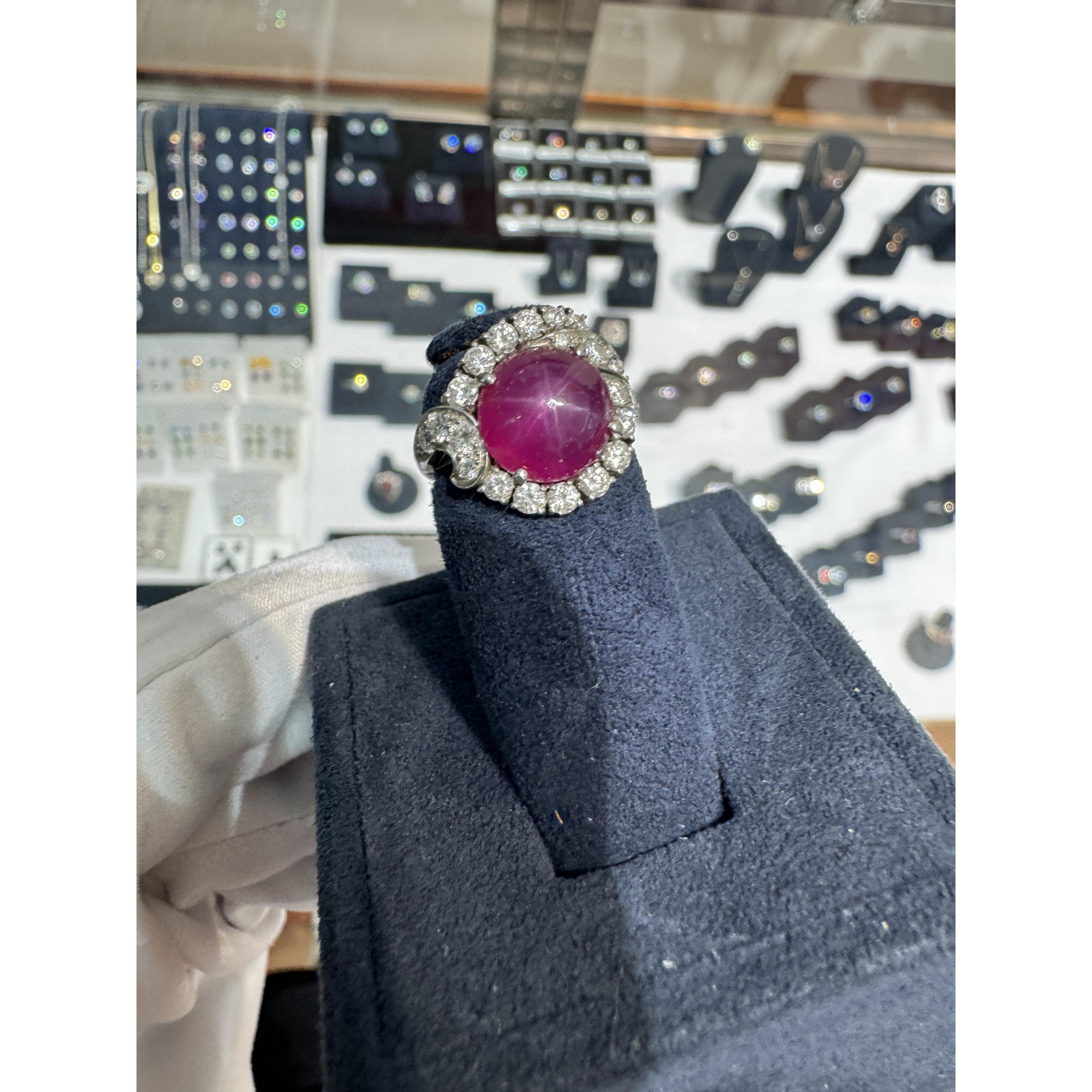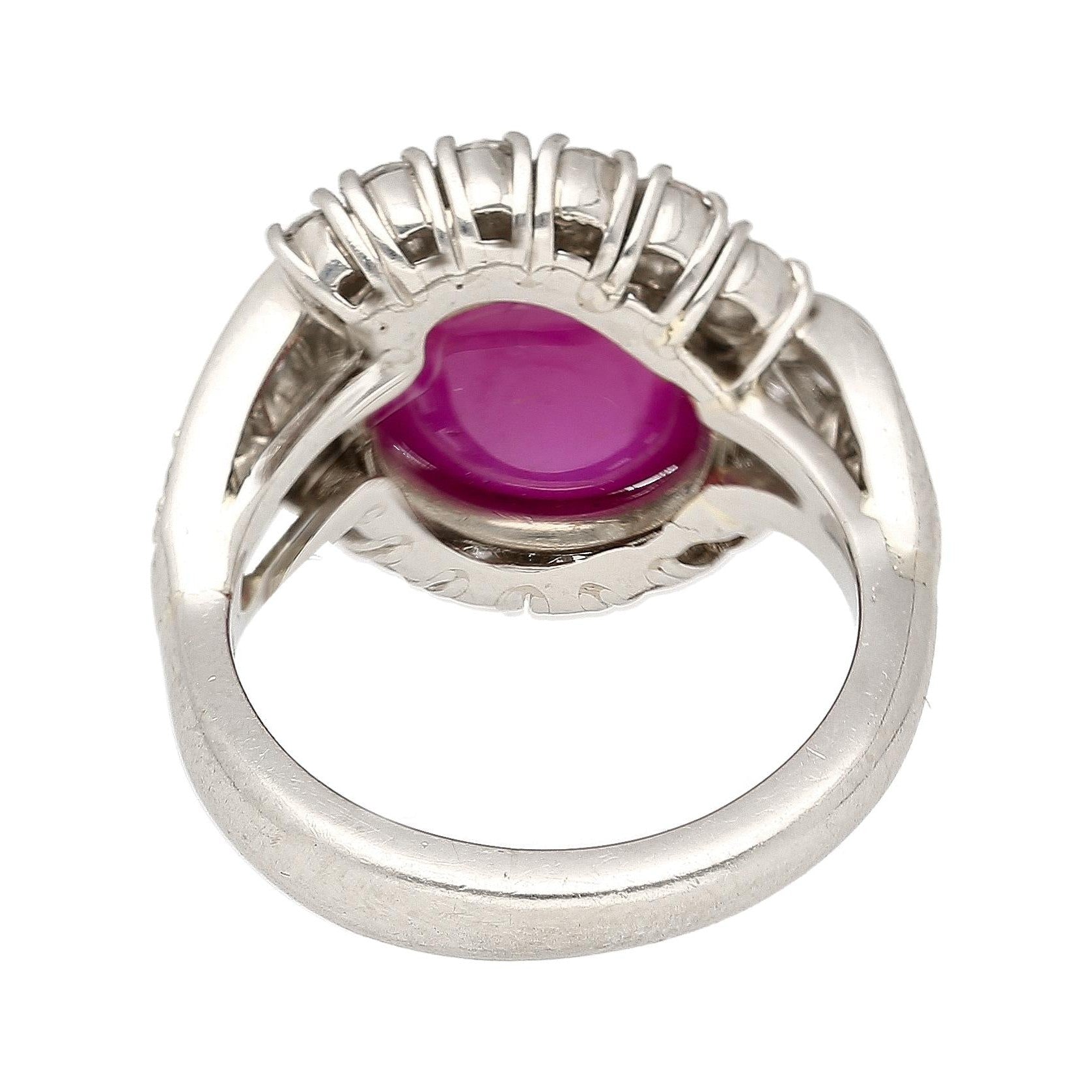 GRS certified 6.01 carat cabochon cut no heat Vietnam star ruby set in vintage platinum 900 freeform ring with round diamond halo and shank accents. The mid-century retro European design features curved freeform construction with prong setting.