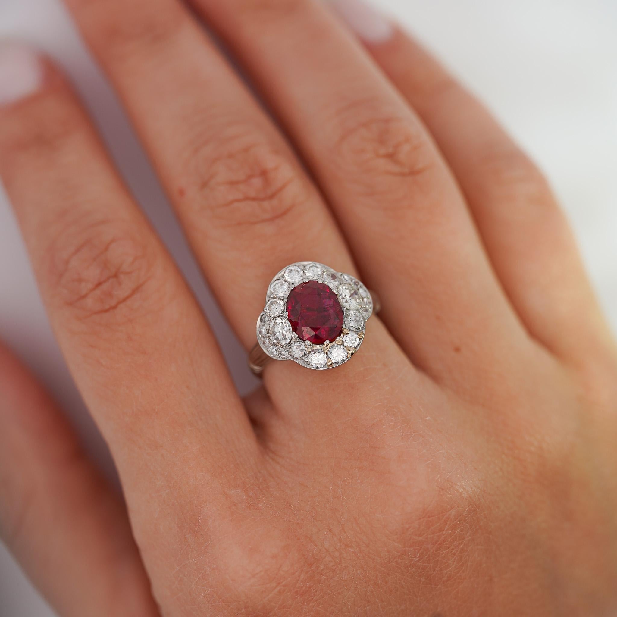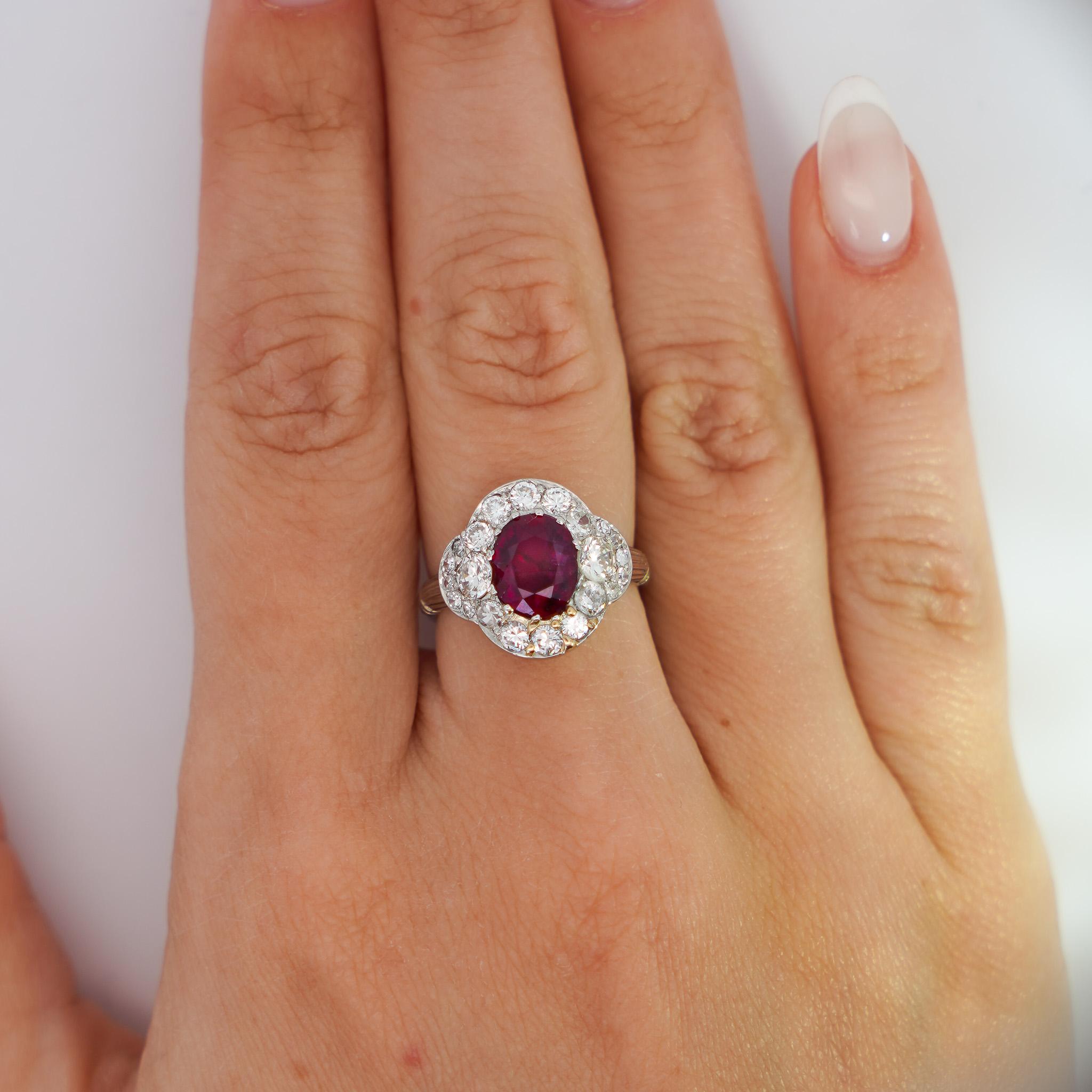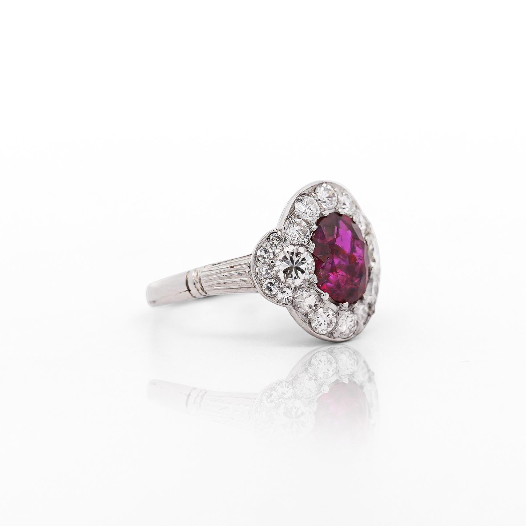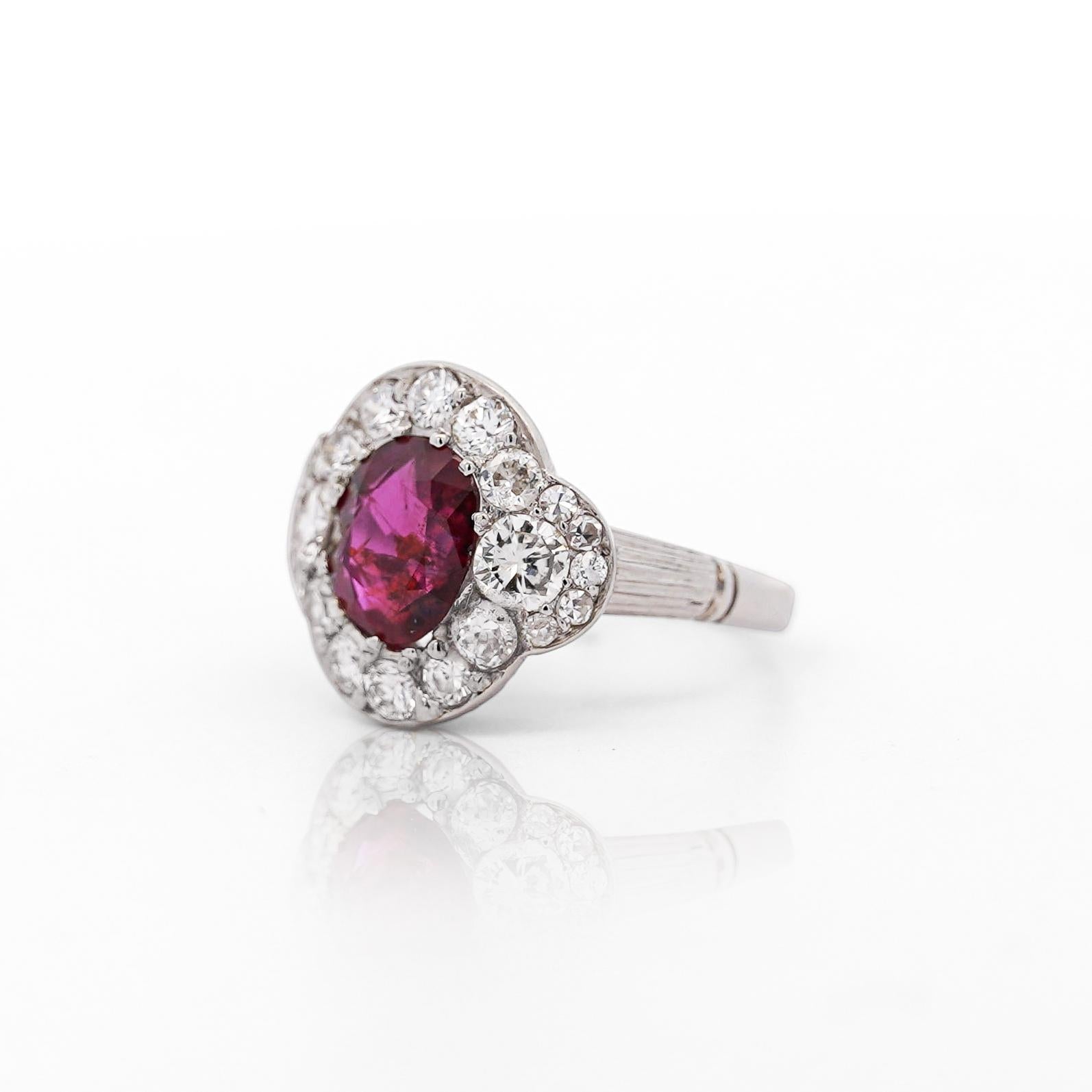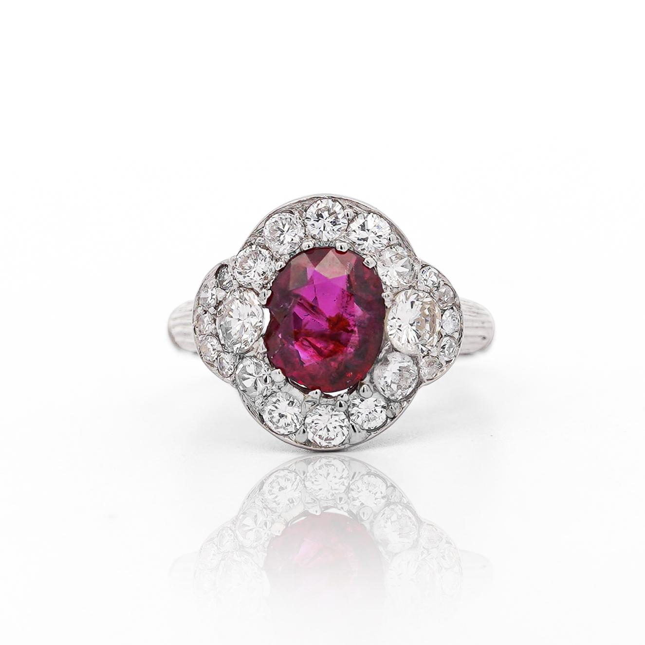 This vintage platinum ring features a stunning GIA-certified 2.3 carat oval-cut no heat Burma ruby surrounded by single, brilliant, and old Euro-cut diamonds totaling approximately 2 carats.
