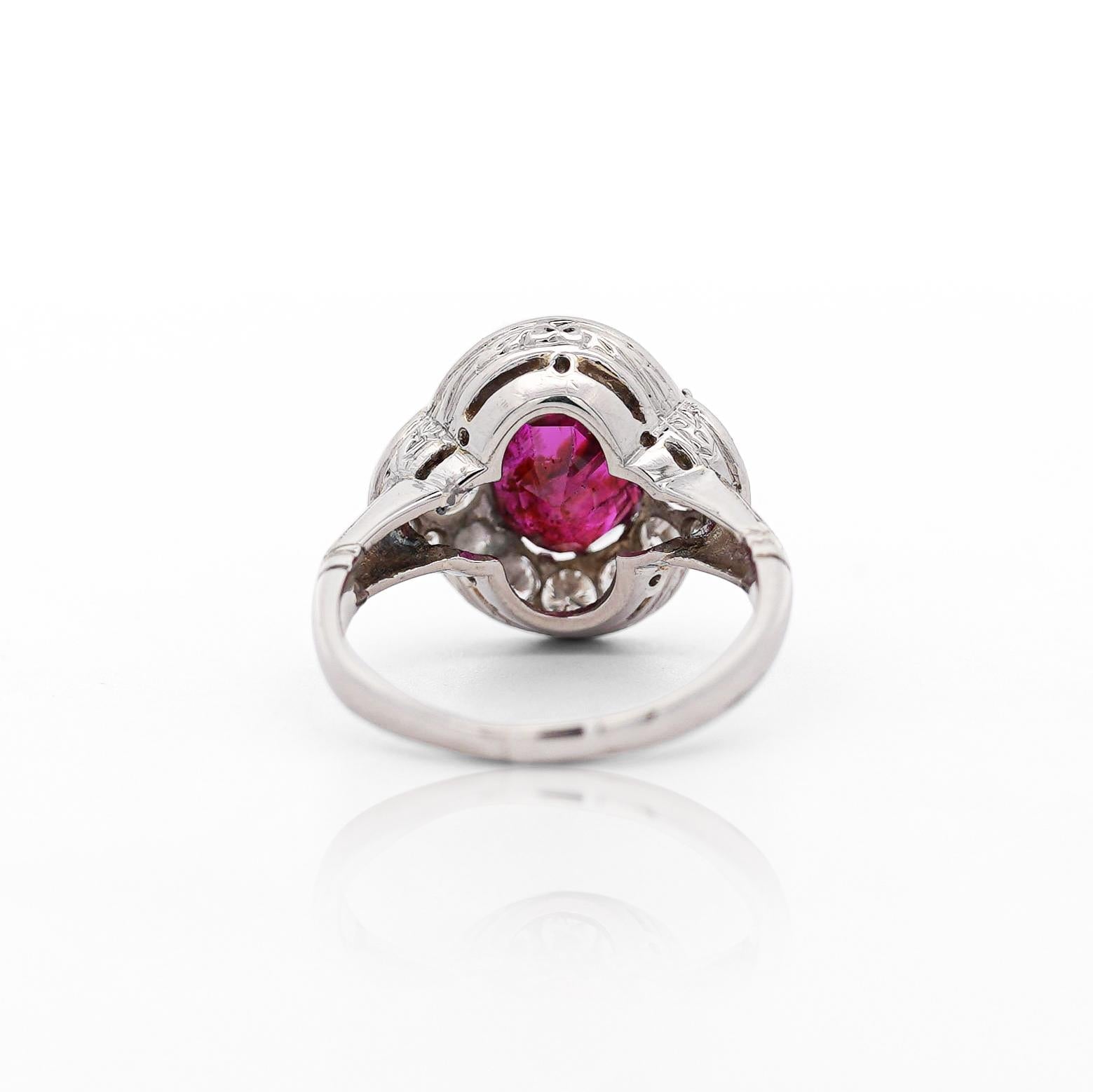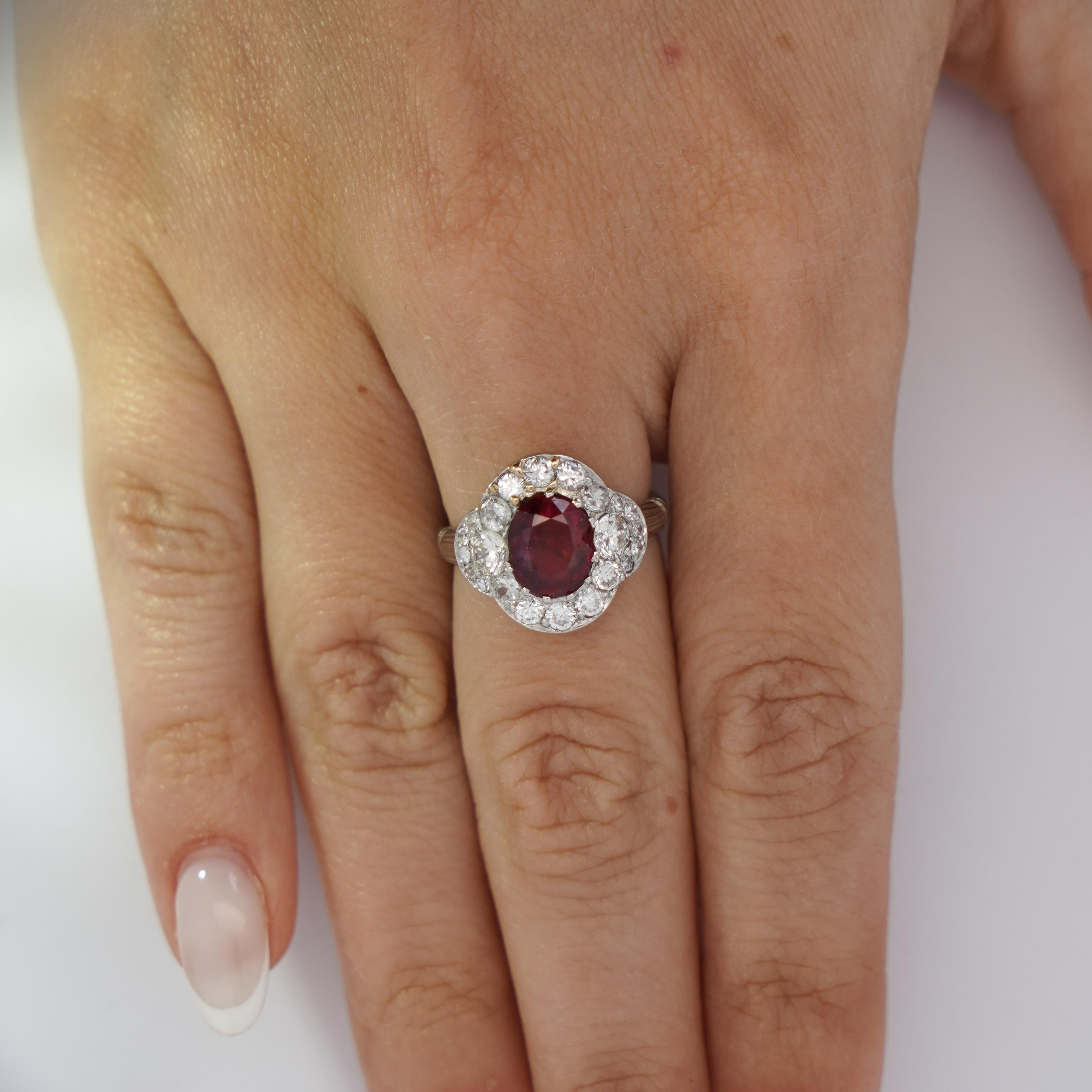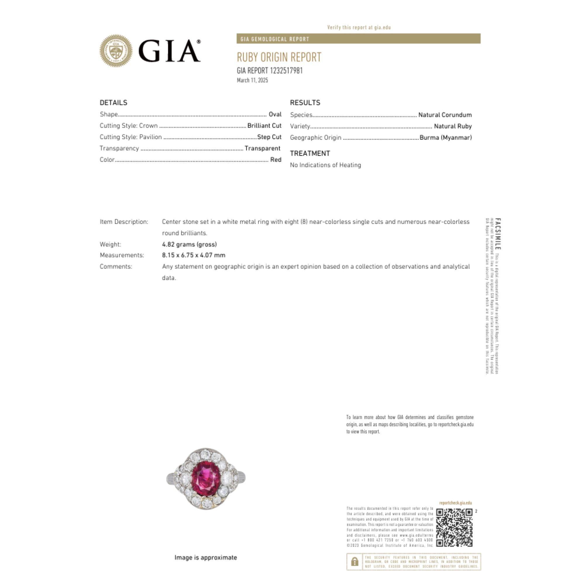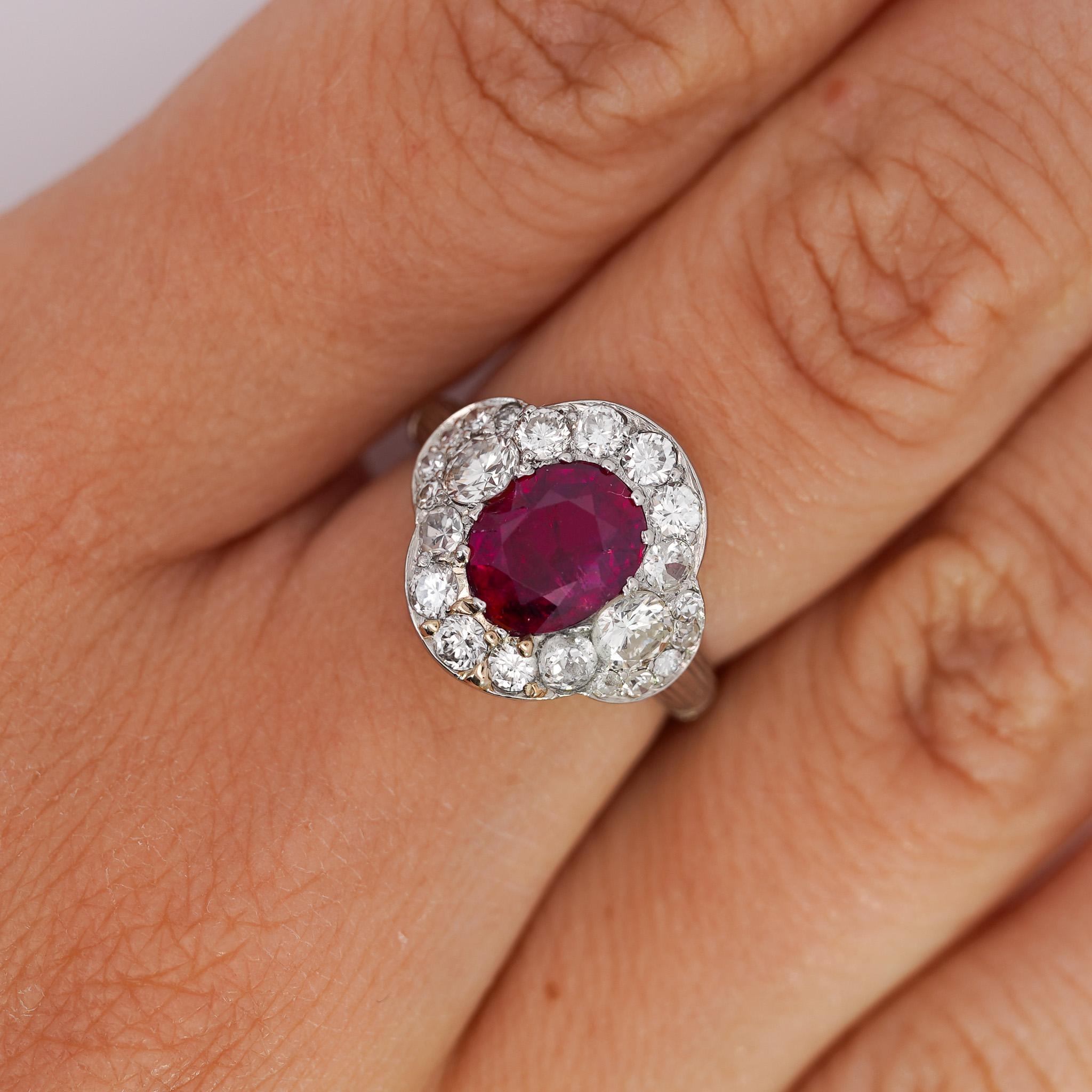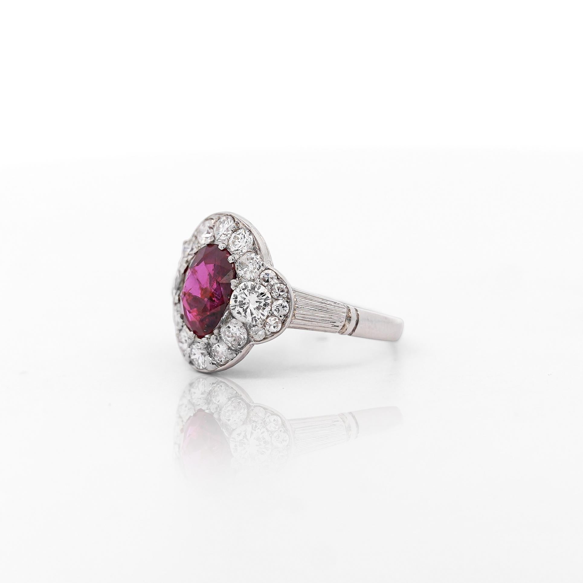 This vintage platinum ring features a stunning GIA-certified 2.3 carat oval-cut no heat Burma ruby surrounded by single, brilliant, and old Euro-cut diamonds totaling approximately 2 carats.