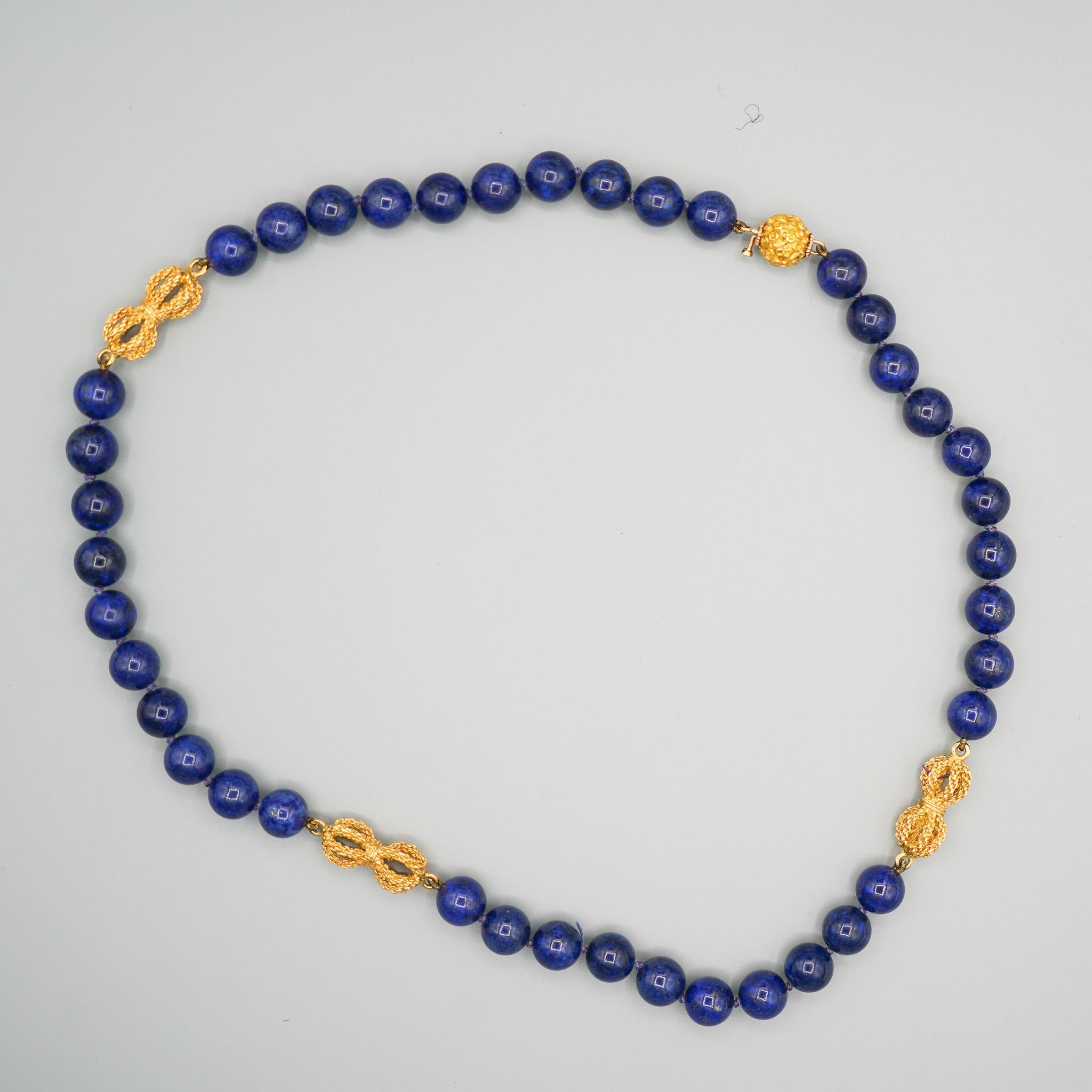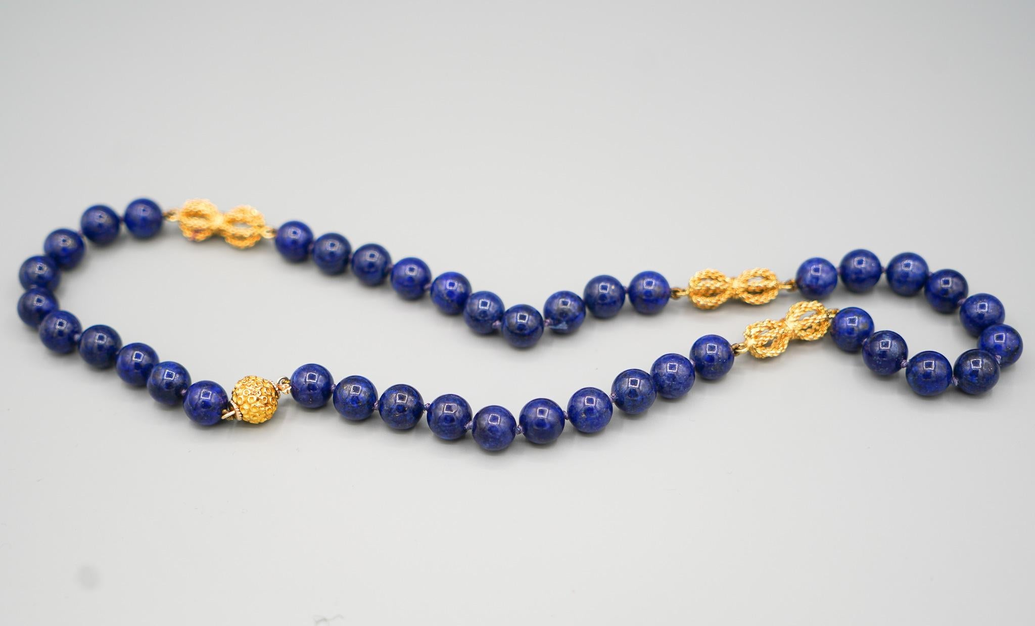 GIA certified natural lapis lazuli bead necklace with 18K yellow gold accents from Laykin and Co. Untreated round lapis lazuli... Read more