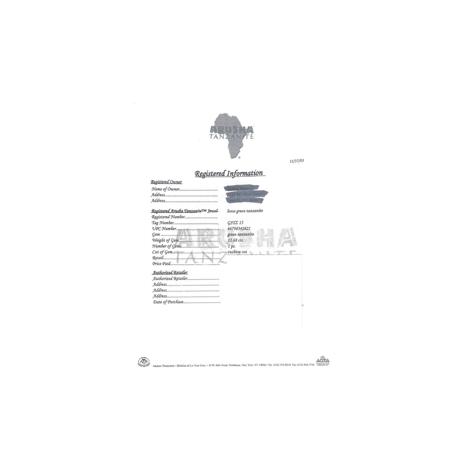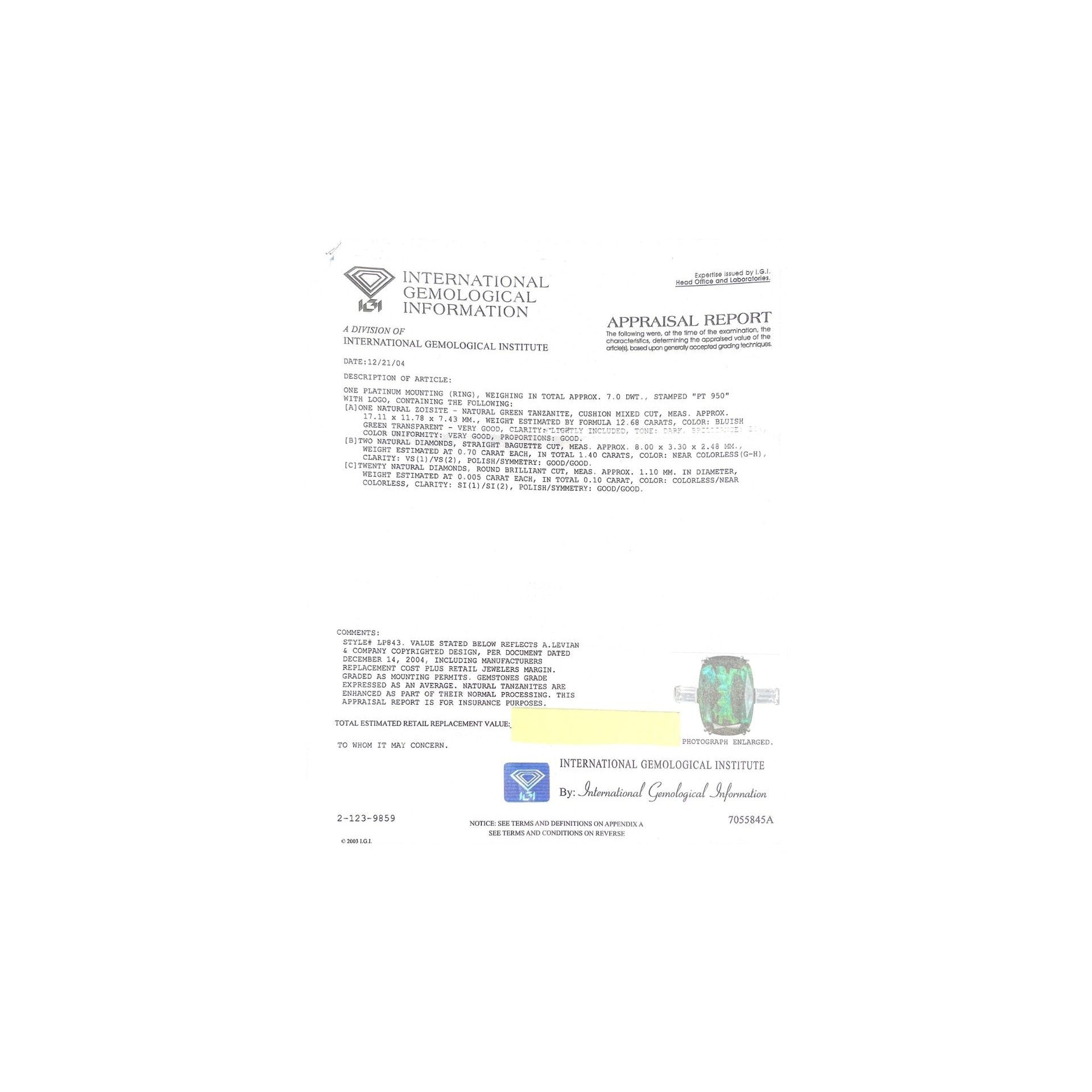 - Accompanied by IGI report no. 7055845A stating the tanzanite is natural, cushion cut, green color, and weighs 12.68 carats