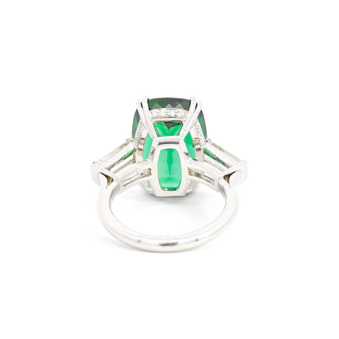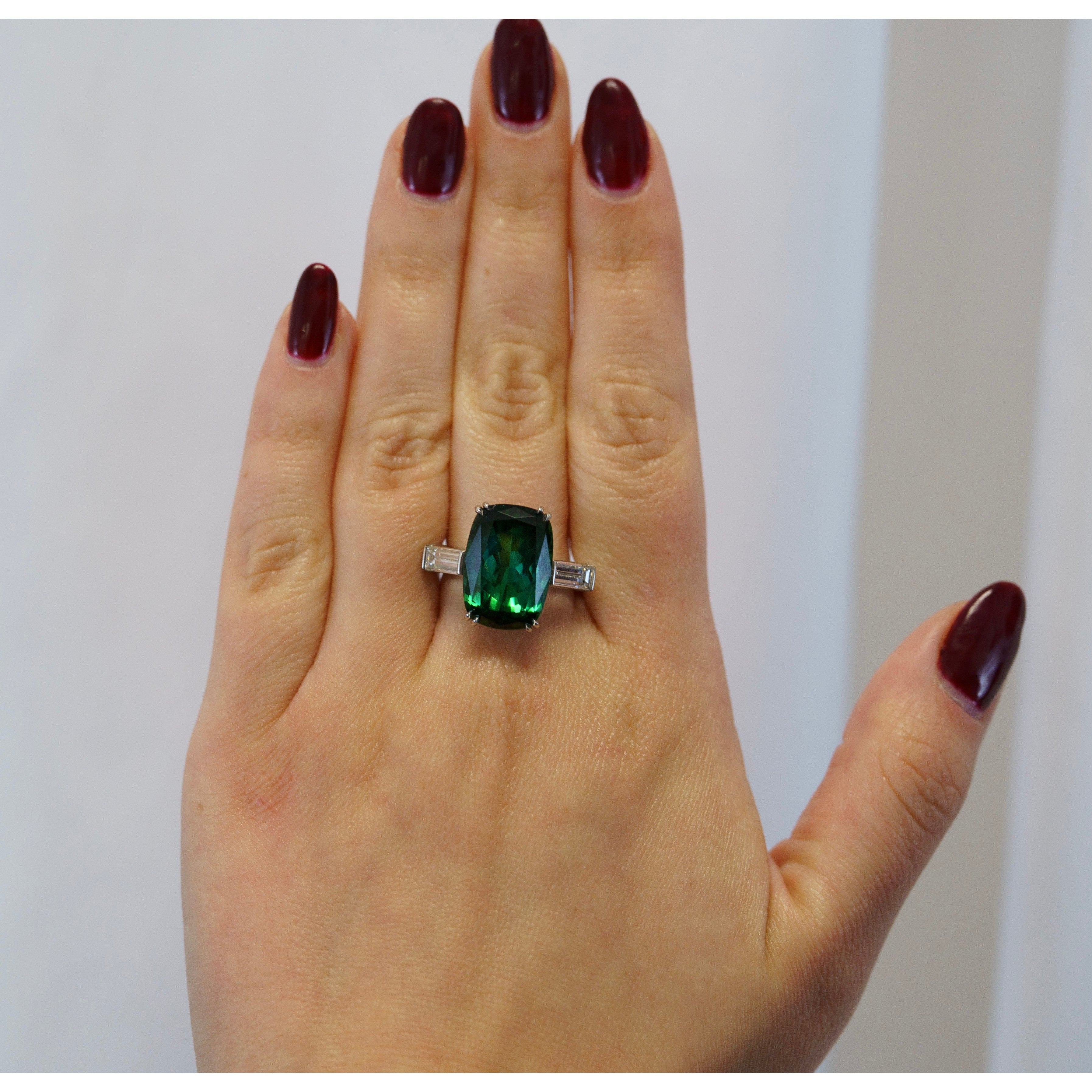 IGI certified 12.68 carat natural green tanzanite set in a platinum 950 vintage ring. This is a cushion cut tanzanite ring with baguette and round diamond accents in prong and bezel settings.