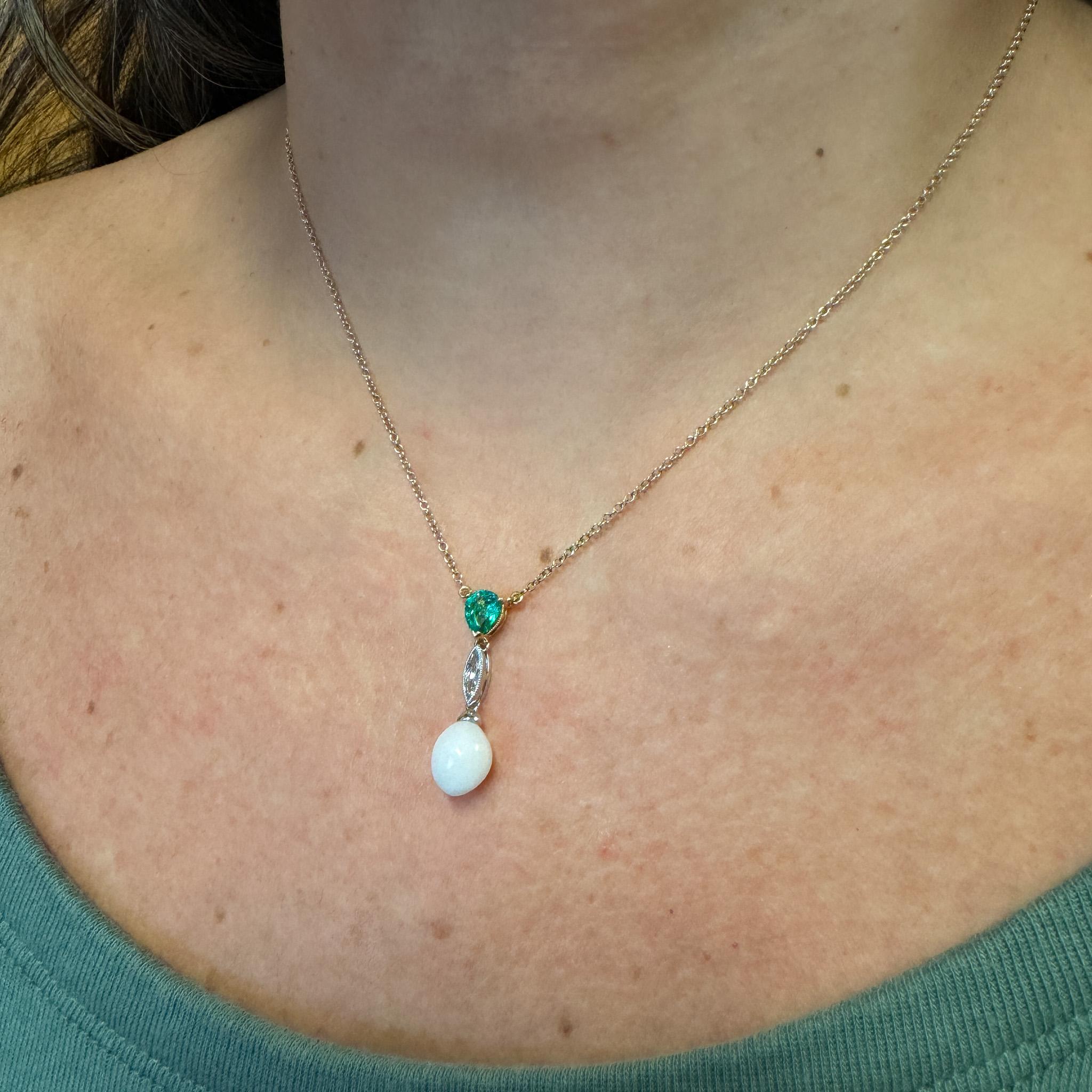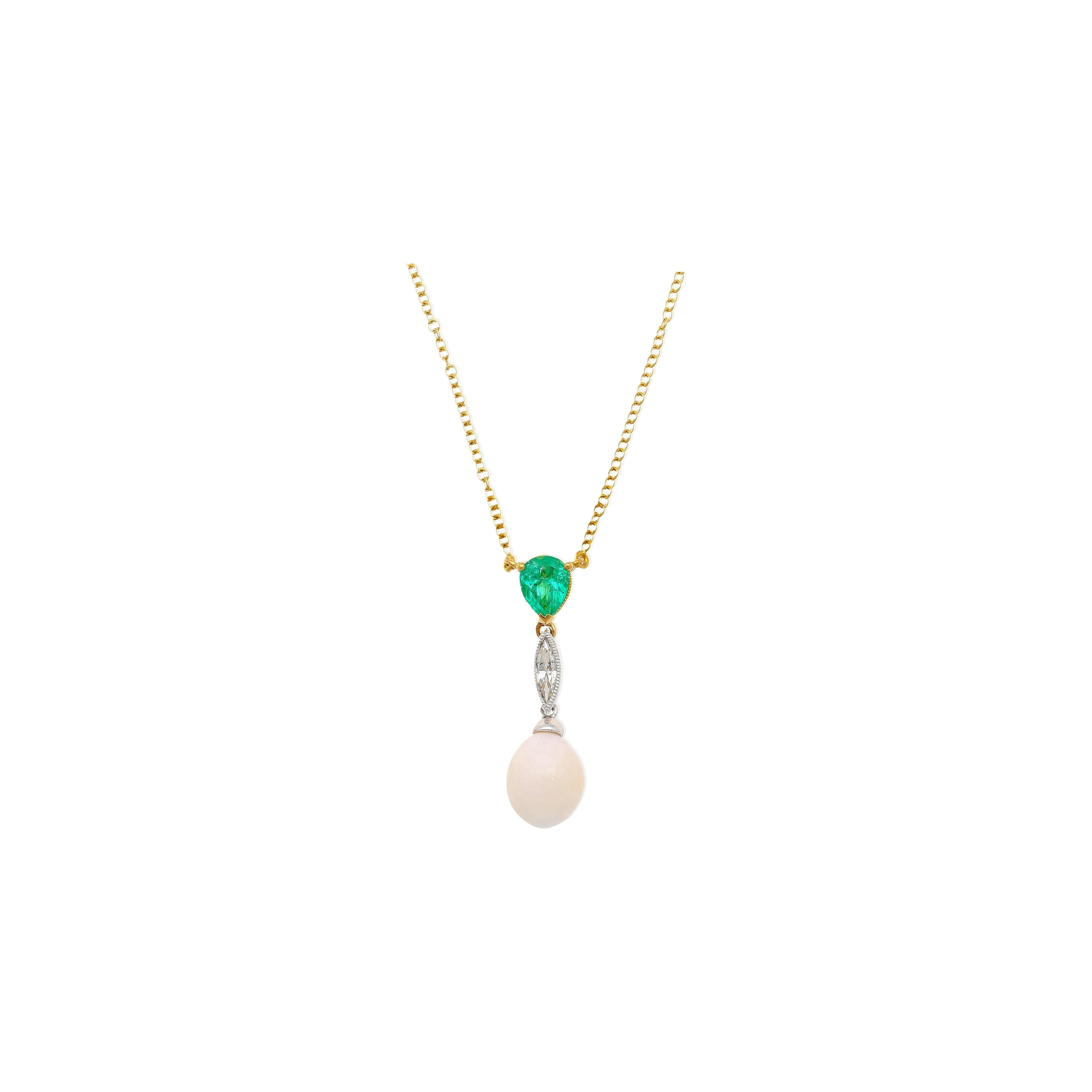 Vintage Natural Saltwater Conch Pearl & Emerald Drop 18K Gold Pendant Necklace