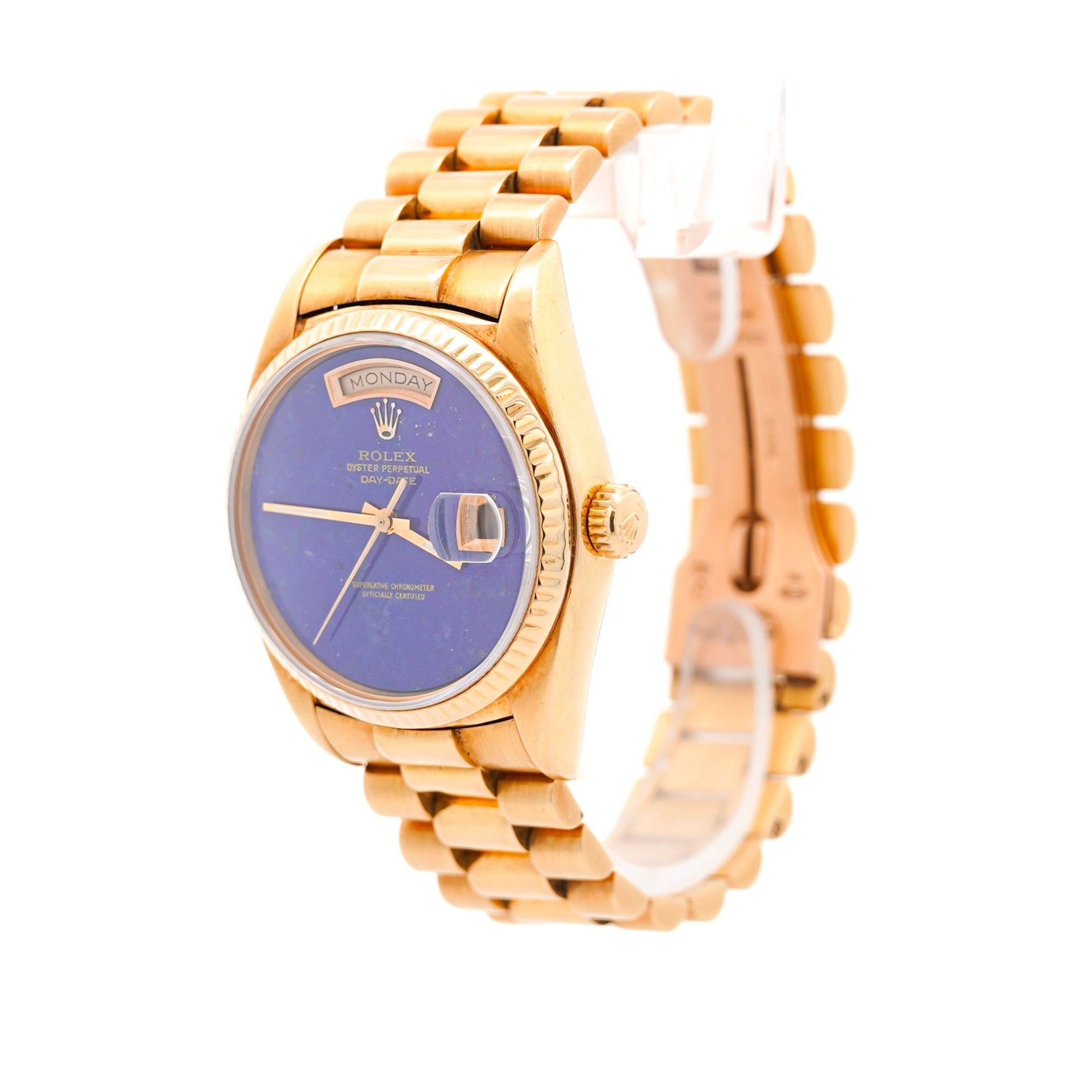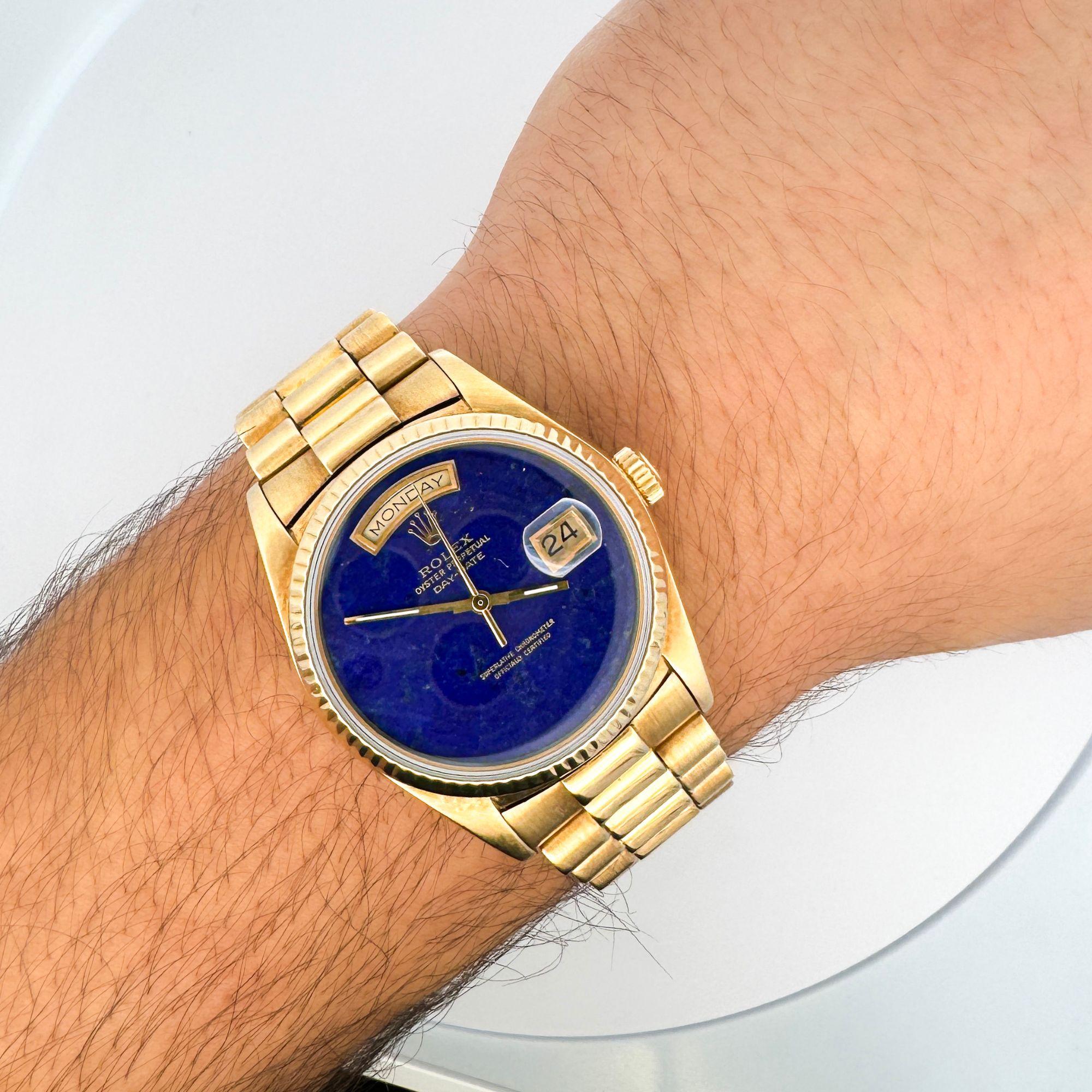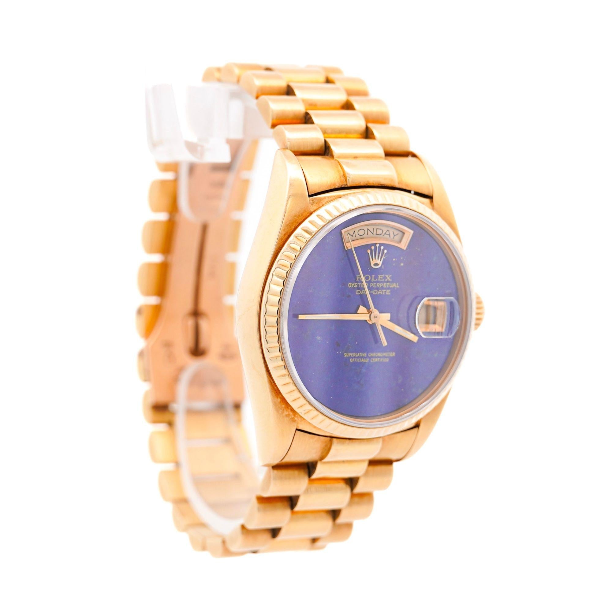 This Rolex President wristwatch is designed for men and features a yellow gold round case with a polished finish, measuring 36mm in size and 20mm lug width. It has a lapis lazuli blue dial with no hour marks, a fluted bezel, and a hidden fold clasp on a yellow gold band. The watch includes features such as a 12-hour dial, date and day indicators, sapphire crystal, scratch resistance, a screwdown crown, and water resistance up to 100 meters (330 feet). It is powered by a Swiss-made mechanical automatic movement with 31 jewels and was manufactured between 1990 and 1999. This luxury timepiece comes with its original box and manual/booklet, a seller warranty, and service records but no papers. Suitable for casual, classic, dress/formal, or luxury styles.