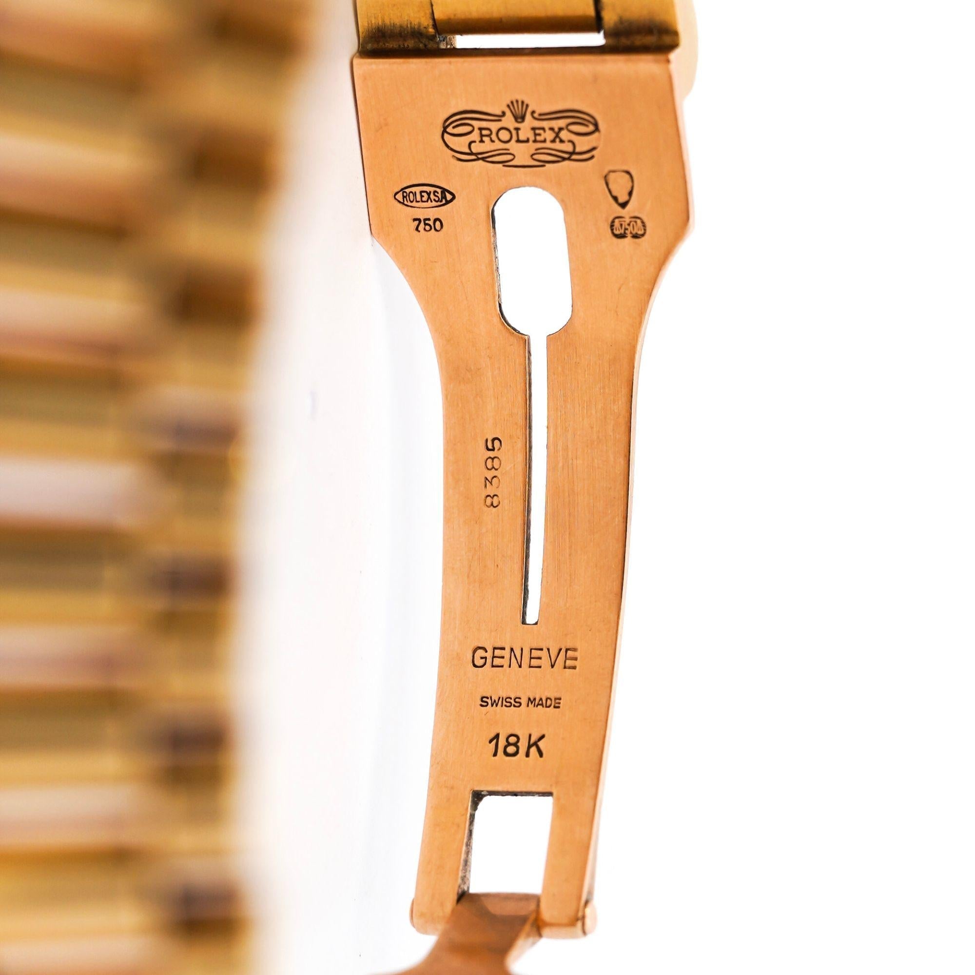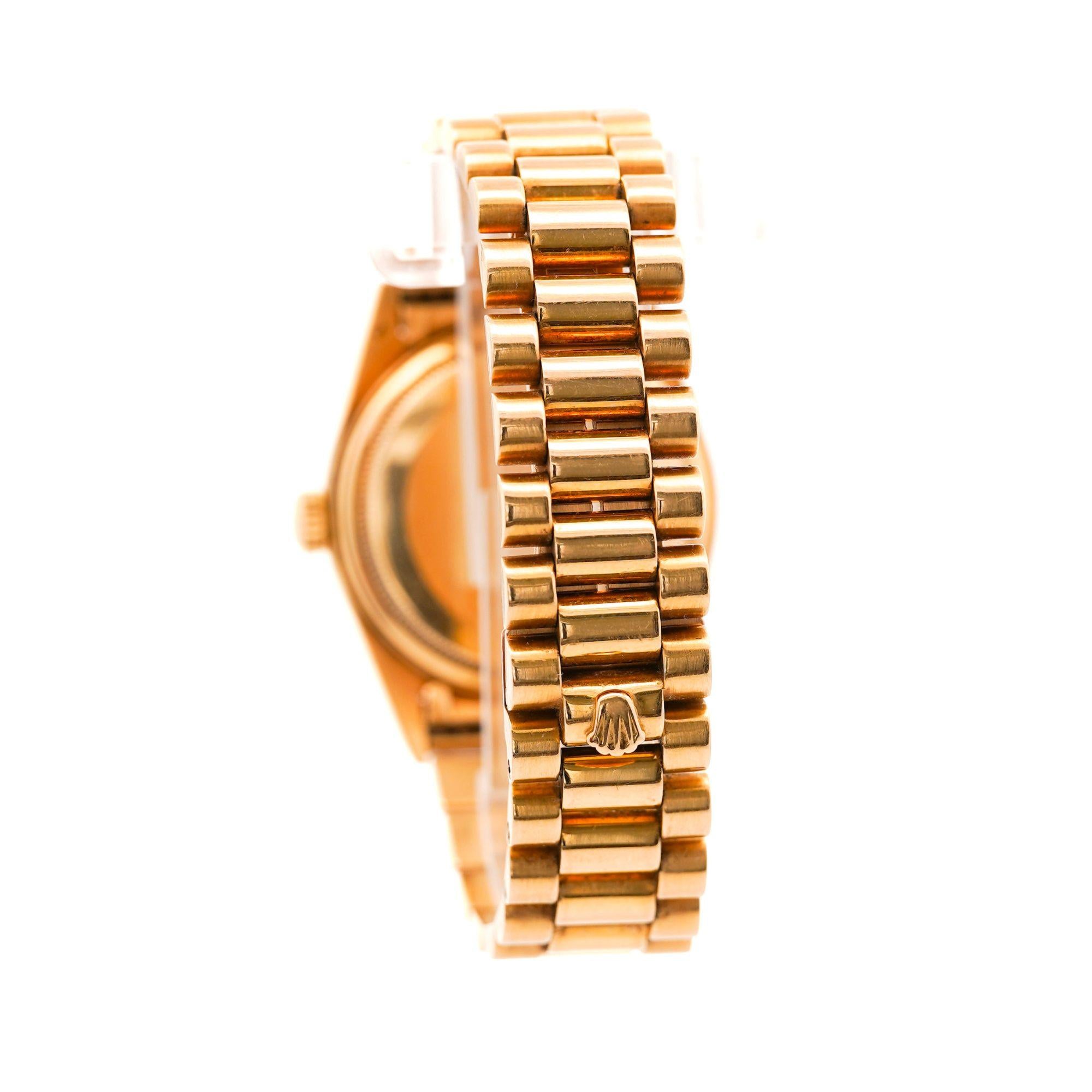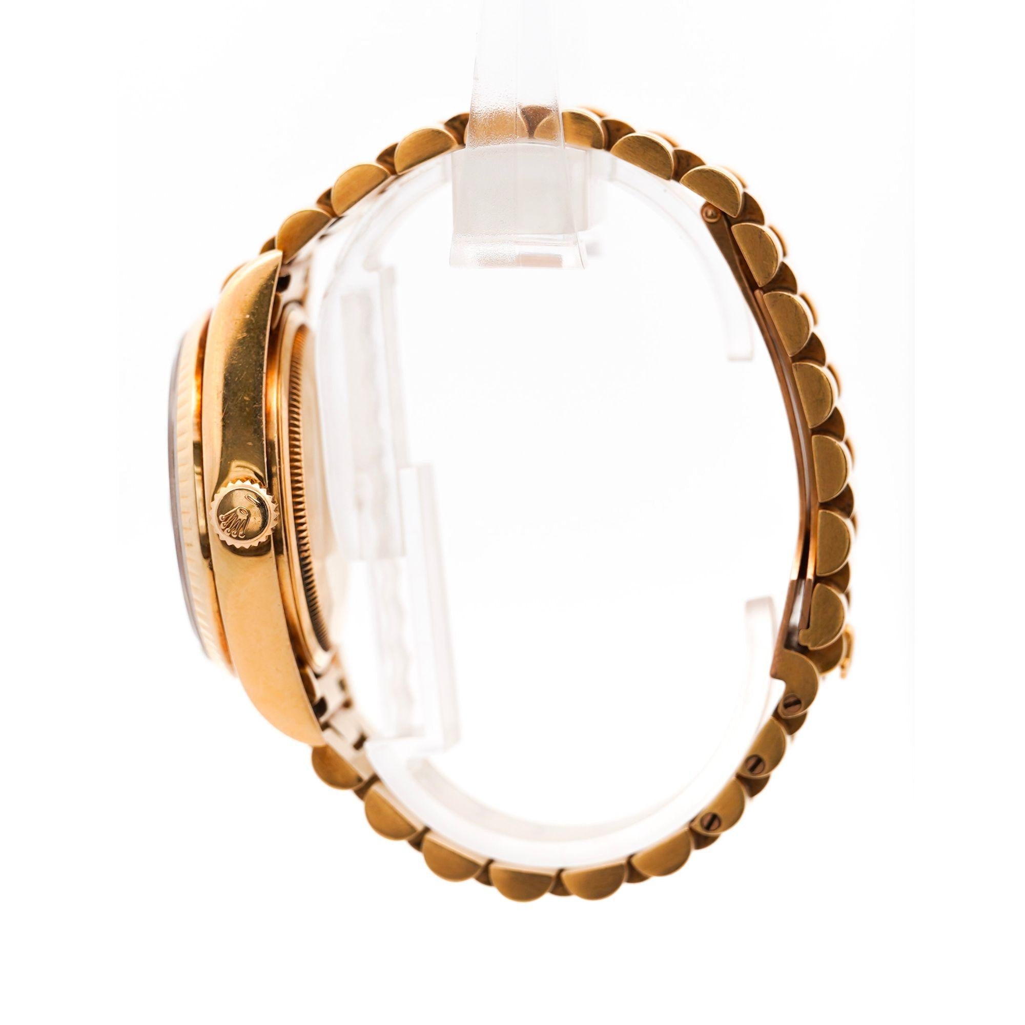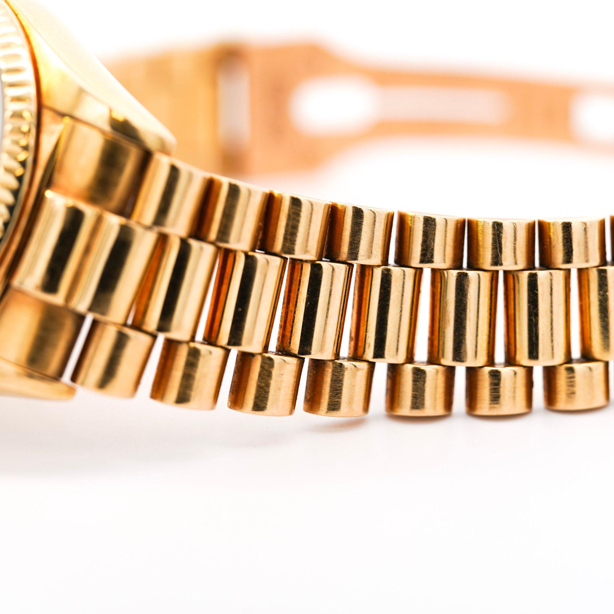 This Rolex President wristwatch is designed for men and features a yellow gold round case with a polished finish, measuring 36mm in size and 20mm lug width. It has a lapis lazuli blue dial with no hour marks, a fluted bezel, and a hidden fold clasp on a yellow gold band. The watch includes features such as a 12-hour dial, date and day indicators, sapphire crystal, scratch resistance, a screwdown crown, and water resistance up to 100 meters (330 feet). It is powered by a Swiss-made mechanical automatic movement with 31 jewels and was manufactured between 1990 and 1999. This luxury timepiece comes with its original box and manual/booklet, a seller warranty, and service records but no papers. Suitable for casual, classic, dress/formal, or luxury styles.