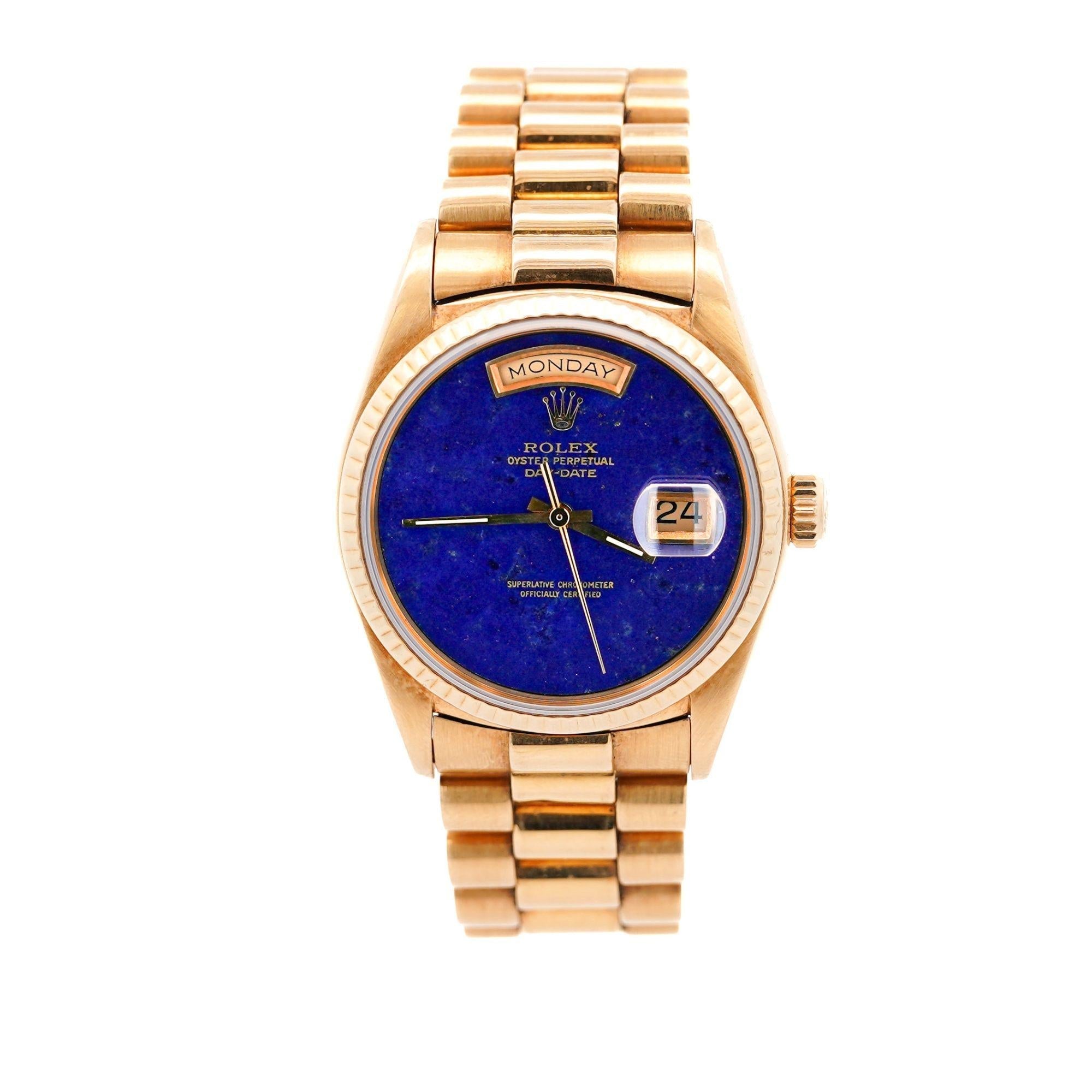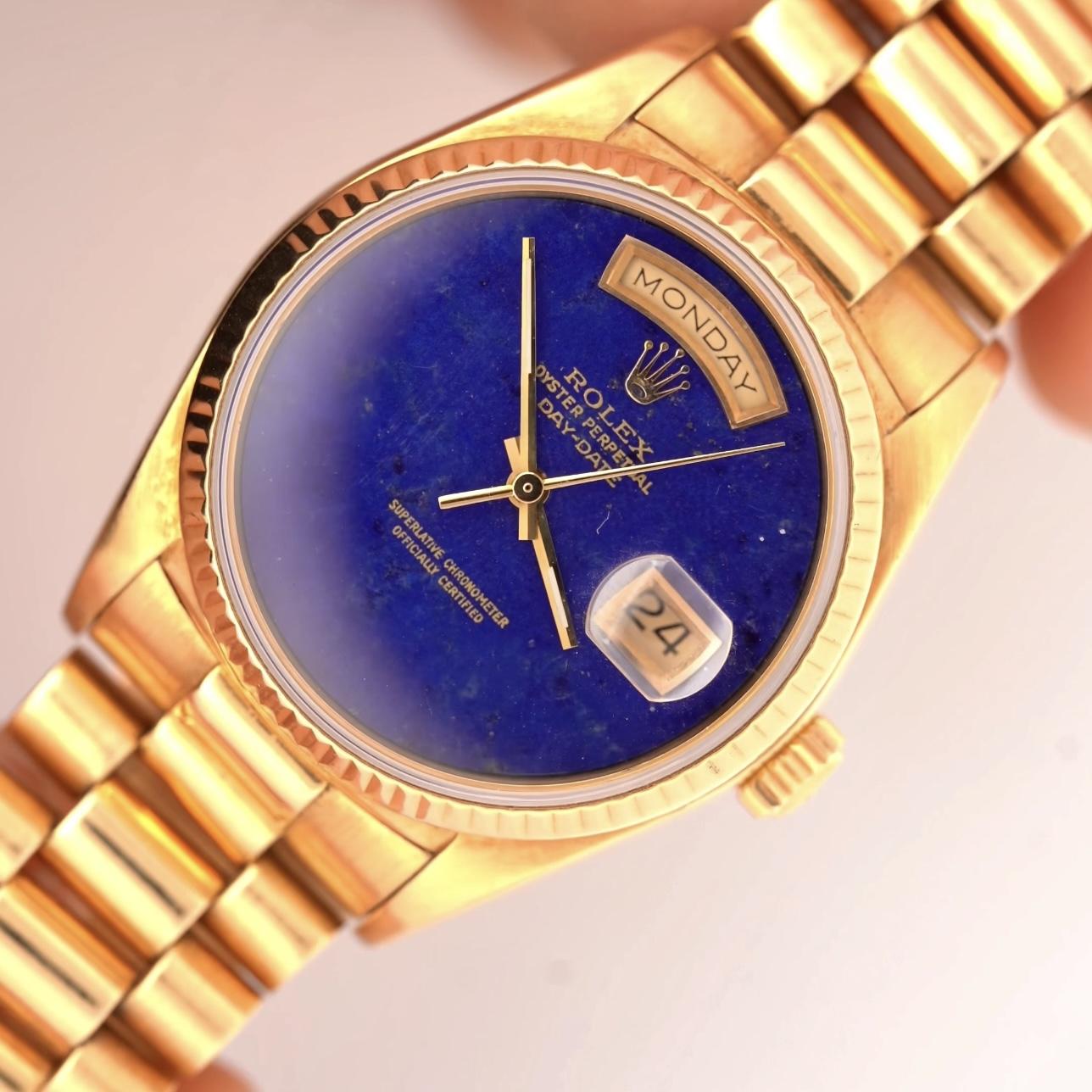 Rare Vintage Rolex 36mm Day-Date Blue Lapis Lazuli Ref. 18038 in 18K Yellow Gold with Fluted Bezel. Includes a vintage Rolex box, not original to this watch.
