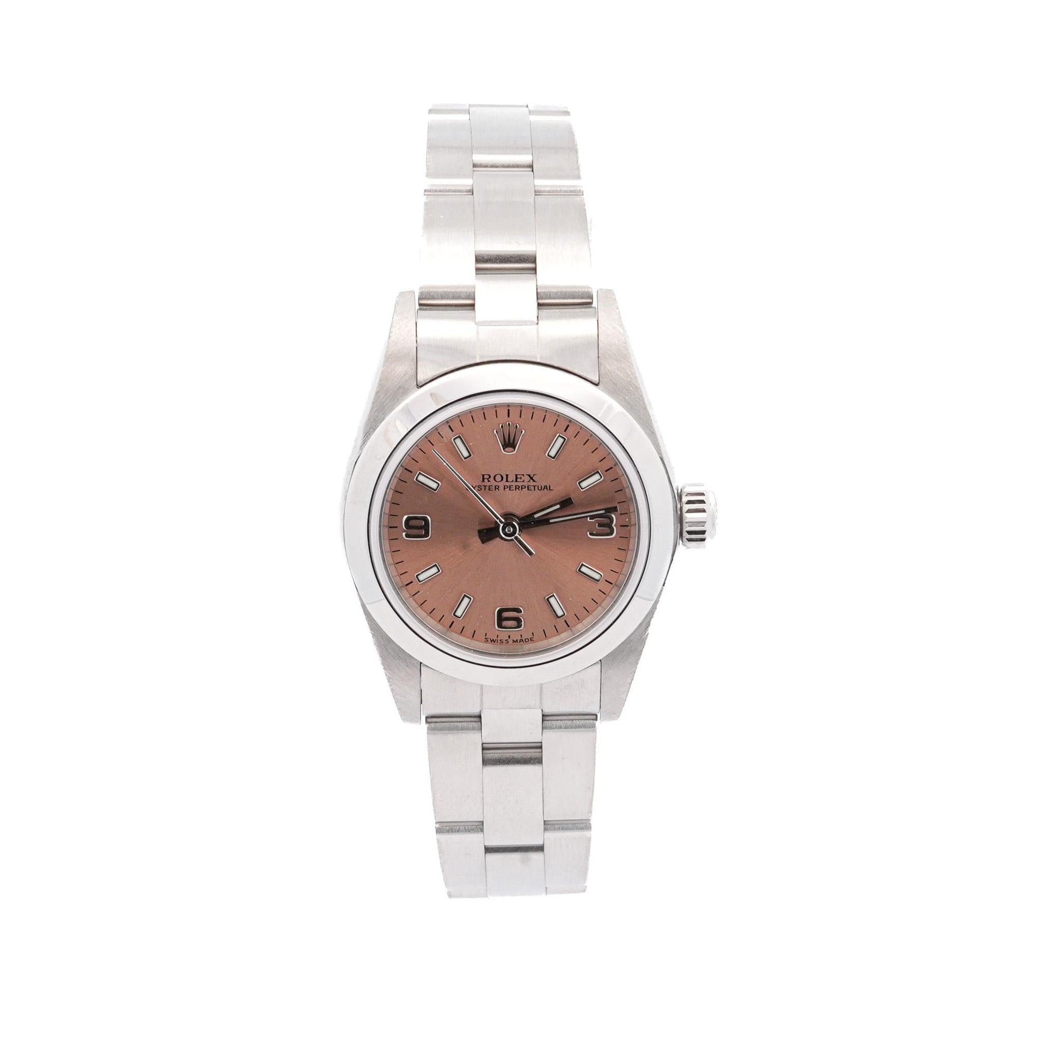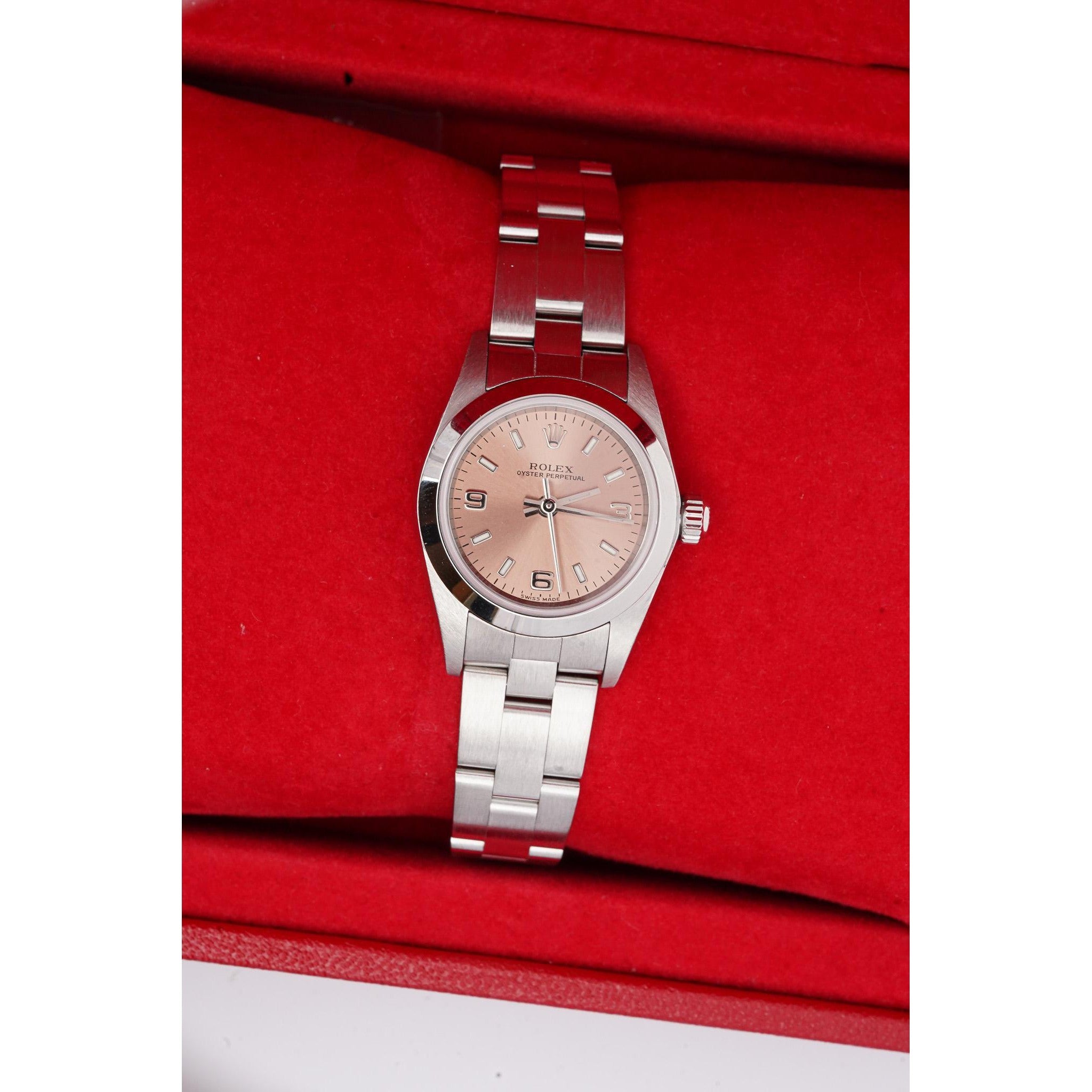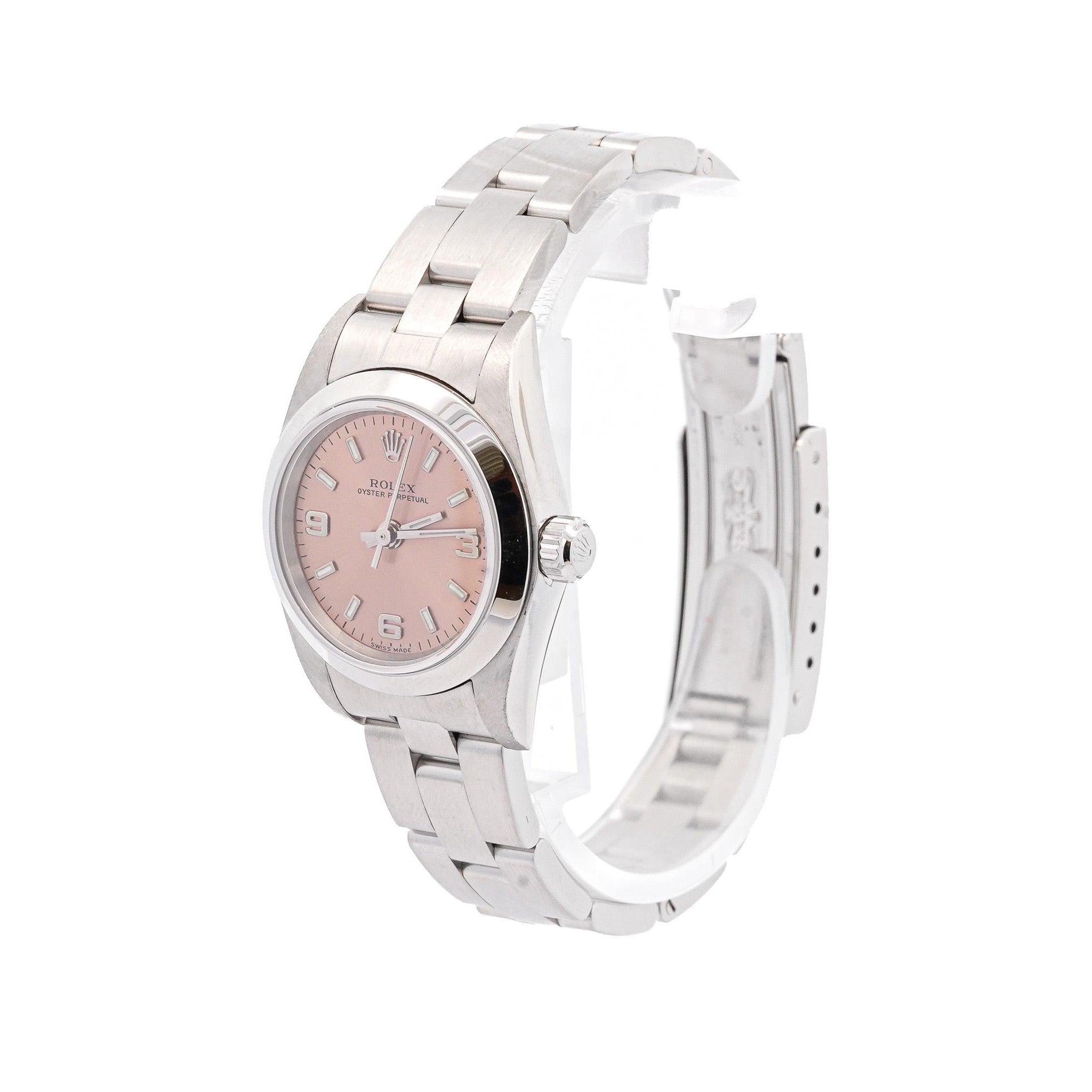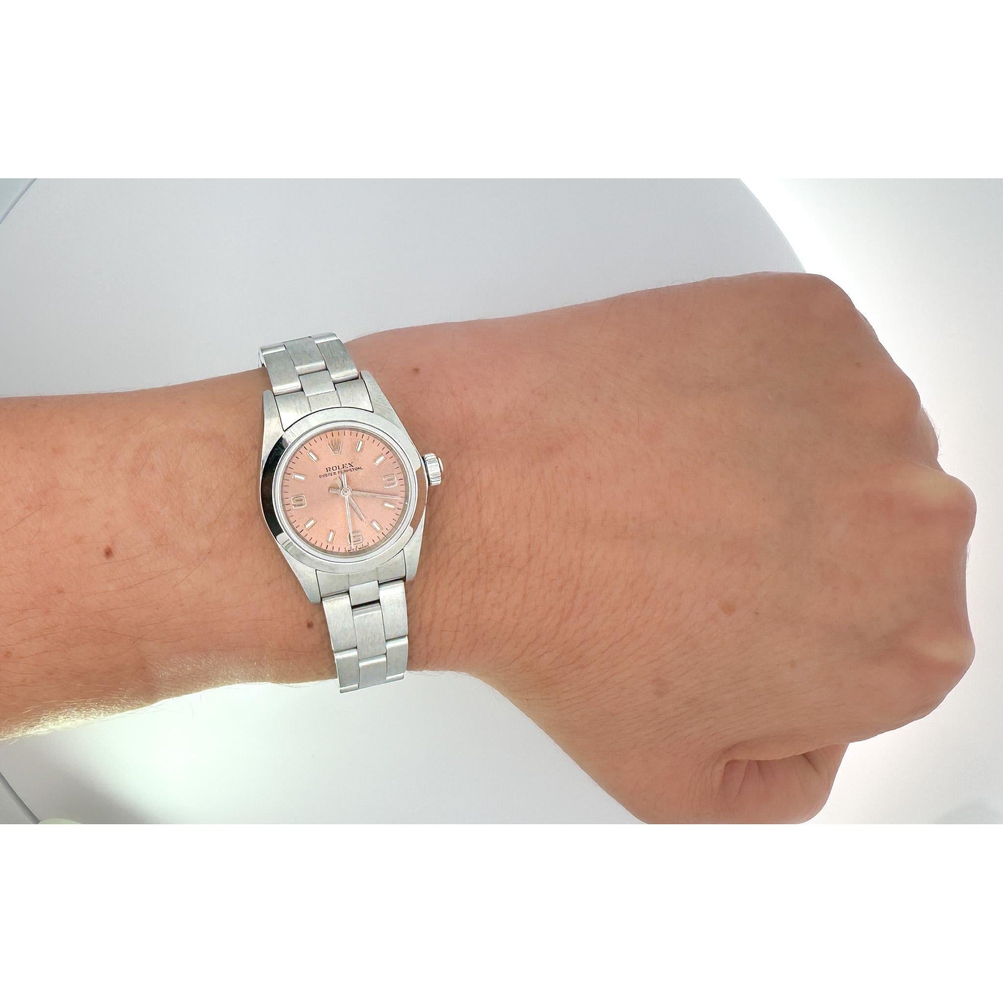 The Rolex Ladies Oyster Perpetual 76080 is a stunning example of Rolex craftsmanship, blending timeless elegance with superior functionality. Vintage dates 1999, this pre-owned beauty is a true testament to Rolex’s legacy of quality and style. Featuring a feminine pink glossy dial and highly legible. Satin and high-polish finishes. The pink dial, adorned with Arabic and luminous baton hour markers, enhances its feminine charm while ensuring legibility. Robust Oyster case and water resistance up to 330 feet.